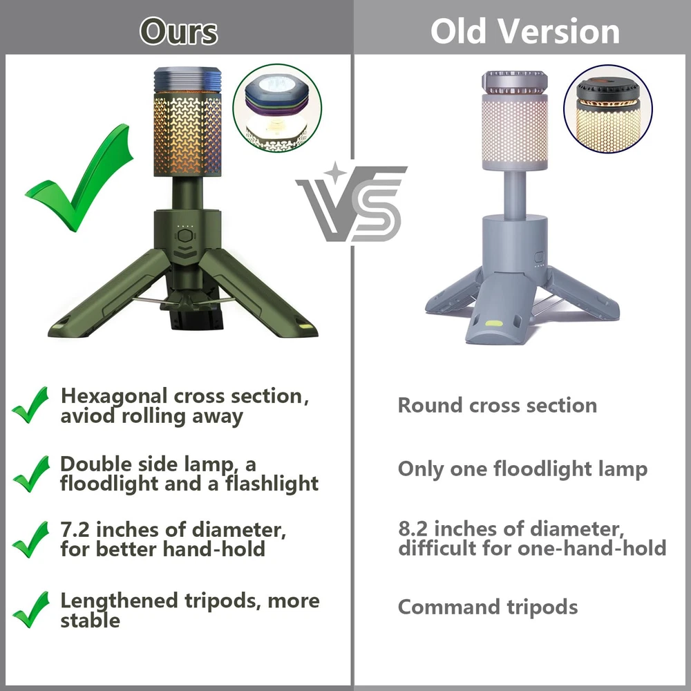 MULTI-FUNCTIONAL: Four-in-one lighting function design, one-click control of various functions, can be used as camping lights, ambience lights, flashlights, SOS warning lights. Three levels of brightness can be adjusted steplessly, the color temperature also can be adjusted steplessly between 1800K-6500K, in addition, the long-distance direct flashlight mode and SOS warning lamp mode can be switched at will NEW DESIGNED LAMP SHADE: With a large Angle lighting design and a lighting Angle is up to 240°, this camping lantern has a much larger lighting range than its competitors, bringing you more safety and convenience. This telescoping camping light features a retractable pole and foldable tripod base, which you can freely adjust as needed. Meanwhile, it uses a regular hexagonal cross-section design, placed on the slope of the ground will not cause trouble due to rolling EMERGENCY POWER BANK: This camping light has a built-in 10500mAh large-capacity rechargeable battery, which can ensure enough lighting time, so that you don't have to worry about the problem of insufficient power in the outdoors. At the same time, this telescopic camping light comes with a Type-C charging port, which can be used as a charging bank to charge your phone, tablet or wireless headphones in an emergency ALL-WEATHER USE: This camping light is designed with a high grade of water resistance and has passed stringent water resistance tests. The waterproof level of the lamp head reaches IPX7, and the waterproof level of the lamp body part reaches IPX5. It works well even in extreme weather environments such as heavy rain and snow. The complimentary ground pin can secure the tripod to the ground and can ensure that the camping lamp will not be blown over by strong winds. Also included are premium waterproof storage bags tailored for camping lights. Escort your wonderful hiking, camping, outdoor adventures and more RAINBOW RUBBER BAND FOR DIY: The complimentary rainbow rubber ring can be used for the personalized decoration of the lamp holder, you can choose your favorite color and style to hand put on the lamp holder (DIY), so that you can get a more distinctive camping lamp EXCELLENT AFTER-SALES SERVICE: We provide 1 year quality guarantee and 7 days 12 hours online customer service for this camping lamp, if you have any questions about the product, please leave a message on our page and we will reply you and give a solution within 12 hours