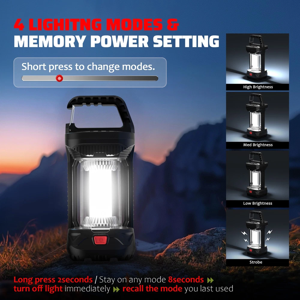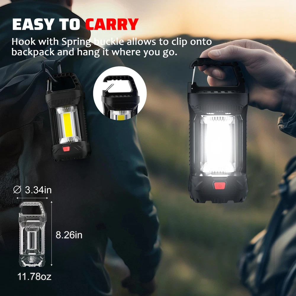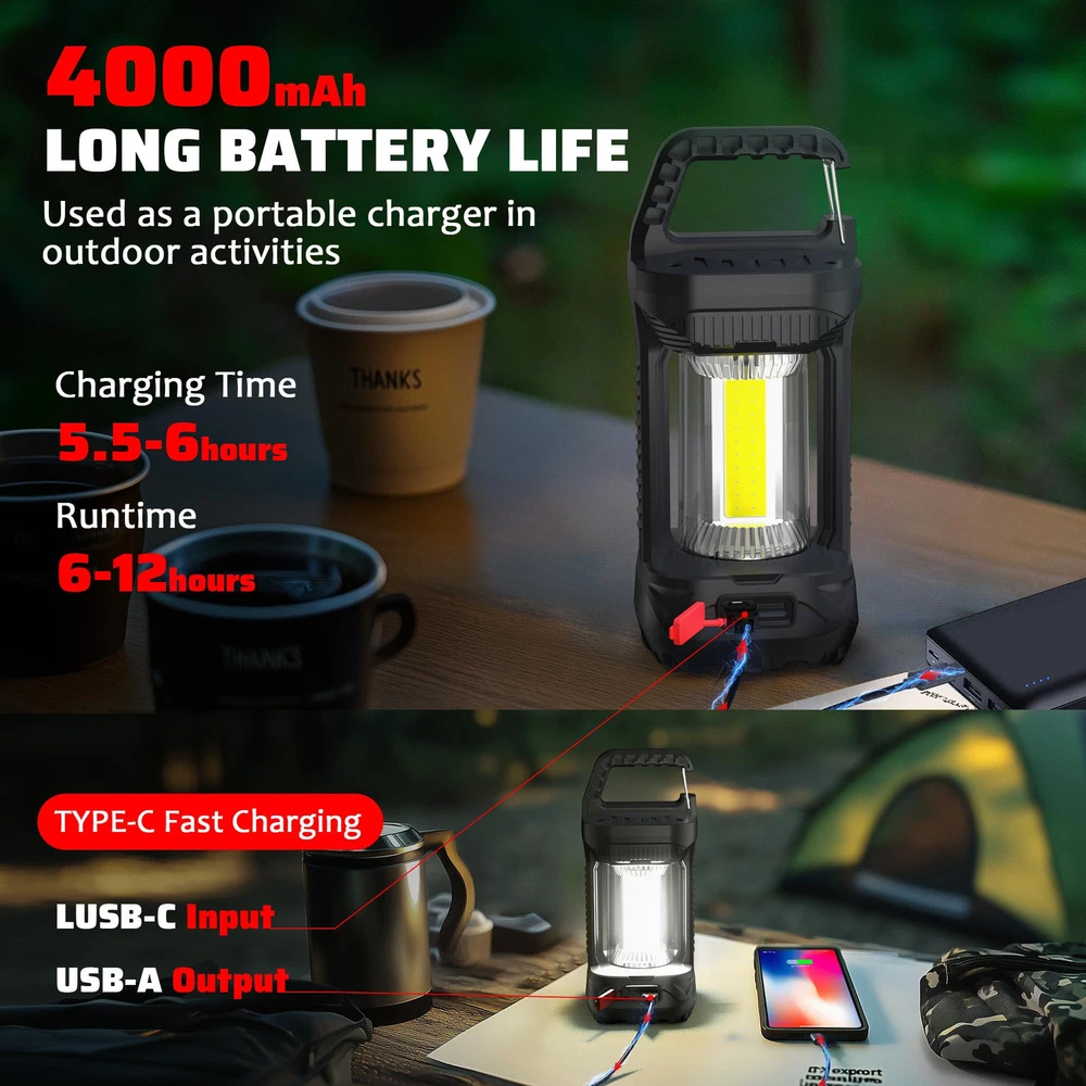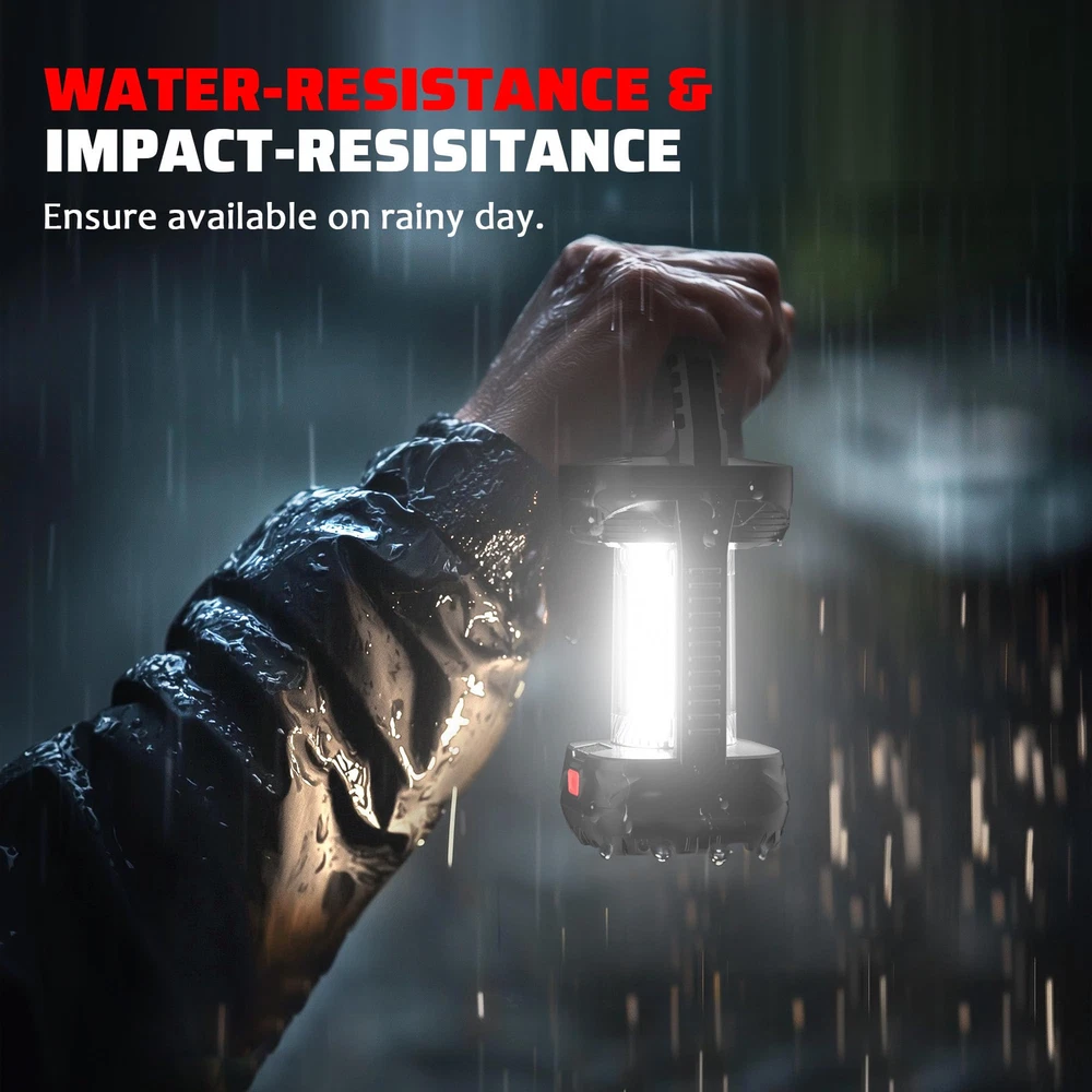 【2000LM High Brightness Camping Lantern】With a 360-degree lighting illumination of up to 2000 lumens, this camping light illuminates the whole space effectively. Fitted with 20 high-brightness LED chips and new COB technical, camping lantern provides you with enough brightness and low energy consumption as well as longevity. The translucent reflector cover allows the portable light to pass through to a maximum, providing sufficient brightness for home power outages, emergencies or outdoor use. 【4000mAh-Long Battery Life】The energy-efficient camping lamp consumes little energy, making the power supply to last a long time. With powerful 4000mAh lithium battery, this LED camping lantern can provide 6-12 hours of illumination when fully charged. Power indicator design is convenient for you to check the remaining battery power. It is perfect for power outage, earthquake, camping, survival kit and other outdoor and indoor purposes. 【Type-c Fast Charging & Phone Charger】Rechargeable camping lantern can be fully charged in 6 hours via the Type-C port. You can charge it fully fast and then use it as needed. Support USB cable (included) and 5V DC charger adapter (not included). The power outage camping light can also serve as a 4000mAh portable phone charger for smartphone or mobile devices in emergency through the output port. Battery indicator(25%,50%,75%,100%) can remind you of remaining power at any time. Not only as camping lantern, but also the overhead lamp for hanging in a tent or dark basement, handheld flashlight, or an LED lantern to use when telling stories. 【4 Lighting Modes】This versatile emergency light comes with 4 light modes. Simply short press the button to switch light modes (COB high mode, COB med mode, COB low mode, COB strobe). Choose the high brightness, illuminating your entire campsite with ease. Switch to low brightness to create a more subdued ambiance or conserve battery life during extended trips. The Strobe mode can be attention-grabbing when in danger. (Stay on any mode for 8 seconds or long press the button and then turn it off, it will recall the mode which you last used.) 【Anti-slip Handle & Tripod Mountable】 This rechargeable LED lantern features a slip-proof handle for easy hanging and universal 1/4” female thread, providing a hand-release light source. Buckle on the handle can be easily attached to backpack, tent, hook ring, rope, thin branches, camping gear and so on when camping, hiking or other outdoor activities. With portable handle to be hung above your head, allowing direct down light for reading. You can also mounting the outdoor camping lights onto standard tripod when in job site or auto-repairing. This LED flashlight is a good companion to help light up your patio or backyard during winters! 【Water Resistant & Durable】Crafted with anti-slip ABS materials and shockproof materials, our waterproof flashlight lantern is of high strength to withstand rainy weather and outdoor challenges. You can easily carry it with you for your camping or hiking trips. Similarly, this makes it a necessary Survival Equipment for outdoor activities, great kit for camping, hiking, hunting or night walking. A perfect emergency lights for home power failure in the Hurricanes, Storms. 【Convenient and Portable】Measuring 8.26*3.34*3.34 inch, 11.78oz only, our hurricane camping lantern is easy to carry. It is easy to store in a backpack, carry-on bag, large pocket, toolbox, or the safety kit in the trunk of your car. The extremely lightweight design also fit for young child, everyone can have a reliable camping light to access when needed.