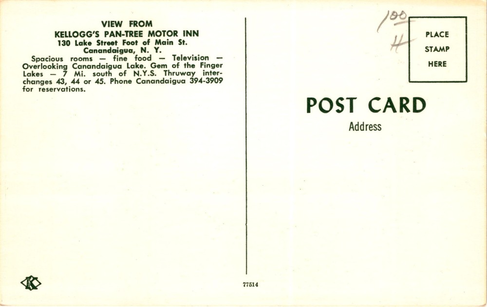 The postcard advertises the Kellogg's Pan-Tree Motor Inn in Canandaigua, New York, located at 130 Lake Street at the foot of Main Street. The inn boasts spacious rooms, fine food, and television for guests. It overlooks Canandaigua Lake, which is described as the gem of the Finger Lakes region.