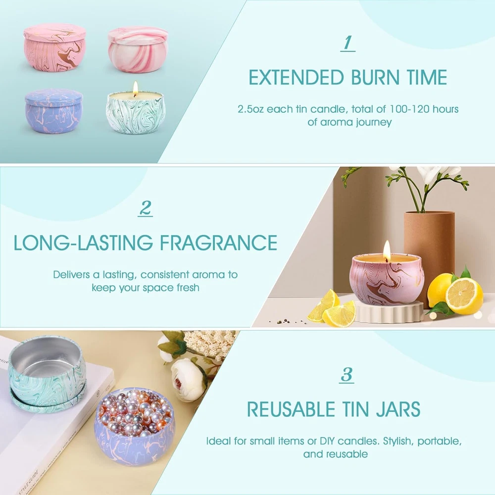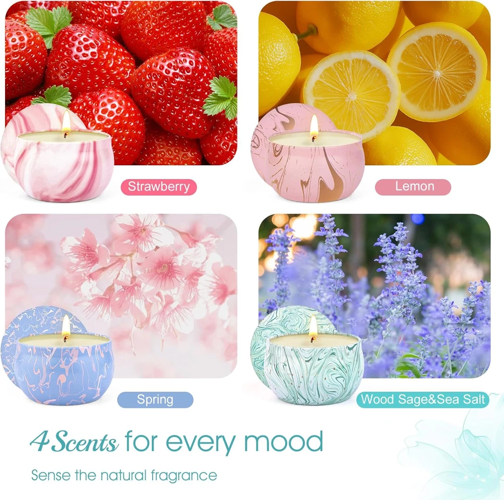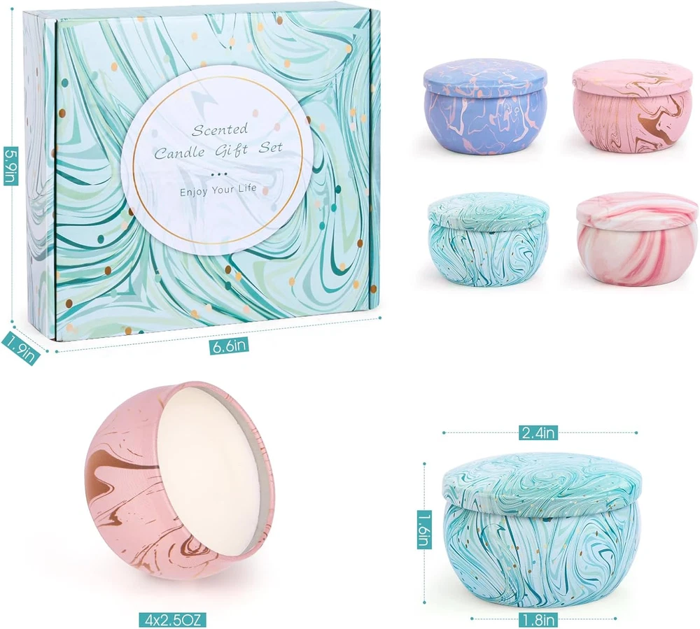 gtin13: 744110833171 Product Dimensions: 3.9"W x 3.9"H Seasons: All Season Type: Does not apply Occasion: Anniversary, Birthday Color: Marble Number of Items: 2 Item Dimensions W x H: 3.9"W x 3.9"H Theme: Aromatherapy Scent Name: Wood Sage&Sea Salt, Lemon, Spring, Strawberry Embellishment Feature: Marble Pattern: Marble Country of Origin: China Item model number: 4 candle new Item Weight: 14.07 ounces Size: Set of 4 UPC: 744110833171 Material Type Free: paraffin, beeswax, palm wax, others Candle Type: Container Candle Are Batteries Included: No Container Type: Can Indoor/Outdoor Usage: Indoor Additional Features: gift basket, candles, gifts for women Item Shape: Round Brand: Does not apply Shape: Round Batteries are Included: No Specific Uses For Product: Home Fragrance Container Material: Glass Material Type: Soy Wax Unit Count: 8.8 Ounce Indoor Outdoor Usage: Indoor Style Name: Classic Wick Quantity: 1 Model Name: 4 candles Scent: Wood Sage&Sea Salt, Lemon, Spring, Strawberry