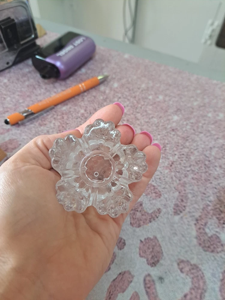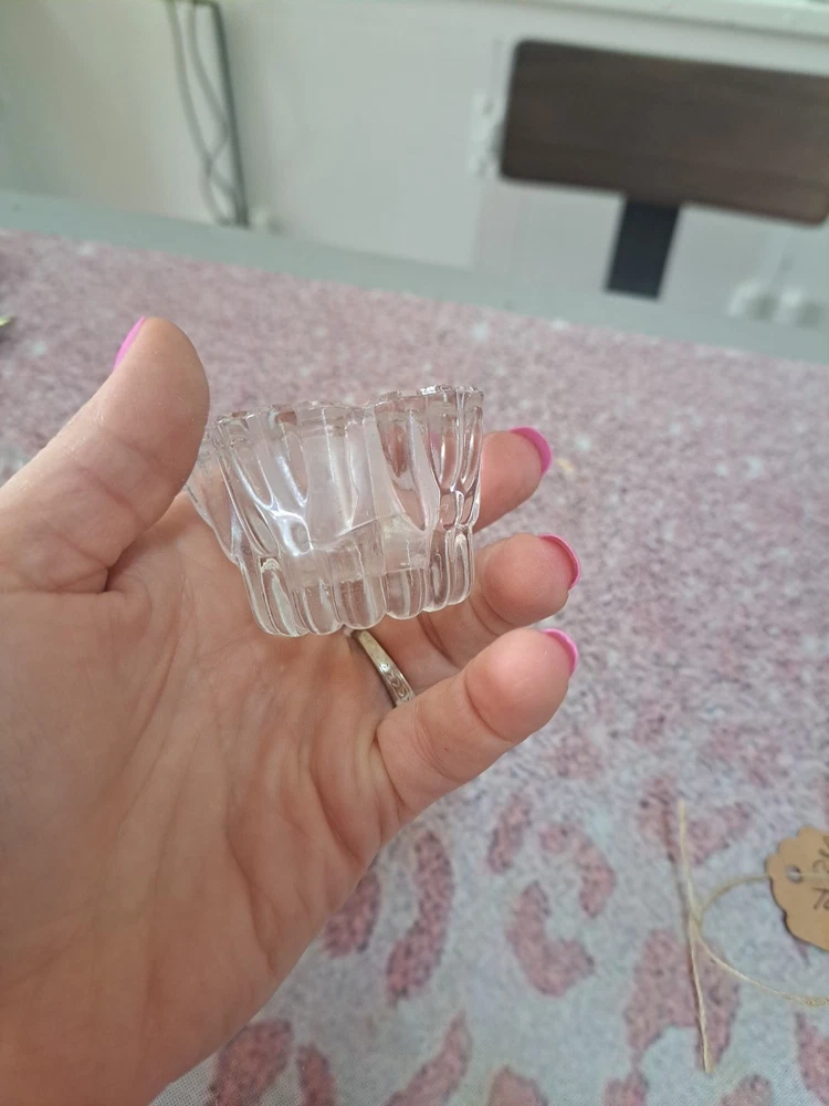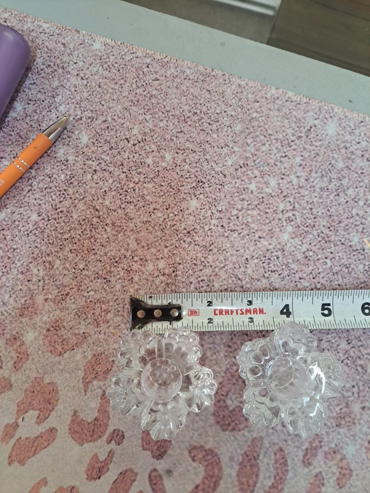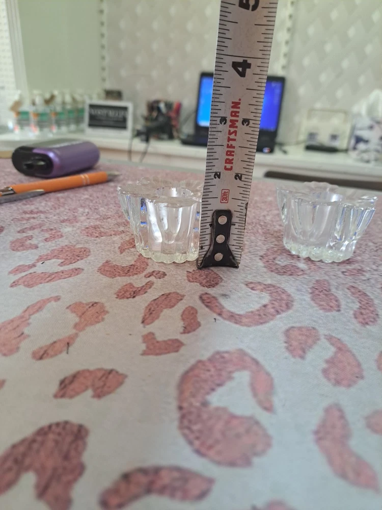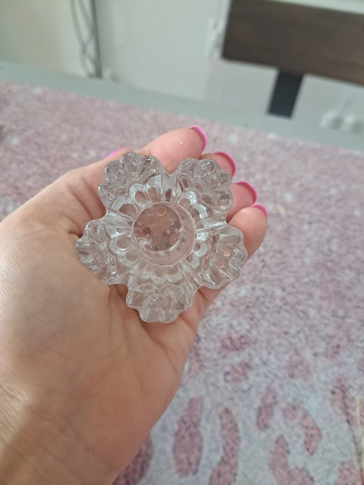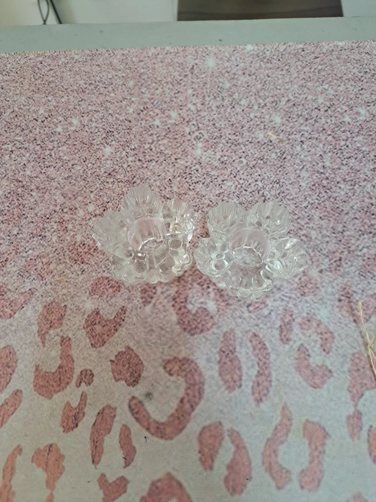 This set of two clear glass candlestick holders features a flower shape that is perfect for taper candles. The holders are small in size, measuring 2 inches in length, 2.5 inches in width, and 2 inches in height. They are suitable for indoor use, making them ideal for various rooms such as the bedroom, living room, dining room, or bathroom. The candlestick holders have a shiny finish and are part of the romantic-themed collection by the brand Crystal, manufactured in the 21st century in the United States using hand-blown glass production technique. They make a charming addition to any space and are easy to care for by cleaning with a damp cloth.