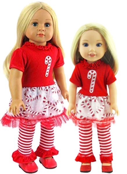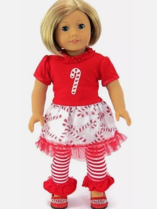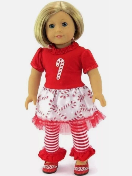 "Candy Cane” Tutu Dress, Leggings & Red Shoes Designed to fit 18-Inch Dolls Do you hear those sleigh bells ringing? Get the hot coco ready! Candy Cane Tutu Holiday Outfit. What girl would not fall in love with this one? About this Item: ♥ Welcome the holidays with this festive Candy Cane Tutu Dress. The Top half of the dress is a smooth short sleeve tee-shirt like with a large candy cane; skirt portion of the dress is tulle fabric with candy canes abound. Outfit comes with striped leggings with red ruffle at bottom and red shoes. There is something about dolls clothing that captures our heart, be ready for the holidays in this festive outfit. Your doll will look stylish and trendy in this high-quality accessory. Our clothing has beautiful fabrics with soft self-closure. The set is compatible with 18-inch soft body dolls by major manufacturers and is part of the JustAskJoyce Collections product line. Perfect for American Girl Dolls & Other Similarly Sized Dolls, this holiday outfit set is sure to make your doll stand out in any collection. The set is not only stylish but also comfortable, with a perfect fit for your doll's size. Don't miss out on this amazing opportunity to add a beautiful holiday outfit set to your doll's collection. ♥ Product Description: Our Christmas inspired Christmas Candy Cane Outfit is d esigned to seamlessly fit 18” American Girl Dolls & Other Similarly Size dolls from the JustAskJoyce Collection, compatible with but is not sold by American Girl dolls. Our clothing is easy to dress up your , this collection promises endless dress-up fun. ♥ Exquisite Craftsmanship: Our focus is on the details, unique designs, quality materials, precise sewing - all to provide a superior dressing-up experience for your beloved dolls. ♥ Handmade: This handmade outfit is skillfully designed to transform your favorite doll. Our doll clothes provide years of wear and play, without having to worry! We use self-sticking loop closures in the back to make it easy to dress your doll. We guarantee your doll will always look their best! Custom-made to fit American Girl dolls. ♥ Imaginative Play & Gift Idea: Encourage imaginative play and creativity with this beautiful Holiday Inspired set. It's an ideal gift for children who love dolls and fashion. Let their dolls showcase their unique style with this trendy holiday clothing. Please note that the doll is not included. Check out our shoes to complete your outfit. ♥ Customer Experience: Your buying experience is at the heart of our business, and we are dedicated to your complete satisfaction. All doll accessories are backed by a 100% money back guarantee. If you are unsatisfied in any way with this product, we will refund your money, no questions asked. ♥ Overall: These are a must-have for any doll that love to dress up for the Holiday Season. All doll clothing is backed by a 100% money back guarantee. If you are unsatisfied in any way with this product, we will refund your money, no questions asked. We care about your buying experience and are committed to your complete satisfaction. If you have any questions or suggestions, please feel free to contact us. ♥ There is something about dolls that captures our heart. Even more so, there is something about dressing them up that is absolutely special. Our store “This N That Doll Clothes” we use a variety of unique manufacturers including our own Just Ask Joyce Collections. Our goal is to make your search for doll clothing and footwear ranging from 14-18 Inches in size doll clothes & accessories simple. We also make it easy to dress up dolls any way you like. This is done by allowing you to shop for accessories and clothing individually, or by complete outfit. We carry hundreds of items compatible with American Girl Dolls & Other Similarly Sized Dolls, Wellie Wisher Dolls & Other Similarly Sized Dolls, and Bitty Baby. Thanks for shopping at my store. Joyce