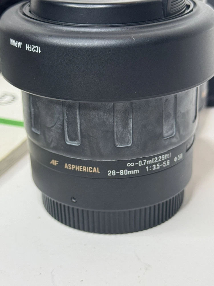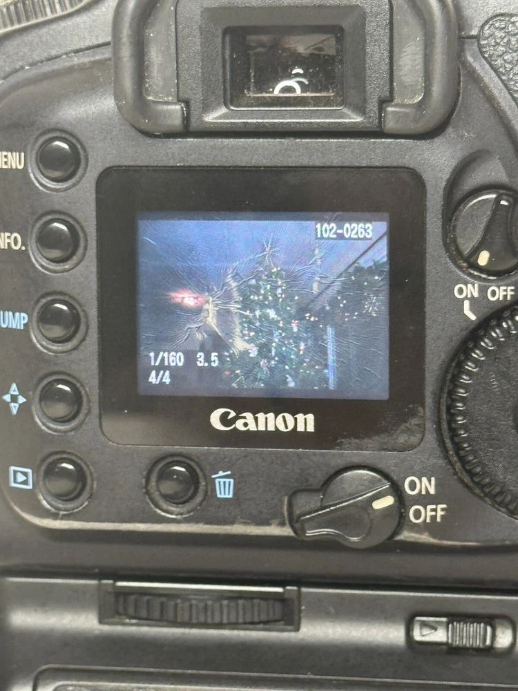 Canon eos D10 DSLR camera. Comes with the manual. A dual charger and a single chatger. There is a Canon battery grip attached which holds two batteries. It also has a Genuine Canon DS8111 AC Power Adapter w/ DC Coupler DR-400. This will allow you to run the camera directly off an electric outlet. There are four lenses Celestron 25mm SMA 1-1/4” Wide angle model 93007-A, Tamron Aspherical 28-80mm, Canon 35-80mm, and a Canon efs18-55mm. There also are five batteries. The only issues with the camera is the original battery door isn’t there. It can’t be when using the battery pack. Also the LCD screen on the back is cracked. The damage is shown in the pictures. You can still see the picture that was taken.