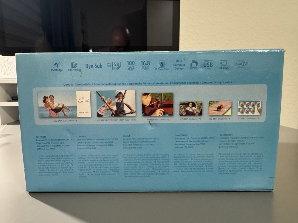 Zum Verkauf steht ein kompakter Fotodrucker Canon SELPHY CP510. Das Gerät ist nagelneu und noch originalverpackt (OVP). Der Karton wurde nie geöffnet, alle Siegel sind intakt – ideal für Sammler oder Liebhaber von hochwertigem Fotodruck. Mit dem SELPHY CP510 lassen sich Fotos in Laborqualität direkt von der Kamera (via PictBridge) oder vom PC drucken. Die Thermosublimations-Technologie sorgt für brillante Farben und eine Schutzschicht gegen Fingerabdrücke und Spritzer. Highlights: • Zustand: Neu & OVP (versiegelt). Nie benutzt. • Druckqualität: 300 dpi für feinste Abstufungen, Postkartenformat in ca. 58 Sek. • Einfachheit: Direktdruck von allen PictBridge-kompatiblen Kameras. • Design: Sehr kompakt und platzsparend. • Besonderheit: Das Gerät stammt aus einem tierfreien Nichtraucherhaushalt. Lieferumfang (original im versiegelten Karton): SELPHY CP510 Drucker, Papierkassette (Postkartengröße), Kompakt-Netzadapter CA-CP200, Reinigungsset, Software-CD. Produktdetails • Marke: Canon • Modell: SELPHY CP510 • Technik: Dye-Sublimation (Thermosublimation) • Anschlüsse: USB (integriertes Kabel), PictBridge Versand & Abwicklung • Sicherer Versand im zusätzlichen Umkarton. • Privatverkauf: Keine Garantie, Gewährleistung oder Rücknahme.