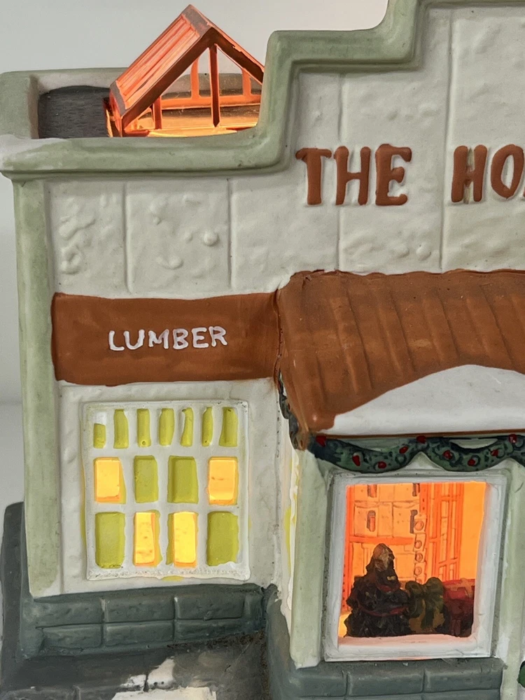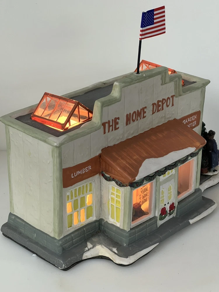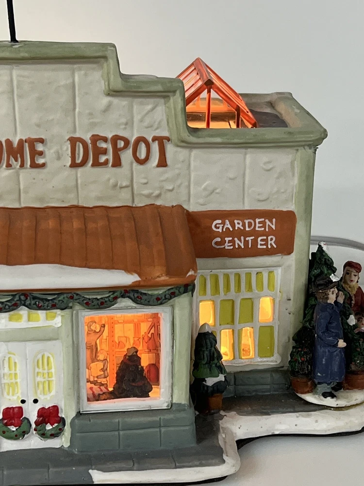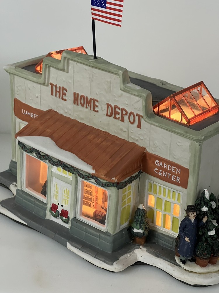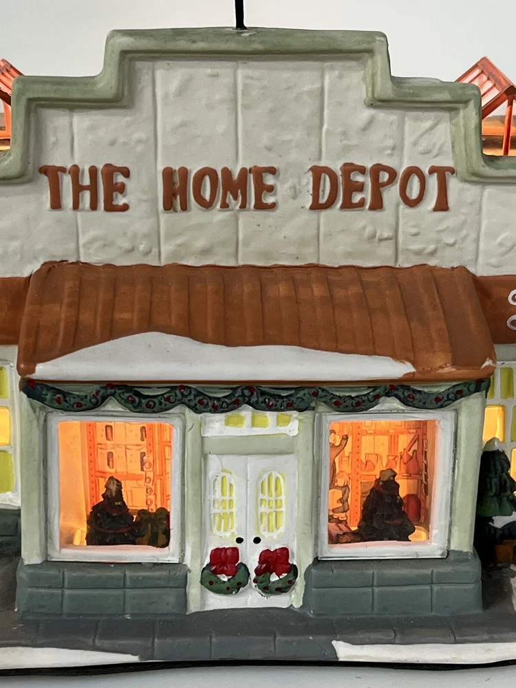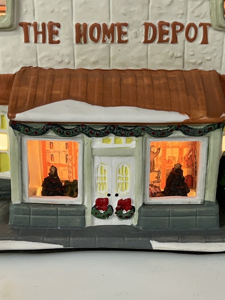 This Home Accents Christmas Village House depicts "The Home Depot Store" with a whimsical design. Made of porcelain, it features an illuminated 3D effect, suitable for seasonal display. The medium-sized house measures 10" in length, 7" in height, and 5 3/4" in width. Part of the limited edition "The Home Depot Store" collection from 2012, it is a festive addition to any room during the holiday season. No original box , comes with cord & light