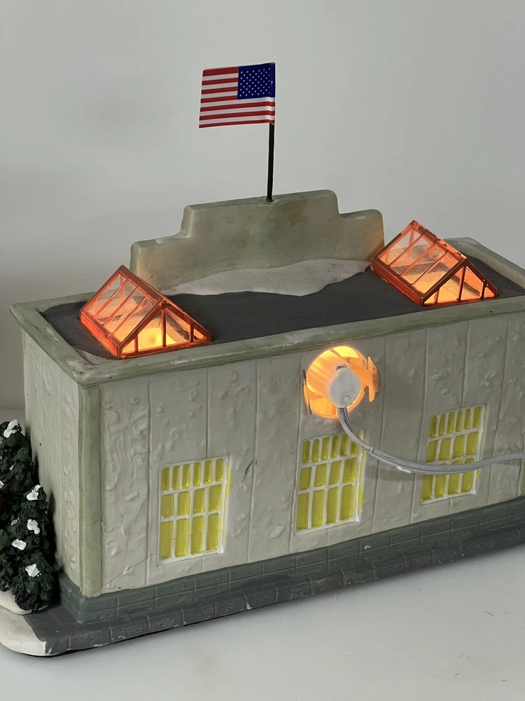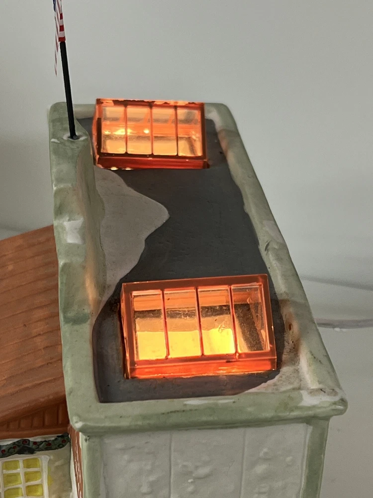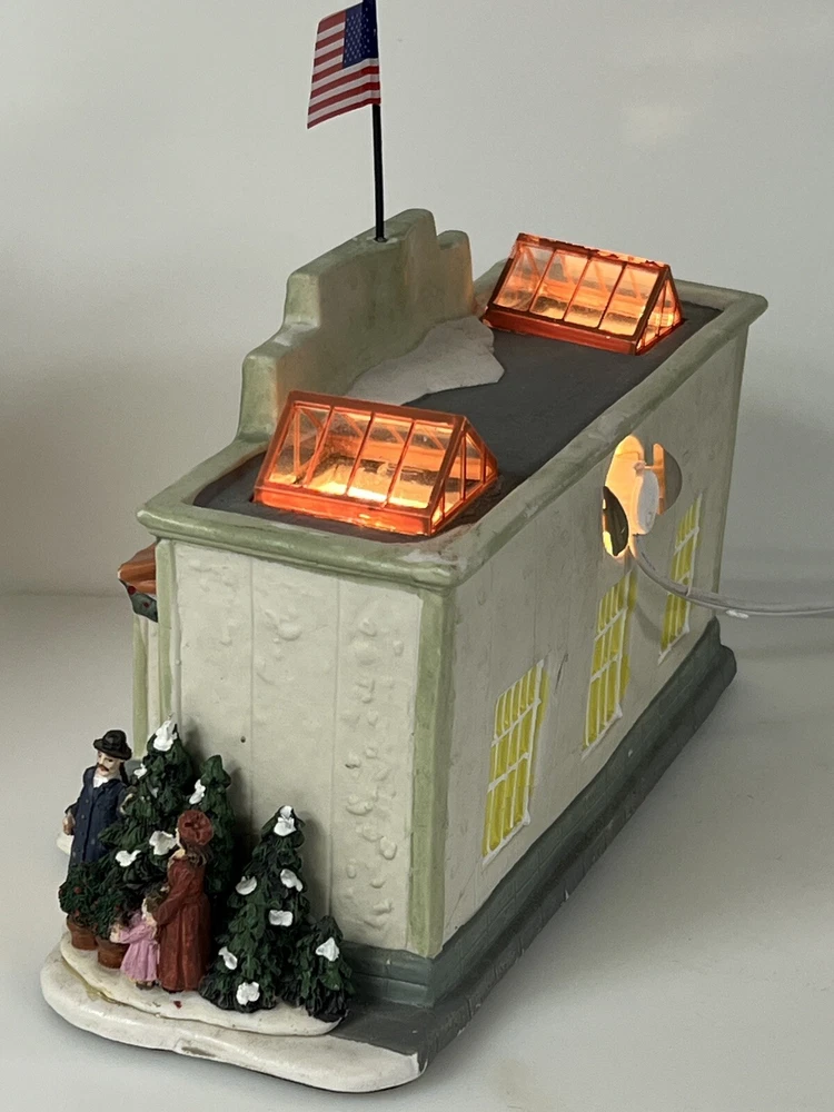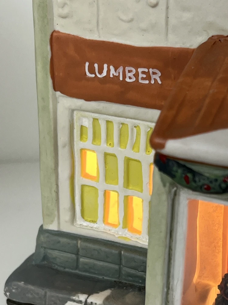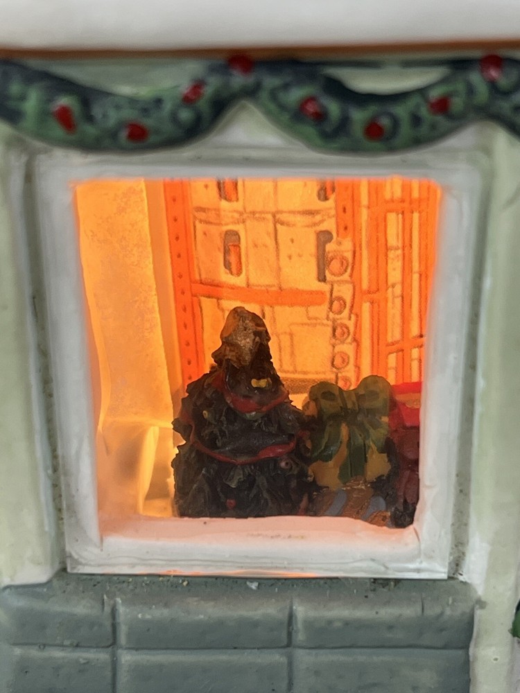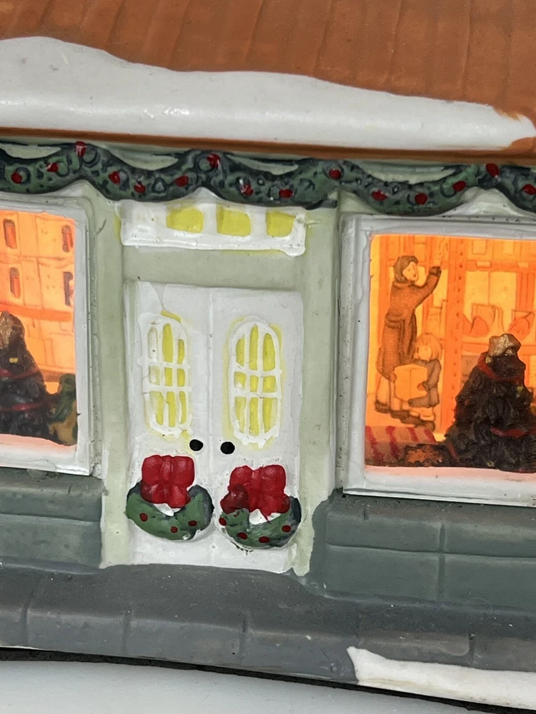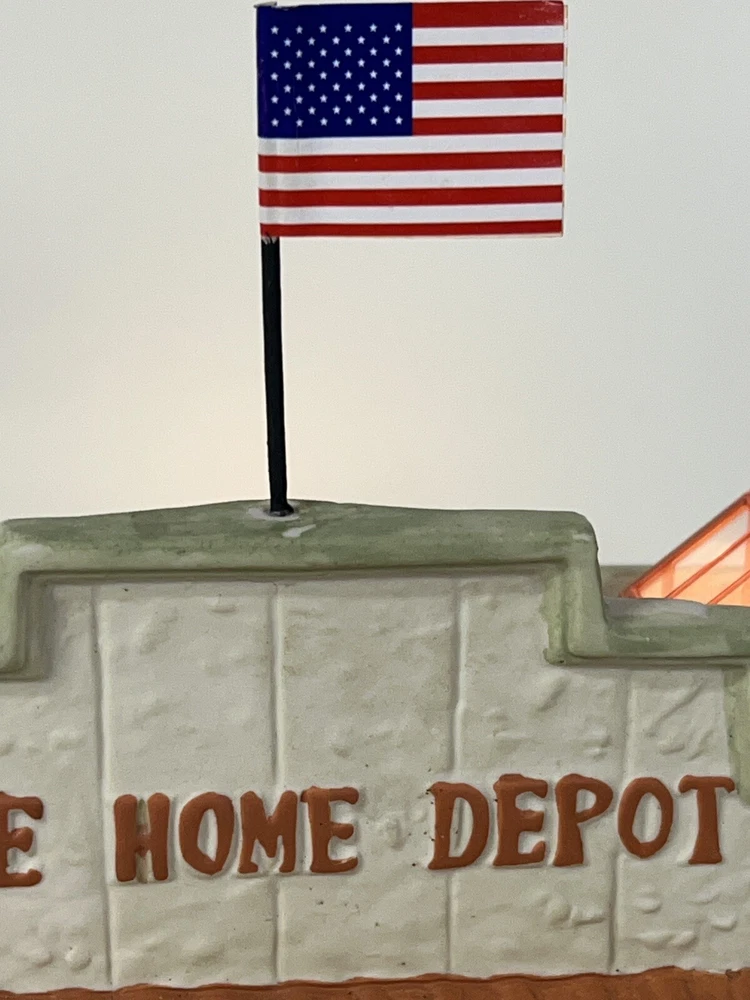 This Home Accents Christmas Village House depicts "The Home Depot Store" with a whimsical design. Made of porcelain, it features an illuminated 3D effect, suitable for seasonal display. The medium-sized house measures 10" in length, 7" in height, and 5 3/4" in width. Part of the limited edition "The Home Depot Store" collection from 2012, it is a festive addition to any room during the holiday season. No original box , comes with cord & light