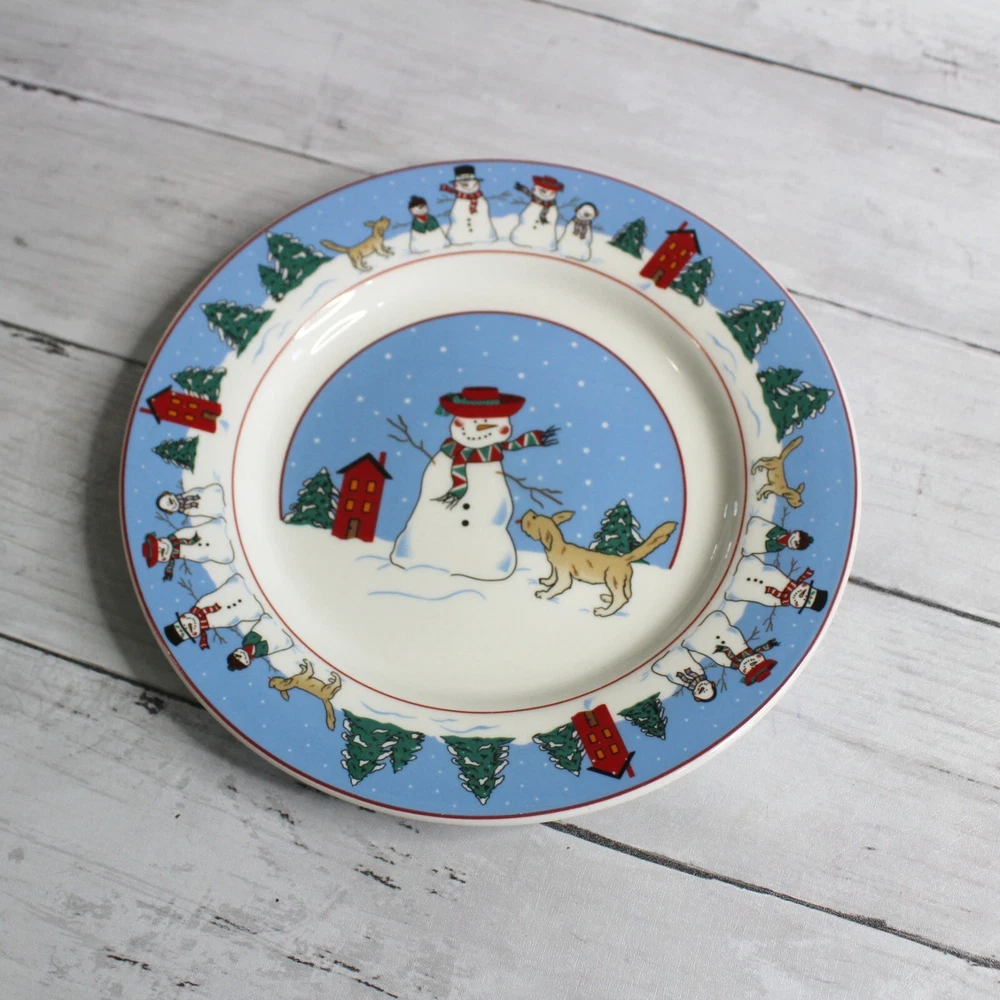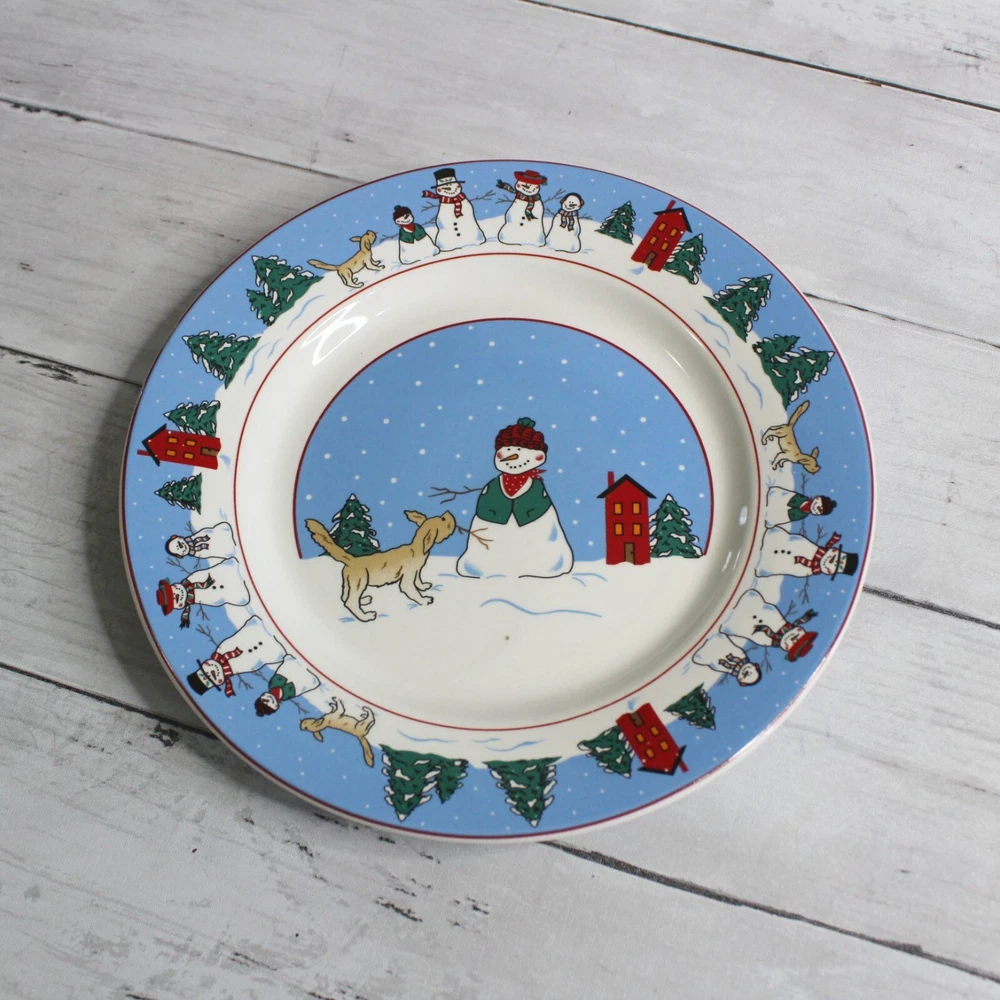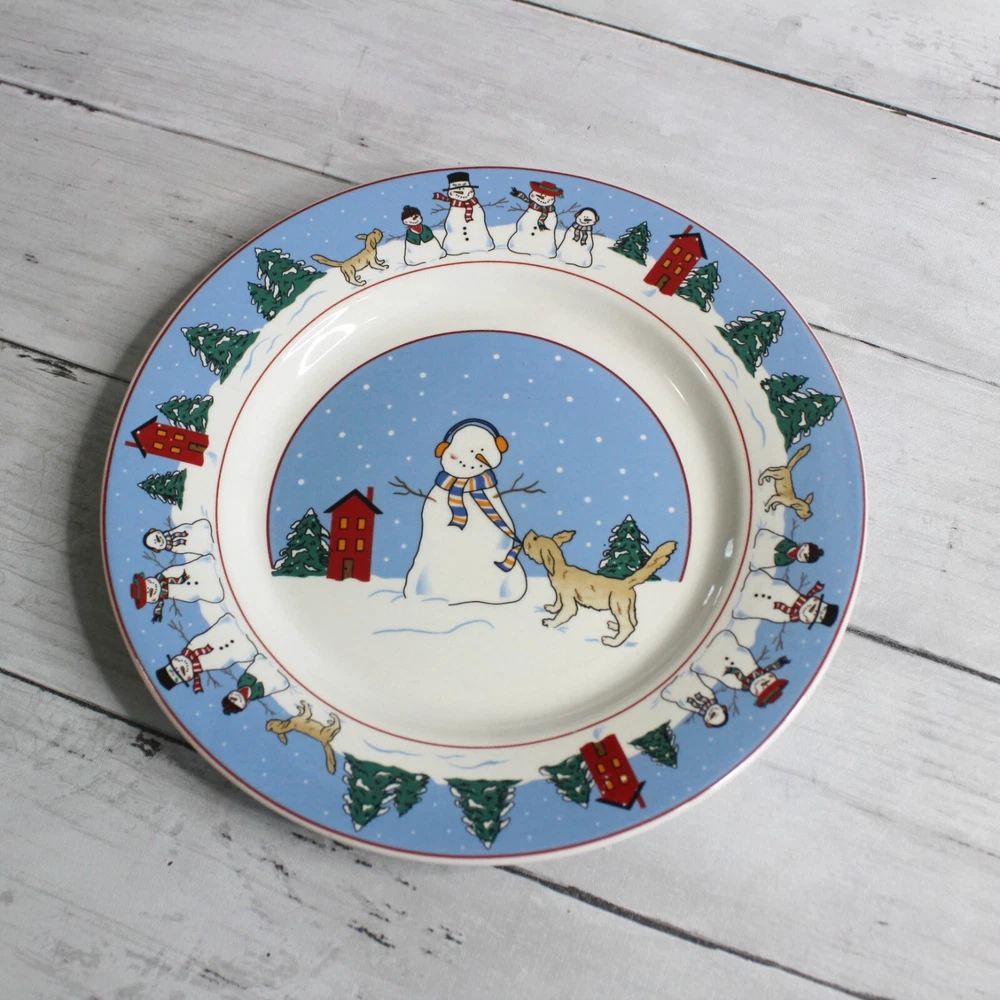 Canterbury Potteries, Ltd. Vintage 2006 Family Holiday Designed by Toby Pieri Stoneware Dinnerware Round Salad Plates - Could be used as snack or luncheon plates too 8" Diameter Dishwasher and Microwave Safe Colors: Blue White Green Red Tan and Black Theme: Winter Christmas Holiday Snowman Snowmen Golden Retriever Puppy Dog Lover Whimsical Snow Snowflake Lot of 4 This lot includes a set of four 8" plates. They are slightly vintage and are in excellent hardly used condition. I have several other pieces listed too that match this same dinnerware collection.