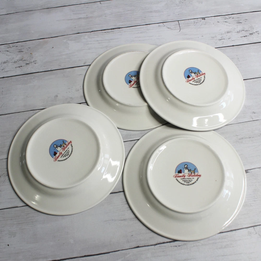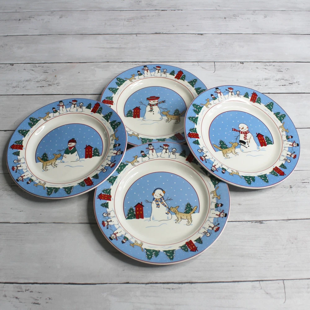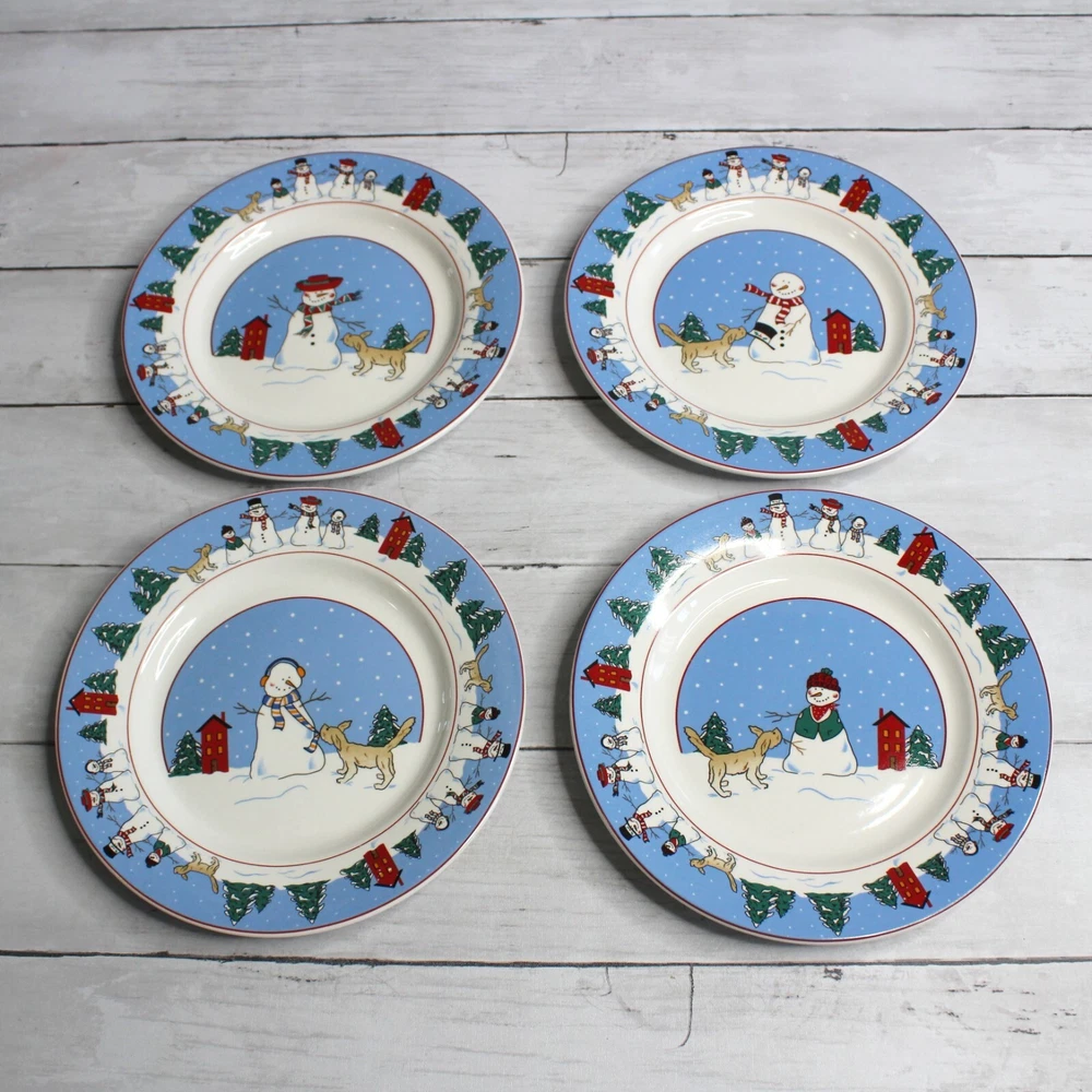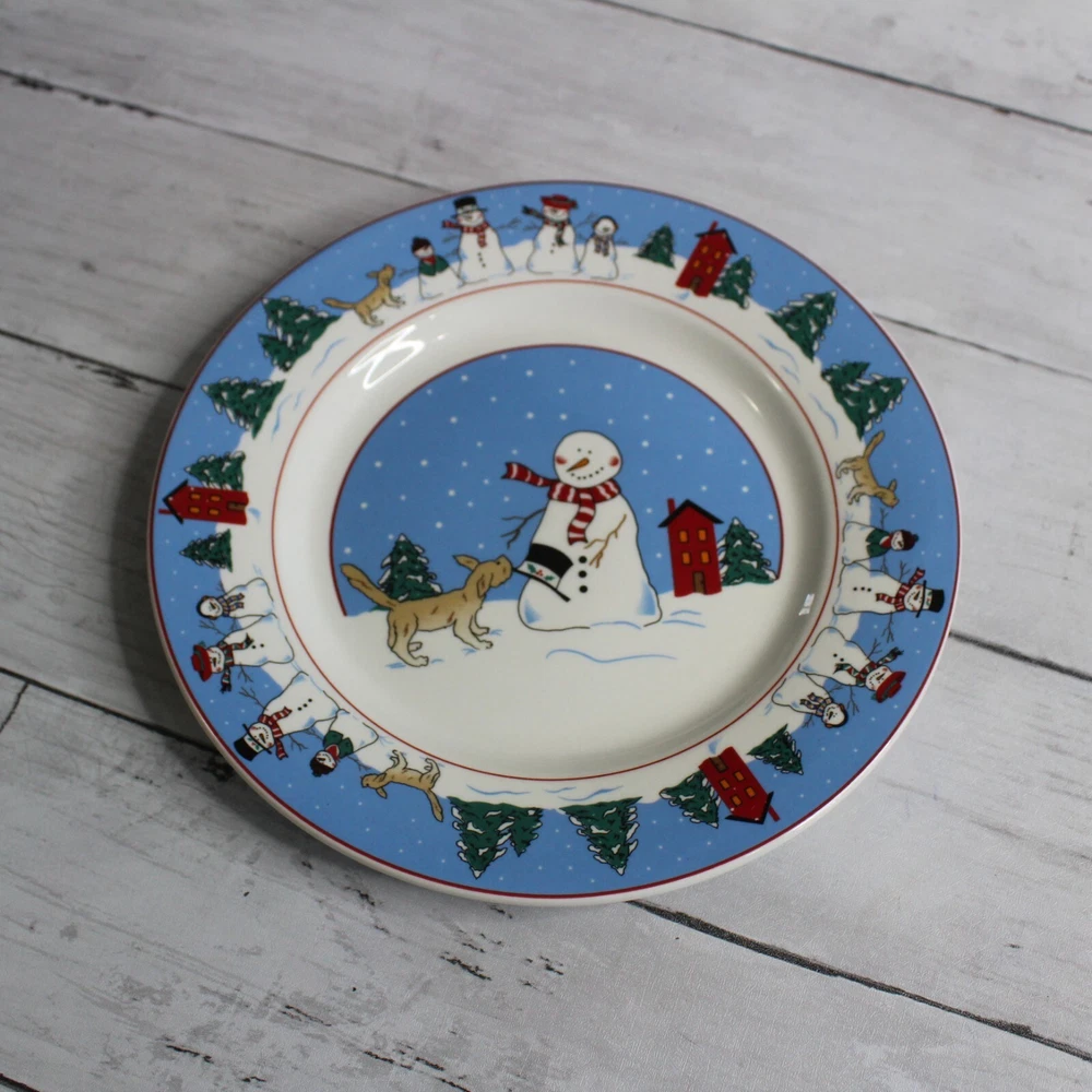 Canterbury Potteries, Ltd. Vintage 2006 Family Holiday Designed by Toby Pieri Stoneware Dinnerware Round Salad Plates - Could be used as snack or luncheon plates too 8" Diameter Dishwasher and Microwave Safe Colors: Blue White Green Red Tan and Black Theme: Winter Christmas Holiday Snowman Snowmen Golden Retriever Puppy Dog Lover Whimsical Snow Snowflake Lot of 4 This lot includes a set of four 8" plates. They are slightly vintage and are in excellent hardly used condition. I have several other pieces listed too that match this same dinnerware collection.