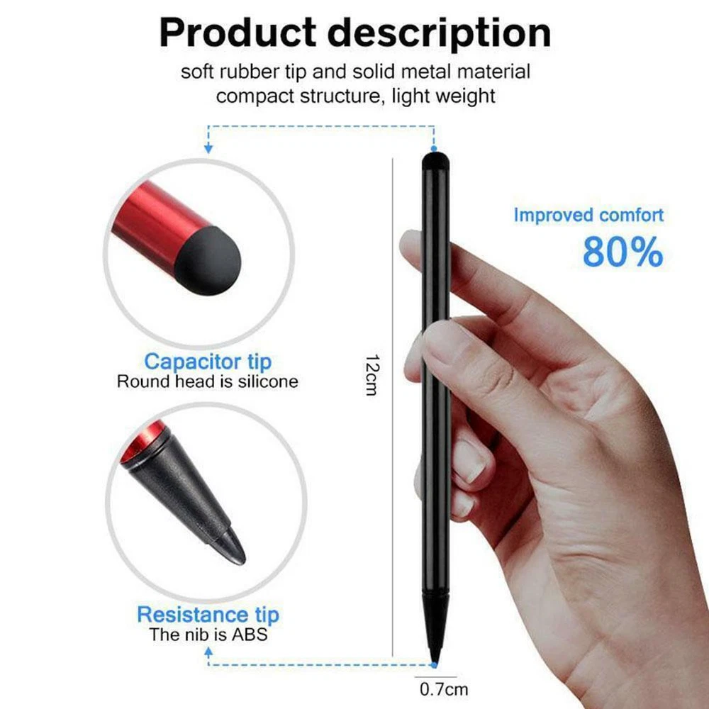 Description Description&Preview shipping&policy Description: Feature: This dual function stylus includes a soft capacitive stylus fully compatible with all screen devices AND a resistive hard tip stylus. Capacitive Stylus and Resistive Hard Tip Stylus Combination Capacitive Stylus fully compatible with all capacitive screen devices Practical design brings more convenience to your life. The touching end of stylus is designed with rubber, soft enough to protect your screen against fingerprints and scratches, maintaining high definition to your screen. Compatible with all capacities screen devices, such as for iPhone 7/7 Plus/6/6s/6 Plus/6s Plus, iPad Mini, iPad Air, iPod, Galaxy S3/s4/s5/s6/s7 edge, HTC, Nexus, Android Phones and Resistive Screen device Specifications: Type: Stylus Pen Size:1×1×12cm Colors: Silver, Black, red Note: Round head can only be used in the capacitive screen, pointed can only be used for resistive screen Package Content: 1 X Stylus Pen ( Double-end ) Preview: Thank you for your purchase Problems? You can follow below process to chontact us. There is a time zone difference,but we will do our best to quickly response to your questions: Shipping ● We will arrange shipping for you within 24 Hours after payment cleared except the holidays. ● We always send the item to the address you give us on PAYPAL to ensure the security of the item. If you have changed your address, or want us to ship to another address, please change to the new address when you pay us with PAYPAL, otherwise we will not be responsible if the package is lost. Payments We accepts Paypal only If you have any questions about the payment,please contact us through eBay message. Import Duties In case some duty is due Upon delivery, it is your responsibility to meet that expense and this may cause delays to delivery schedule and you may have to pickup goods at the customs office. Terms & Conditions By bidding on this item,the Buyer agrees to all of the terms and conditions as outlined in this listing .please ensure to read and agree to All eBay terms and Conditions before bidding. All pictures are for illustration purpose only and Colours may vary slightly. Our store obeys all eBay Rules and Policies. Returns Policy To Return an item you must contact us and take photos of your item to clearly show any damage or unusual aspects of it. Approved returns will be subject to inspection on arrival. Items must be returned in original condition with all original packaging. All shipping and handing charges are non-refundable Return delivery costs are the responsibility of the buyer. We will cover the cost if sending replacement/repaired items. Within 7 days after receiving your products, we offers a no-hassle 7 day exchange/replace only if your items are found to be defective by manufacturer.