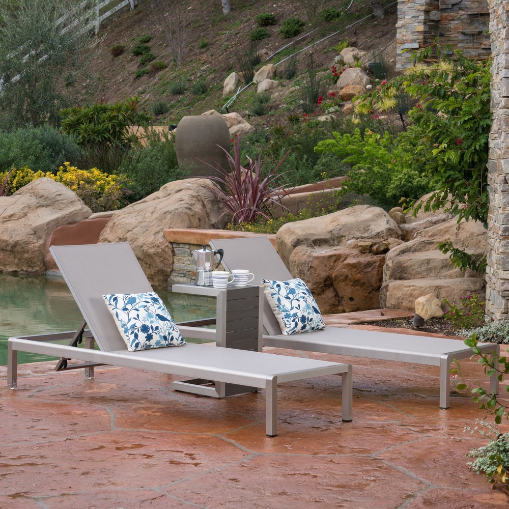 Enjoy the summer lounging in your backyard with your significant other with mimosas on the perfectly shaped table between you. This set comes complete with two lounges and a side table, allowing you to enjoy both the weather and your drinks! You can even have your cake and eat it too with this set. Take back your backyard this summer with this lounge and table set. Includes: One (1) C-Shaped Table, Two (2) Chaise Lounges Multiple Table Top Material Options Frame Material: Aluminum Lounge Material: Outdoor Mesh Multiple Finish Options Multiple Lounge Finish Options Assembly Required Lounge Dimensions: 77.56 inches deep x 25.20 inches wide x 11.80 inches high Table Dimensions: 15.00 inches deep x 14.50 inches wide x 24.00 inches high Free Shipping Over $49.99* Details Cape Coral Mesh and Aluminum 3-piece Chaise Lounge with End Table Set by Product Description: Enjoy the summer lounging in your backyard with your significant other with mimosas on the perfectly shaped table between you. This set comes complete with two lounges and a side table, allowing you to enjoy both the weather and your drinks! You can even have your cake and eat it too with this set. Take back your backyard this summer with this lounge and table set. IncludesOne (1) C-Shaped Table, Two (2) Chaise Lounges Multiple Table Top Material Options Frame MaterialAluminum Lounge MaterialOutdoor Mesh Multiple Finish Options Multiple Lounge Finish Options Assembly Required Lounge Dimensions77.56 inches deep x 25.20 inches wide x 11.80 inches high Table Dimensions15.00 inches deep x 14.50 inches wide x 24.00 inches high