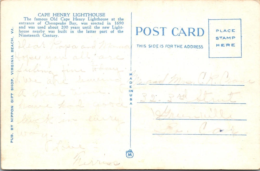 Original/Licensed Reprint: Original Region: Virginia Type: Printed (Lithograph) City: Cape Henry Country/Region of Manufacture: Unknown Postage Condition: See Image Unit of Sale: Single Unit Country: USA Subject: Cities & Towns Theme: Cities & Towns Era: Linen