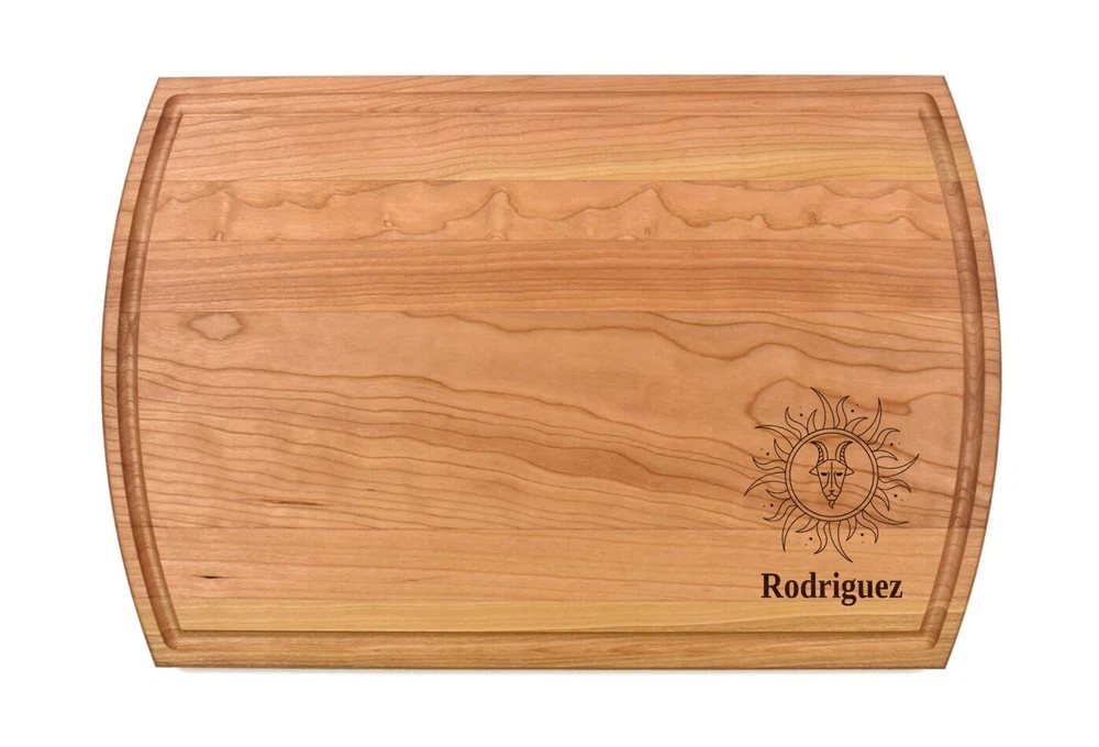 Design: Personalized Capricorn Cutting Board or Charcuterie Serving Tray All items ship via USPS - please make sure your address is correct :-) Whether used as a charcuterie serving tray for snacks or cutting board, our bamboo, walnut and cherry custom boards are the perfect addition for the home and make the perfect gift for your loved one celebrating a birthday, anniversary, new home, wedding, etc! *** FEATURES *** • SIZES: We have multiple styles and sizes available. To see our current sizes available, click the drop-down menu. The photo slide contains a photo showing each side by side. Please note, the board with the juice groove only has the groove on the front side of the board. • THICKNESS: Bamboo Boards - Approximately 1/2" Thick; Walnut & Cherry Boards - Approximately 3/4” Thick • UNIQUE: Every board is unique with the grain and coloring varying throughout - no board is the same! • CARE INSTRUCTIONS: Hand wash only with warm water. Do not soak. Please apply mineral oil throughout the board’s life. • PERSONALIZATION/CUSTIMIZATION: Do you want the text placed differently on the board? Please don’t hesitate to contact us. All personalization notes can be entered in the personalization box when checking out. • SHIPPING: All cutting boards ship within 2 to 5 business days. • WHOLESALE ORDERS: Please don’t hesitate to contact us for information about wholesale orders. Processing times for larger orders may change. • NOTE: Colors can vary a bit on different monitors and screens. Any props included in photos are not included. Please be sure to double-check your address to make sure it is accurate for USPS delivery. If a package is returned to us due to an invalid address, the buyer is responsible for all additional shipping charges. We appreciate you supporting small business – best wishes! For items ordered with simple edits, we do not send proofs since the layout doesn't change from the example(s). However, in the event there are requests that change the layout from the example(s), we do send proofs for approval before making the product. If you'd like a proof before we make the product, please note so in the personalization box.