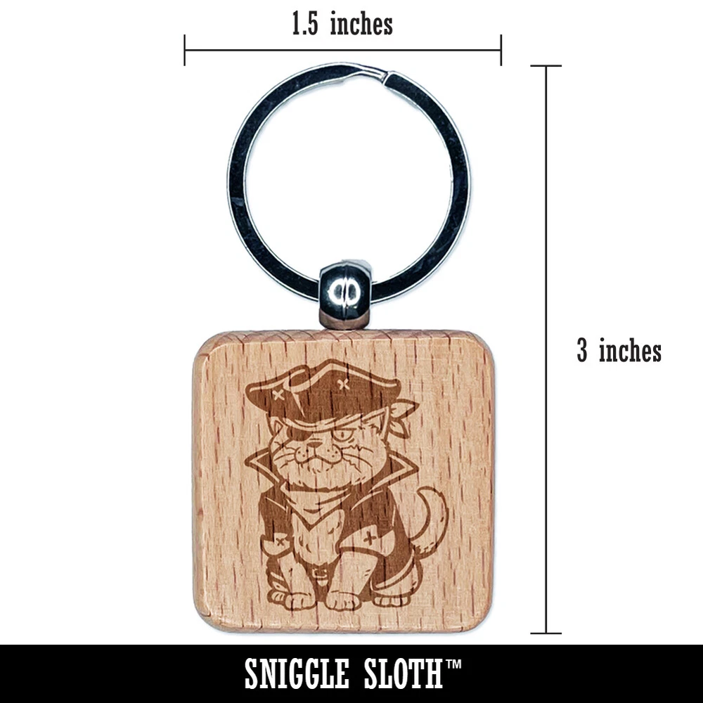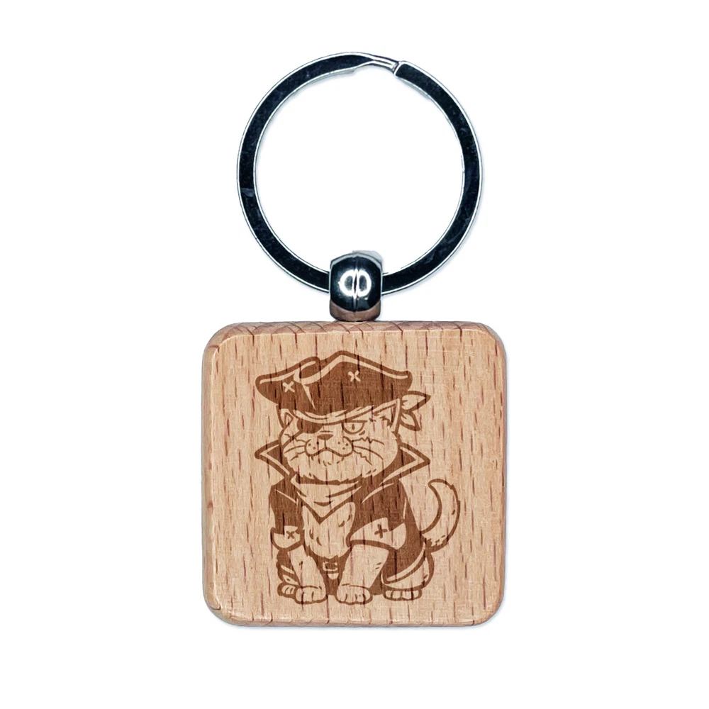 Captain Pirate Cat Engraved Wood Square Keychain Tag Charm