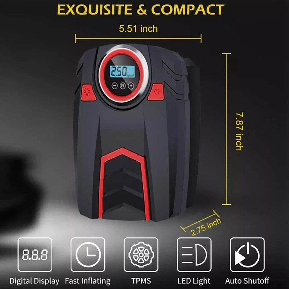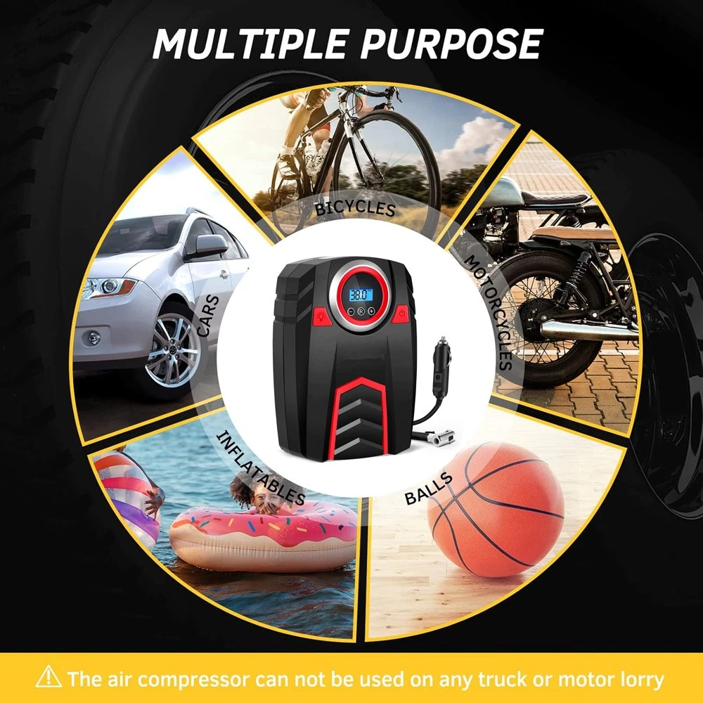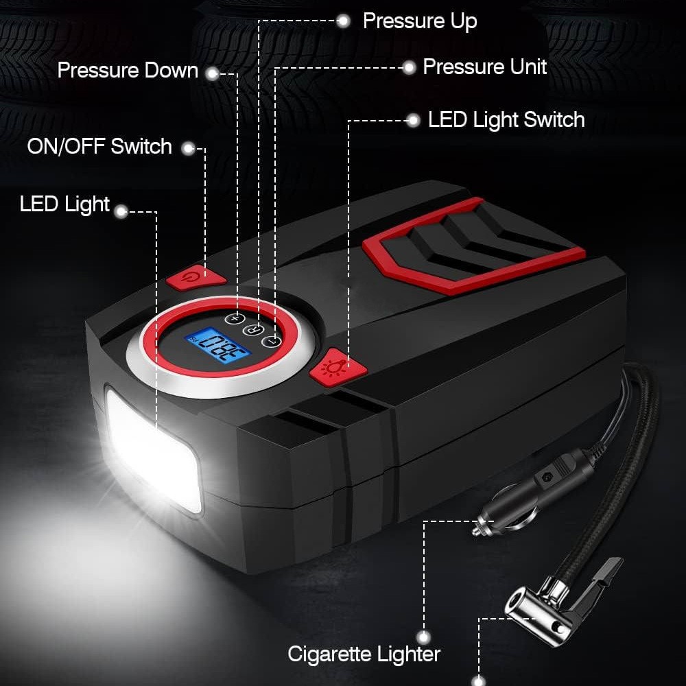 Car Truck Van Motorcycle Tire Air Pump Compressor Inflator Digital Electric & Portable Tough Rugged Durable & Heavy Duty Color: Black/Red Specifications: Operating Voltage: DC 12V Power: 120W Power Cable Length: 9.75 Ft Air Hose Length: 2.0 Ft Maximum Pressure: 150 PSI Power Supply Type: 12V Cigarette Lighter Large Floodlight: 500 Lumen LED Flow Rate: 8 Gallons/Minute Working current: ≥10A Continuous Working Time: 10 minutes and 30 seconds Inflation Time: 2 - 5 minutes Product Dimensions: 8.0 X 6.0 x 3.5 in Color: Black/Red Features: ACCURATE AND FAST INFLATION: Built-in premium brass movement and wires, the maximum pressure of our tire inflator is up to 150PSI and can accurately measure and inflate from 0-150 PSI. The air flow rate of our tire inflator can reach 30L/mins to fully inflate a tire in 2-5 minutes. AUTO SHUT OFF FOR SECURE INFLATION: Our upgraded tire inflator can automatically turn off when the air pressure reaches the pressure you preset, which ensures the safety of your tire during inflation. CONVENIENT LCD DISPLAY AND LED LIGHT: Designing an backlit LCD digital display to show the pressure in 4 units (PSI, BAR, KPA and KG/CM²) and 3 buttons to switch the units (“R” button), increase pressure (“+” button) and decrease pressure (“-” button) separately. This unit is also equipped with a bright large LED light to provide a clear view to inflate at night. EASY TO USE: Plug the 12V DC power connector into 12V cigarette lighter socket or other 12V outlet, next connect the air hose tightly with the tire valve, then set the compressor to preferred value, finally, press the power button to turn on the inflator and it will start to inflate the tire. After use you can easily organize the hose and power cord to the back of this inflator. WIDE APPLICATION: Comes with 3 replaceable air nozzles and an approximate 10ft power cord which allows this air inflator to inflate DC 12V 10A cars, SUVs, trucks, vans and also other equipment such as motorcycles, bicycles kayaks and all kinds of balls. Included In Package: 1 x Air Pump Compressor 3 x Inflatable Adapter Accessories 1 x Extra Fuse 1 x User Manual On Jan 12, 2026 at 05:02:52 PST, seller added the following information: