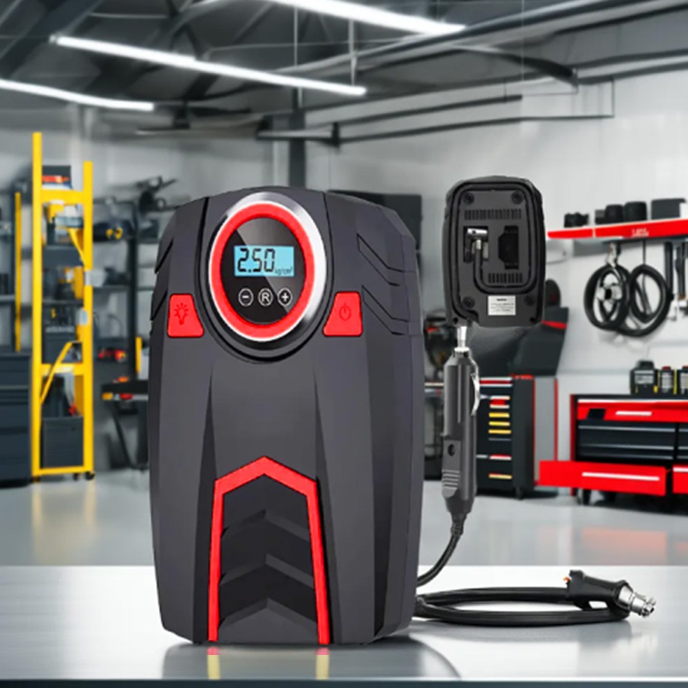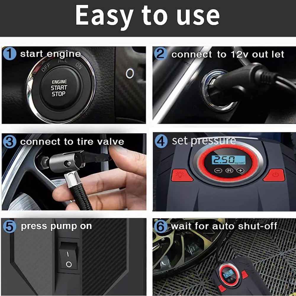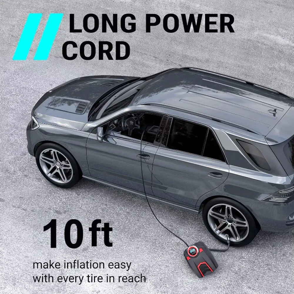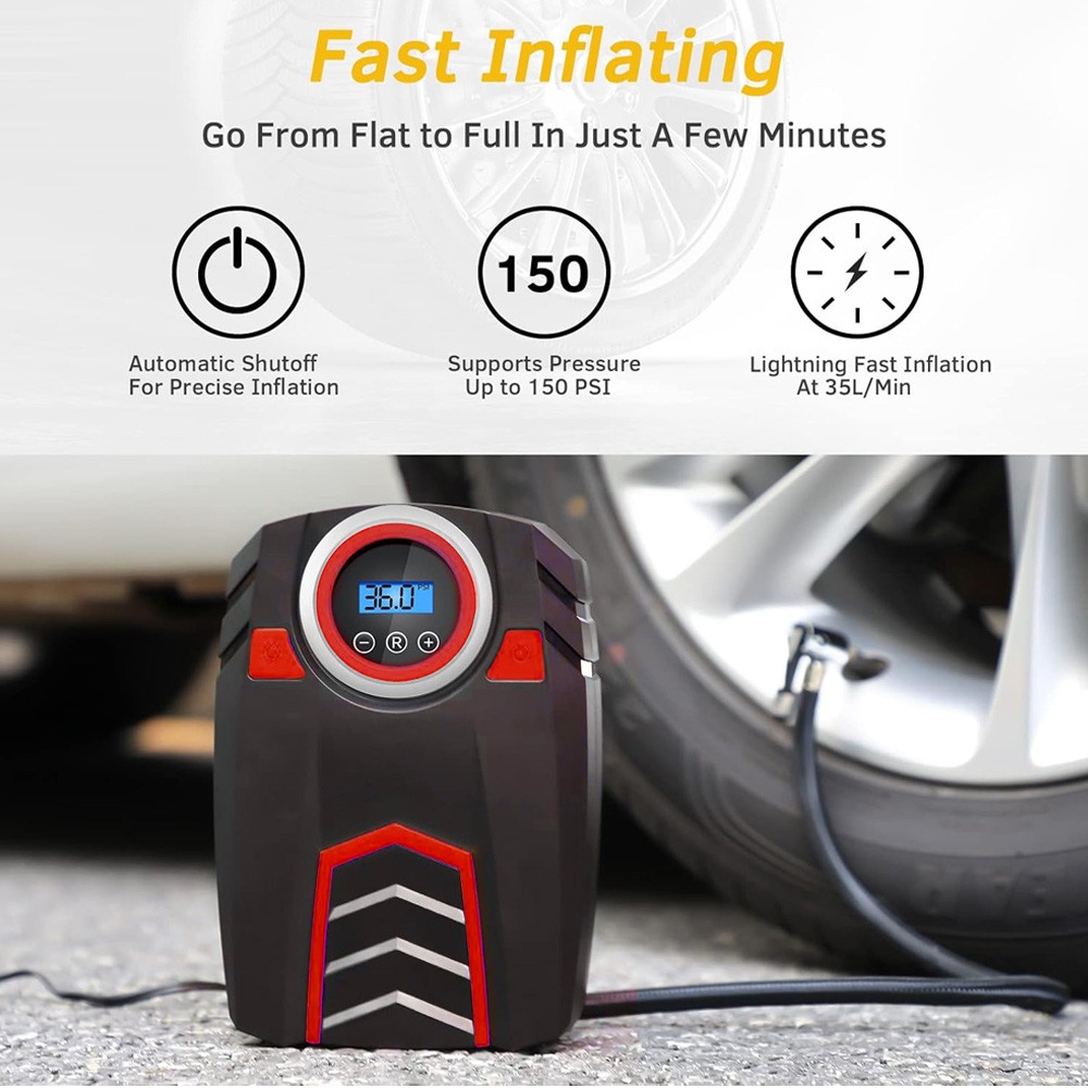 Car Truck Van Motorcycle Tire Air Pump Compressor Inflator Digital Electric & Portable Tough Rugged Durable & Heavy Duty Color: Black/Red Specifications: Operating Voltage: DC 12V Power: 120W Power Cable Length: 9.75 Ft Air Hose Length: 2.0 Ft Maximum Pressure: 150 PSI Power Supply Type: 12V Cigarette Lighter Large Floodlight: 500 Lumen LED Flow Rate: 8 Gallons/Minute Working current: ≥10A Continuous Working Time: 10 minutes and 30 seconds Inflation Time: 2 - 5 minutes Product Dimensions: 8.0 X 6.0 x 3.5 in Color: Black/Red Features: ACCURATE AND FAST INFLATION: Built-in premium brass movement and wires, the maximum pressure of our tire inflator is up to 150PSI and can accurately measure and inflate from 0-150 PSI. The air flow rate of our tire inflator can reach 30L/mins to fully inflate a tire in 2-5 minutes. AUTO SHUT OFF FOR SECURE INFLATION: Our upgraded tire inflator can automatically turn off when the air pressure reaches the pressure you preset, which ensures the safety of your tire during inflation. CONVENIENT LCD DISPLAY AND LED LIGHT: Designing an backlit LCD digital display to show the pressure in 4 units (PSI, BAR, KPA and KG/CM²) and 3 buttons to switch the units (“R” button), increase pressure (“+” button) and decrease pressure (“-” button) separately. This unit is also equipped with a bright large LED light to provide a clear view to inflate at night. EASY TO USE: Plug the 12V DC power connector into 12V cigarette lighter socket or other 12V outlet, next connect the air hose tightly with the tire valve, then set the compressor to preferred value, finally, press the power button to turn on the inflator and it will start to inflate the tire. After use you can easily organize the hose and power cord to the back of this inflator. WIDE APPLICATION: Comes with 3 replaceable air nozzles and an approximate 10ft power cord which allows this air inflator to inflate DC 12V 10A cars, SUVs, trucks, vans and also other equipment such as motorcycles, bicycles kayaks and all kinds of balls. Included In Package: 1 x Air Pump Compressor 3 x Inflatable Adapter Accessories 1 x Extra Fuse 1 x User Manual On Jan 12, 2026 at 05:02:52 PST, seller added the following information: