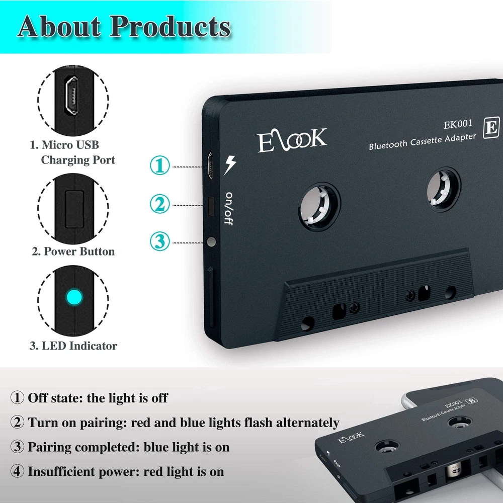 Half classic, half trend. Connected through an adapter, you can form a wonderful world. Elook Bluetooth Cassette to Aux Adapter provides you with a satisfying musical enjoyment. Can be connected to any phones, tablets, MP3 players, car stereo, Hi-Fi, portable speaker or other devices equipped with Bluetooth 5.0. Fits for most car cassette player. Made with intentional materials and workmanship. þSimple design, easy to use. þHigh quality matte casing. þStereo magnetic head, improving sound. þWith strong compatibility. Package Includes: 1 * Bluetooth Cassette Adapter Black 1 * Instruction 1 * Service Card Worry-free Ater-sale Service Elook customer service team offers 12-month-replacement guarantee. Every member is always ready to solve your inquiry. Please feel free to contact us for any product questions. 【Wake up your vintage car】Elook audio cassette receiver connects your music library to your car tape deck. Making it easy to enjoy plentiful musics with premium sound in your vintage car. 【Pursuit of better sound】Every small part has been tested thousands of times, and the materials in each part are carefully selected. In order to minimize noise, achieve high quality music enjoyment. Give it a higher price/performance ratio. 【Strong Compatibility】Bluetooth 5.0 receiver, can be connected to any device equipped with Bluetooth. 【Comfortable and easy to use design】There are no complicated ways to use it. Put in the cassette player, connect to the phone, and turn on the music. Only 3 steps to save your boring journey. 【Worry-free Ater-sale Service】12-month-replacement and professional customer service team to solve any product problems for you.