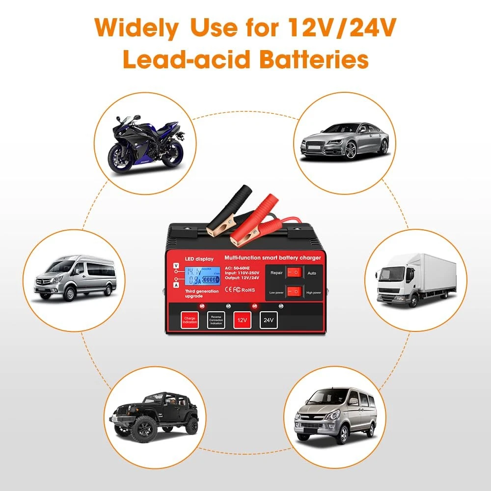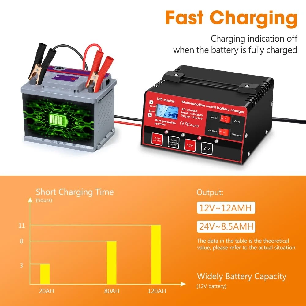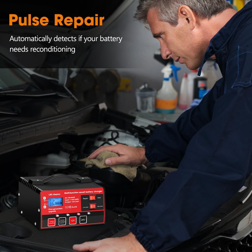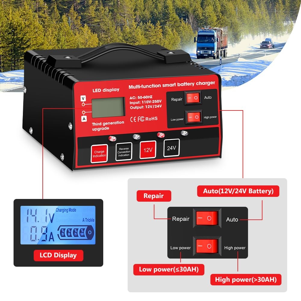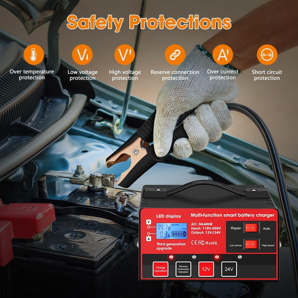 12V/24V Battery Charger 【INTELLIGENT LCD DISPLAY】The automatic intelligent charger can display current and voltage without manual adjustment, making it easier to charge your battery. Automatic mode of battery charger: fully intelligent charging and maintenance of battery, no extra operation required. Manual mode: adjust the charging mode, for example, you can continue charging after the automatic mode is charged. 【FAST CHARGING】The charger is designed for 12V/24V batteries. Input voltage: 100-240V AC, Battery range:12V/10AMH(max); 24V/7.5AMH(max). Automatically adjust the charging current, easy to deal with a variety of harsh voltage environments, quickly charge the battery. Suitable for charging any lead acid, Flooded(WET), GEL, Calcium type deep cycle, maintenance free and AGM batteries with capacities up to 6-105Ah (Amp-hours). 【Auto Mode and Repair Mode】Choose Auto Mode for regular use, stop current input automatically when full, protect the battery to prolong the service life. In Repair Mode, our charger will always charge your battery, regardless of whether your battery is fully charged or not. The advantage of repair mode is you can continue charging when the battery is fully charged to activate your battery. 【5-stage Pulse Repair】Adopt pulse width modulation technology; for battery charging to repair the internal resistance and battery maintenance (automatically detects if your battery needs repair). When the battery is fully charged, the charger automatically switches to trickle mode to provide a weak current to balance the full charge value 【WIDE RANGE USE】The Smart Battery Charger can diagnose and repair various battery problems, including flooded and sealed maintenance-free batteries. Suitable for all kinds of vehicles, lithium battery or lead-acid battery: car, motorcycle, marine, RV, powersport, lawn mower, children's toys, etc.