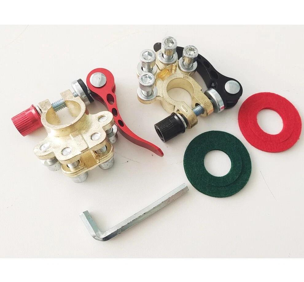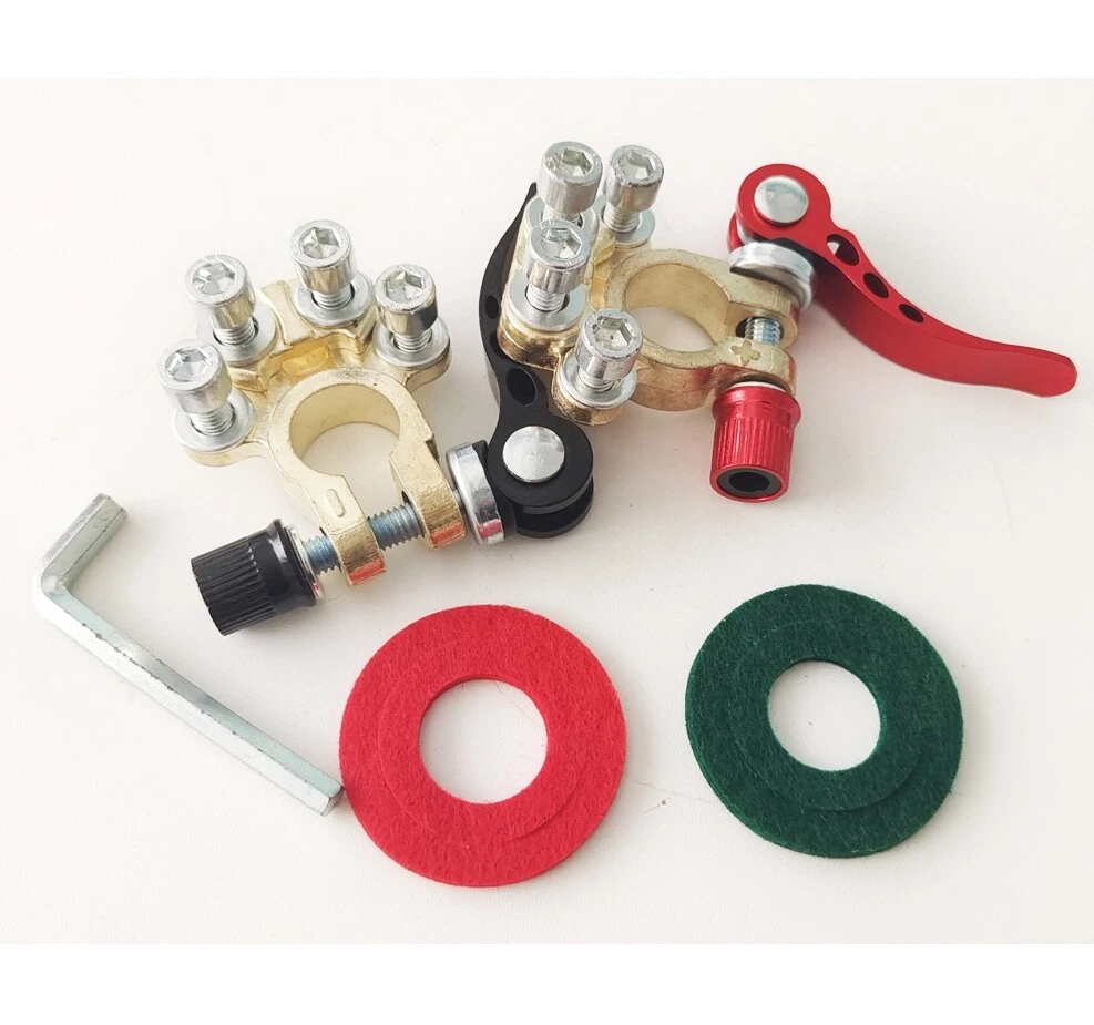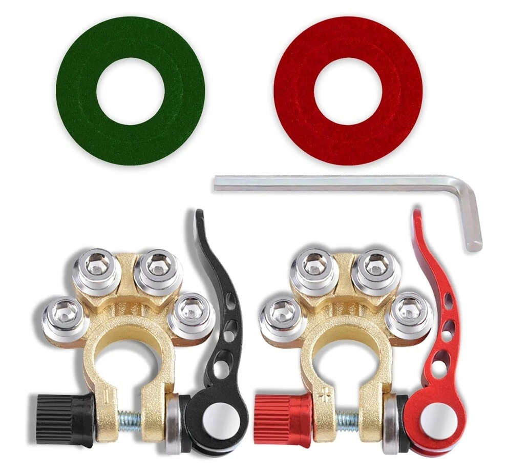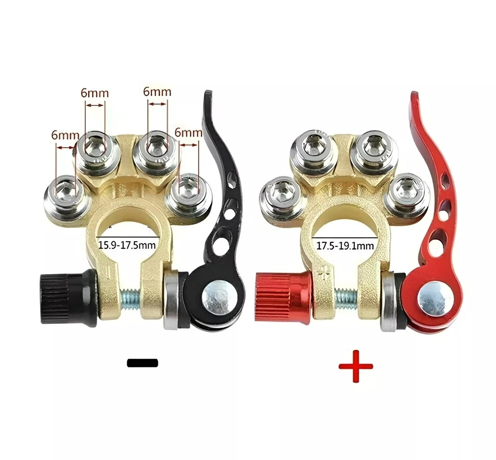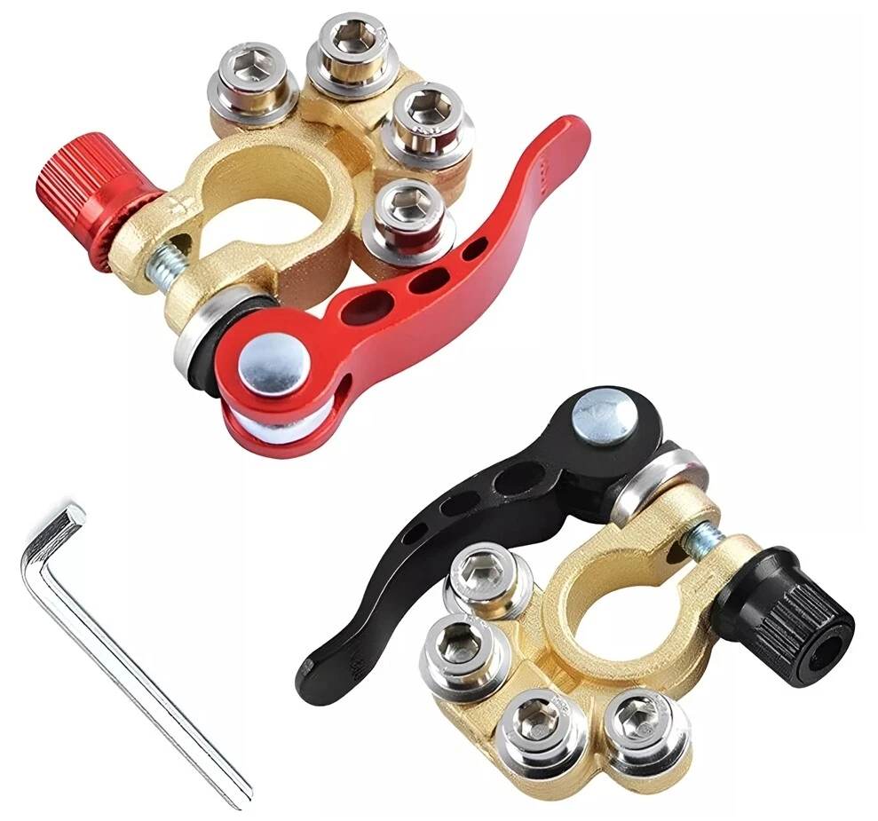 Package includes: 4 pieces of quick disconnect Car Battery Terminals Connectors Features: 4 post wire connection design to accommodate multiple cable connections. The package also includes Allen wrenches for easy installation. Suitable for wire diameters 4.1 - 8.2 mm (AWG gauges 0 - 16) and wire clamps 9.5mm - 6.5mm; can be effortlessly connected to the battery posts after installation. Comes with clearly labelled Positive (17.5mm-19.1mm) and Negative (15.9mm-17.5mm) Battery Terminal Connectors; ensures compatibility with most battery models and can replace worn out or corroded terminals. Wide-ranged application includes Cars, Vans, Caravans, Motorhomes, Truck Batteries, and Car Audio devices Car Battery Terminal Connectors 4Way Quick Disconnect Release Terminal Clip 4Pcs Package includes: 4 pieces of quick disconnect Car Battery Terminals Connectors Features: 4 post wire connection design to accommodate multiple cable connections. The package also includes Allen wrenches for easy installation. Suitable for wire diameters 4.1 - 8.2 mm (AWG gauges 0 - 16) and wire clamps 9.5mm - 6.5mm; can be effortlessly connected to the battery posts after installation. Comes with clearly labelled Positive (17.5mm-19.1mm) and Negative (15.9mm-17.5mm) Battery Terminal Connectors; ensures compatibility with most battery models and can replace worn out or corroded terminals. Wide-ranged application includes Cars, Vans, Caravans, Motorhomes, Truck Batteries, and Car Audio devices Brand Unbranded Manufacturer Part Number Does not apply Country/Region of Manufacture China Warranty 90 Day Positive taper hole size 17.5~19.1mm Type Battery Terminal Connector Material Brass+Aluminum alloy+steel Negative taper hole size 15.9~17.5mm quantity 4 Type 1 Battery Terminal Connector Clamp