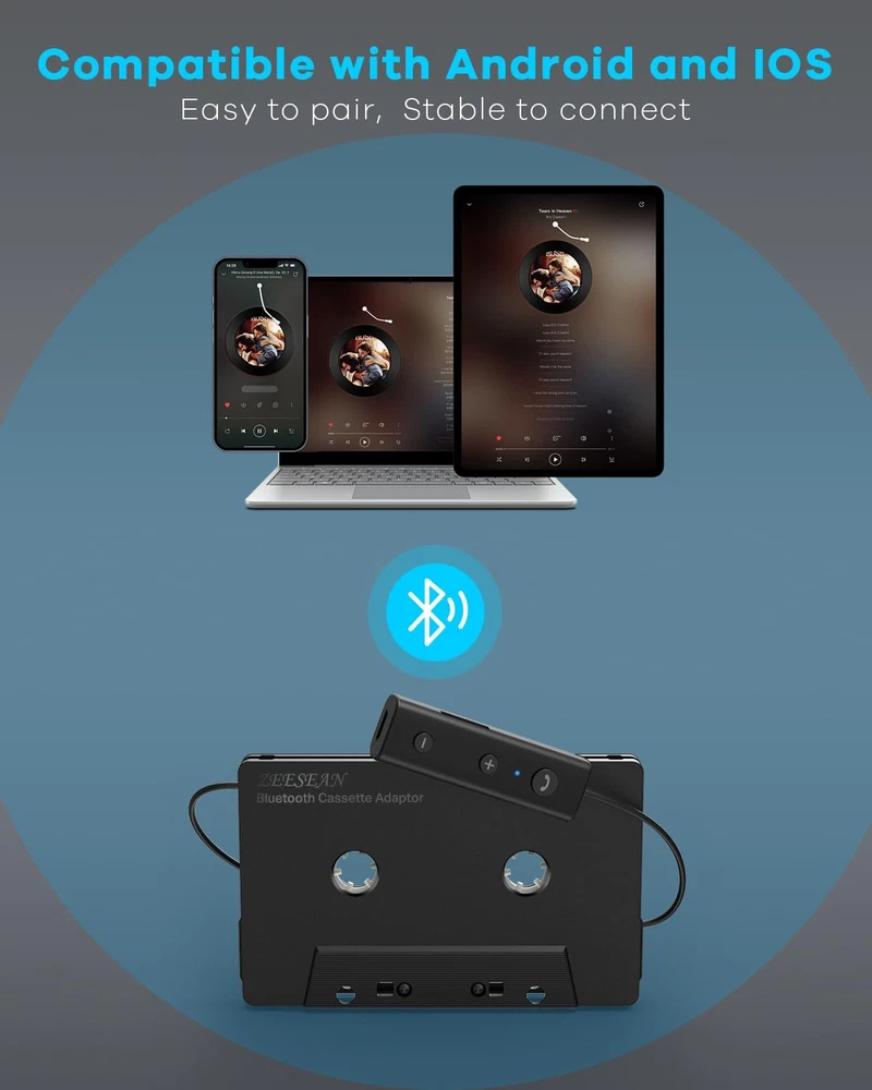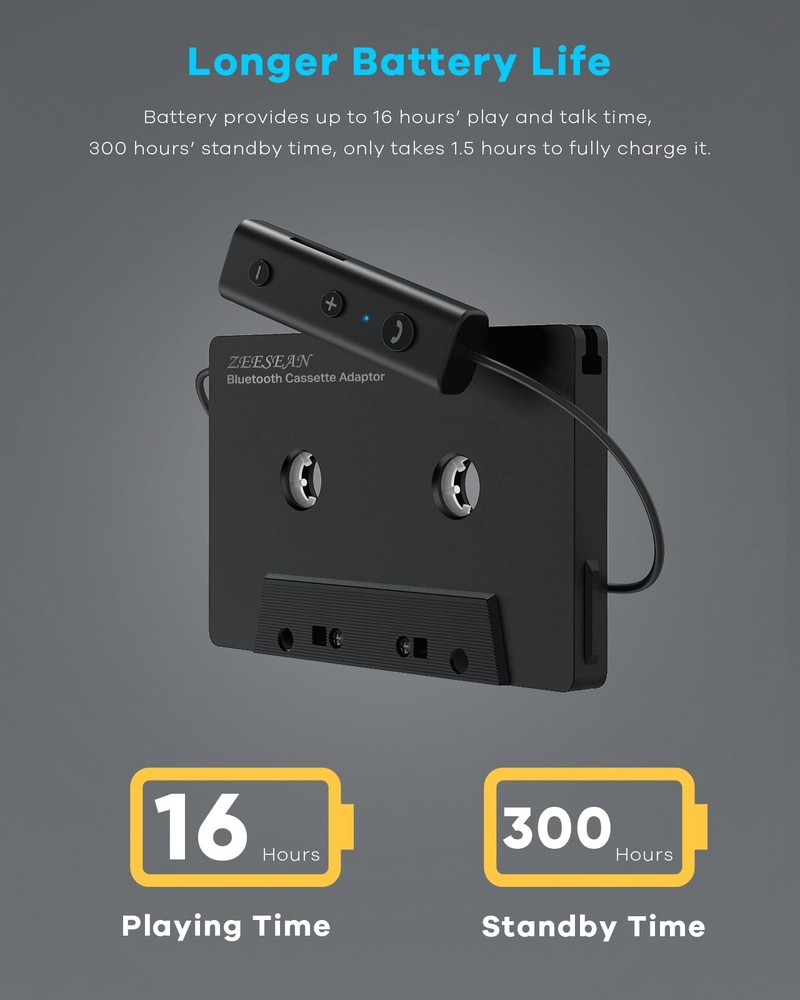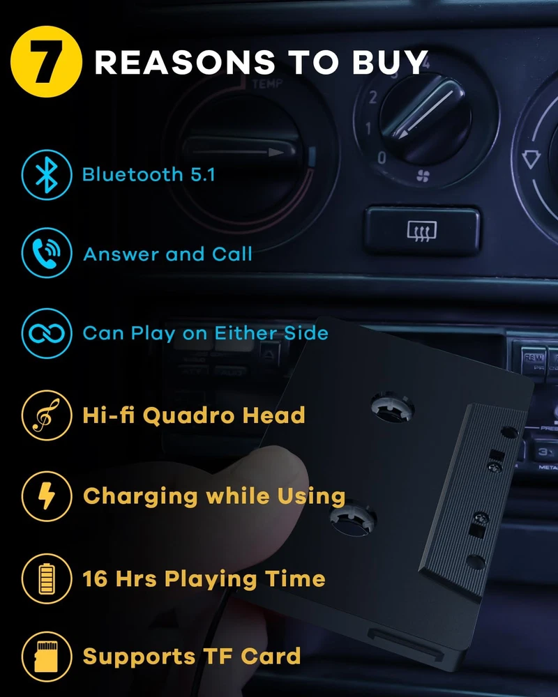 Upgrade your car audio system with the Bluetooth Cassette Adapter. With Bluetooth 5.1 technology , this adapter offers seamless wireless connectivity, allowing you to stream music from your smartphone or other Bluetooth-enabled devices directly to your car's audio system. Stay connected on the road with the convenient hands-free calling feature. The built-in microphone enables you to answer calls without distractions, ensuring a safer driving experience. With up to 16 hours of playtime on a single charge, you can enjoy your favorite music throughout your road trips without worrying about running out of power. Additionally, the adapter allows you to play music while charging, providing continuous entertainment. Experience superior sound quality with the hi-fi quadro head design. The adapter delivers clear and immersive audio, enhancing your listening experience. The cassette adapter is designed to be versatile, allowing you to insert it into your car's cassette player in either direction. This ensures compatibility with various car models, making it a convenient choice for any vehicle. Expand your music options with the built-in TF card slot, supporting TF cards. Simply insert your TF card and enjoy a wide selection of audio files on the go. Upgrade your car audio experience with the Bluetooth Cassette Adapter. Stay connected, enjoy high-quality sound, and have a seamless music streaming experience wherever you go. Stable Connection with Bluetooth 5.1: Seamlessly connect your your Bluetooth-enabled devices to your car's cassette player without interruption. Conveniently handle phone calls hands-free while driving Supports SD Card: Expand your music options with the built-in TF card slot, supporting TF cards. Simply insert your TF card and enjoy a wide selection of audio files on the go 16 Hrs Play Time: Stay connected and play music for up to 16 hrs on a single charge. You can enjoy your favorite music throughout your road trips without worrying about running out of power Charging while Using: The adapter allows you to play music while charging, providing continuous entertainment. Enjoying your favorite tunes on the go Quadro Magnetic Head: Experience high-quality sound with the advanced Quadro magnetic head, which also allows you to insert the adapter into your car's cassette player in either direction