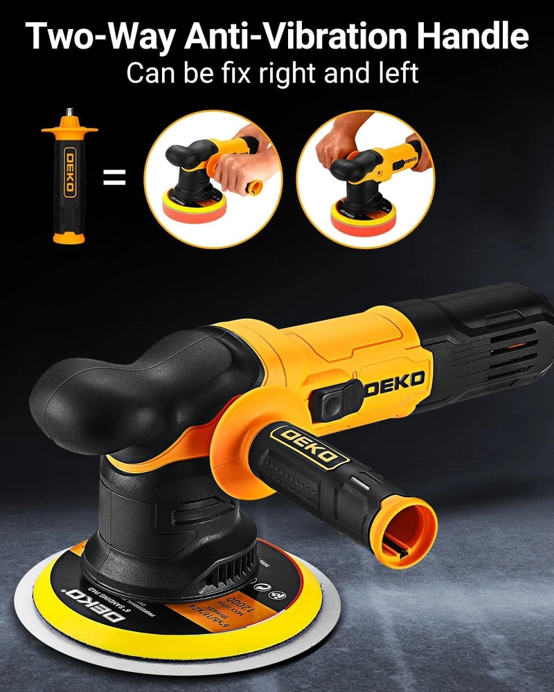 PRACTICAL BUFFER POLISHER: Dual action polisher for car detailing machine with constant speed and power control keeps polishing speed constant even under load 6 VARIABLE SPEED POLISHER: The car wax kit feature allows you to adjust the speed of the small electric waxer tools from 1800 to 5500 RPM according to your usage DUAL ACTION POLISHER MOTION: 6 Inch random orbital car polish kit is equipped with dual action motion, which ensures swirl-free and burn-free polishing results ERGONOMIC DESIGN: Our pulidora de autos is equipped with soft rubber side handles, ensuring non-slip control and comfortable operation WIDE APPLICATION: The hand tool rotary polisher includes 3 different foam buffing pads and 1 wool polishing pad, perfect for buffing and removing swirls, scratches, and stains from all painted vehicles