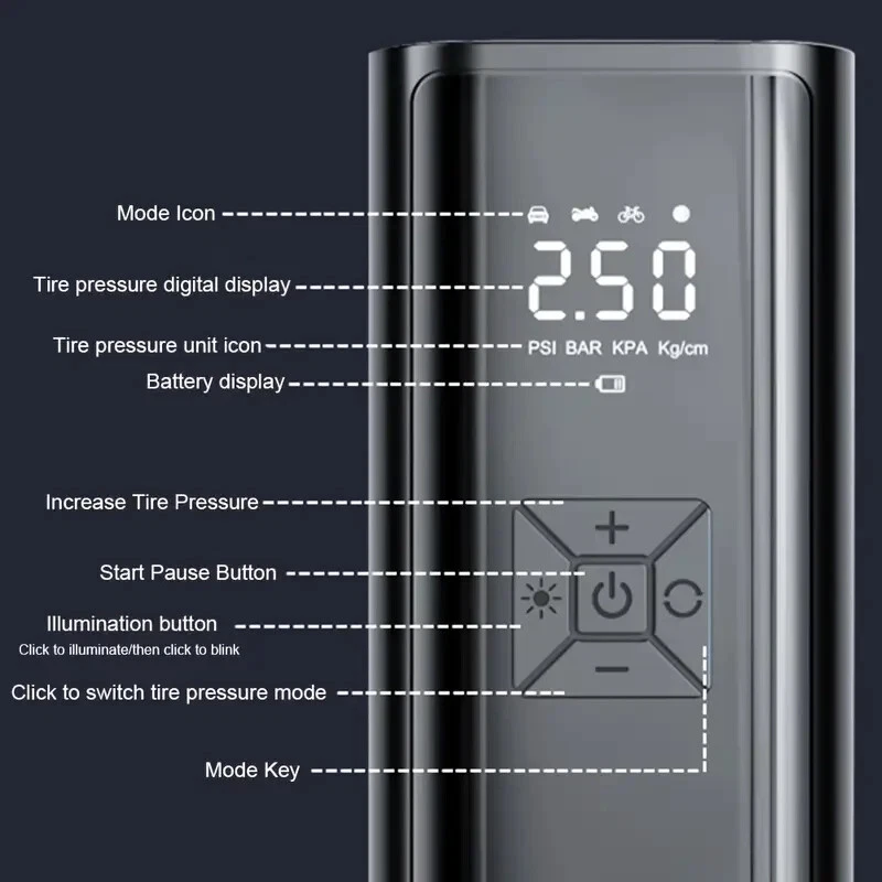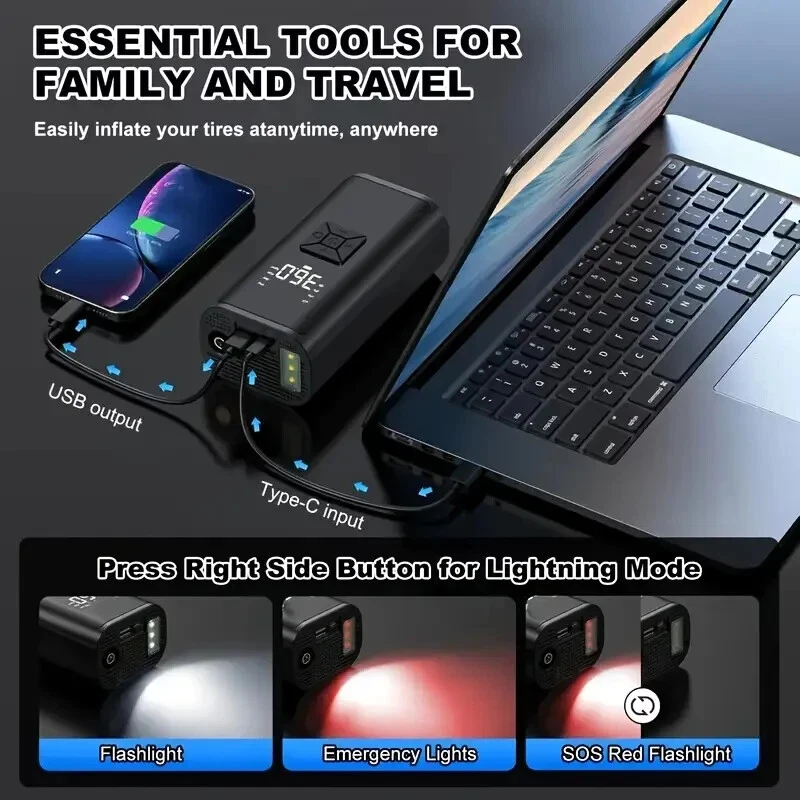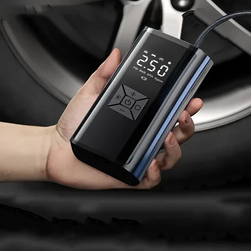 High-Power Portable Car Tire Inflator with Auto-Stop & LED Light - Fast, Convenient, Compact Automotive Air Compressor for Quick Inflation This portable car inflator is a must-have for every driver. With its wireless and cordless design, it can easily inflate your car's tires without the need for a professional mechanic. The digital display ensures accurate pressure readings, making it easy to inflate your tires to the perfect pressure. This air pump is designed for recharging (USB) and is 12V and 120 Watts of Power along with up to 150psi. It is available in a sleek black color and is highly portable, making it easy to carry around with you wherever you go. Whether you need to inflate your tires at home or on the go, this portable car inflator is the perfect solution. This product also charges electronic products such as mobile phones and tablets. Highly Rated (4.8 Stars) product