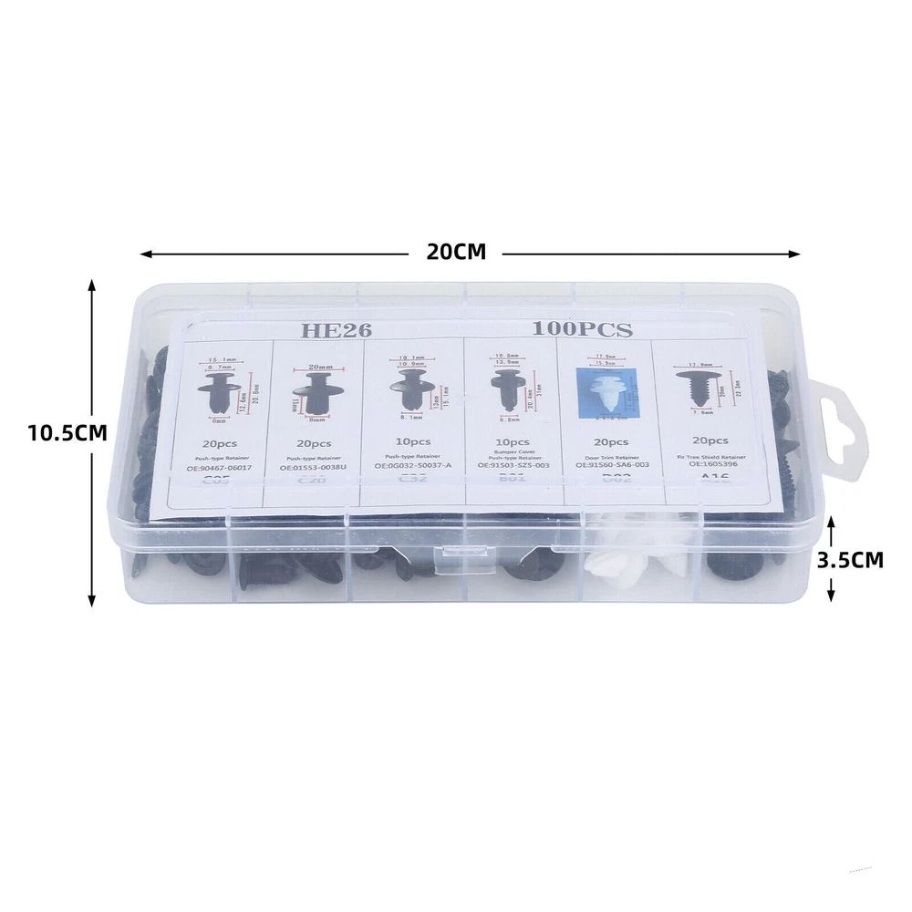 100Pcs Clip Trim Car Push Pin Rivet Bumper Door Panel Retainer Fastener Kit Description: Features: Various fasteners to meet the needs of different parts of the car. Used widely for car fender, bumper, door or other car surface. High quality plastic material, durable and long service life. Note: All vehicles have a range of different clips used on them. Different models have different sizes and there are no universal clips. Please check as much as possible before buying. Package including 100pcs Clips + 1 Plastic Box Clip of C05 Screw Type Clip Retainer Rivet Condition: Brand New Material: Black Nylon Size Approx: Head Diameter: 15mm Stem Length: 12mm Fits Into 6mm Hole For GM Replace 20426301 For Mazda Replace 9926-50-625 For Toyota Replace 90467-06017 For Toyota Replace 90467-06017-20 For Toyota Replace 90467-06017-41 For Auveco A14260 Clip of C20 Fender Liner Clip Splash Shield Blind Rivet Fits For Mazda Replace FB01-56-964 Fits For Honda Replace 90675-SB3-003 Fits For Nissan Replace 63876-95596 Fits For B16 B18 B18C B20 H22A EK9 EG6 Fits For Accord Civic Prelude CR-V Del Sol CRX Fits For INTEGRA GSR S2000 AP1 MUGEN Fits For TYPE R Si Condition: Brand New Material: Black Nylon Size Approx: Head Diameter: 20.6mm (0.81") Stem Length: 9.5mm (0.37") Fits Into 8mm (0.32") Hole For Auveco A16000 Clip of C32 Push-Type Retainer Black Nylon Head Diameter: 20mm Stem Length: 13mm Fits Into 8mm Hole Fits For Mazda 6 2002-2006 Fits For Mazda 323 1998-2003 Fits For Ford Aspire Fits For Mazda Replace B092-51-833 Fits For Ford Replace MB-455-56143 Fits For Kia Replace MB455-56-143 Fits For Nissan Replace 09409-09302 Fits For Hyundai Replace 86590-28000 For Auveco A17632 Clip of B01 Front & Rear Bumper Retainer Push Type Clip Condition: Brand New Material: Black Nylon Head Diameter: 20mm Stem Length: 18mm Fits Hole Size: 10mm For Honda Replace 91503-SZ5-003 (1996-On) For Acura Replace 91503-SZ5-003 For Auveco A20564 For PAS9282, PAS938 Clip of D02 Interior Trim Board Retainer Clip White Nylon Top Head Diameter: 13mm Middle Head Diameter: 16mm Bottom Head Diameter: 18mm Stem Length: 15mm Stem Diameter: 8.5mm x 8.5mm Overall Length: 20mm Fits For GM Replaces 94858299 Fits For Geo Prizm 1998-On Fits For Toyota Replaces 90467-10161 Fits For Sienna, Solara & Tercel 1990-On Fits For Previa 2007-On, Corolla 2003-On Fits For Lexus LS460, LS460L 1990-On For Auveco A18876 Clip of A16 Radiator Yoke, Fender & Bumper Shield Retainer Christmas Tree Type Clip Black Nylon Head Diameter: 17.8mm Stem Length: 20mm Stem Diameter: 7.6mm For GM Replaces 1595864, 1605396 For Ford Replaces 388577S For Ford Replaces W705589-S300 For Auveco A11146, A15414 Shipping: All items will be checked before packing. All items are new and of high quality. 1. Can you tell me when my order will be shipped? Actually we will ship the item within 1 business day after receiving orders, excluding weekends and public holidays. But USPS need to take longer time to update tracking info and arrange delivery during the challenging time for now. If your order was not shipped more than 3 business days, please contact us with your order number to get quick support. 2. My item has not arrived, what's taking so long? Sometimes items take longer than expected, especially if it's going far or to rural area. Check with your post office to see if your item has been held up. Sometimes USPS will not update a tracking number until it has arrived at its destination. If your item still has not arrived after a few days, let us know so we can double check for you and help solve it asap. Payment: 1. Instant PayPal payment is the preferred method of payment. We also accept payment via PayPal, DebitCard, Visa, MasterCard, Discover. 2. Items will be shipped to your eBay address. Please make sure it is correct. 3. If you want to ship to other address, please change your PayPal shipping address before you make payment. 4. Payment must be received 4 days after auction ended. Returns: 1. Customer satisfaction is our top goal. We believe our items are so outstanding. All products are quality checked. They are new and in good condition when shipped to our customers. We are convinced you will be happy with your Purchase. 2. We offer free return & money back guarantee. If you are not satisfied with your purchase for any reasons, you can return the item for refund or replacement/exchange. All returns must include the original packaging. 3. Please contact us first if you have any problems/questions/concerns. We will be happy to resolve any issues you may have in a cordial and friendly manner. Any items damaged because of incorrect installation will not be refunded. Please contact us for return or troubleshooting help prior to returning any products. 4. We appreciate your Postive Feedback, and will do the same in return. DO NOT leave negative feedback without first communication with us. Please allow max 2 business days for us to response. About Feedback: 1. When you satisfied with our product and services please leave us positive feedback. 2. If you have ANY questions with shipping, product or service, please Contact Us first before leaving feedback/write a review or filing a return case. We will solve the problem! If you have ANY questions with shipping, product or service, please Contact Us first before leaving feedback/write a review or filing a return case. We will solve the problem! We always put our customers first and your satisfaction is guaranteed. We offer free returns with any orders within 30 days from the date of delivery. No restocking fees, no administrative fees, no return shipping fee, and no hassle! We will email you when a prepaid return label is ready to download from your ebay account. You just have to print it out and drop the package off at a USPS facility. When we get it back, you will be notified and credited for the full price of the items/products that are returned. Since the shipping fees go directly to the delivery service, we are not able to refund 