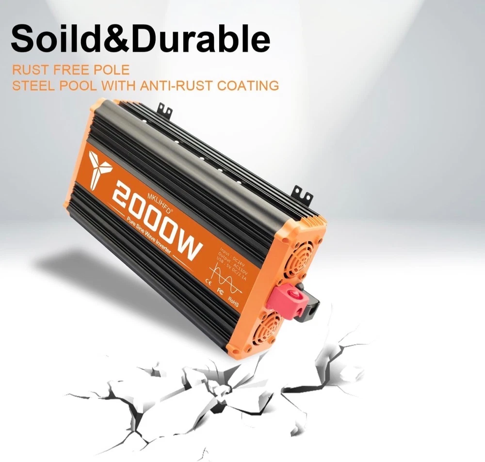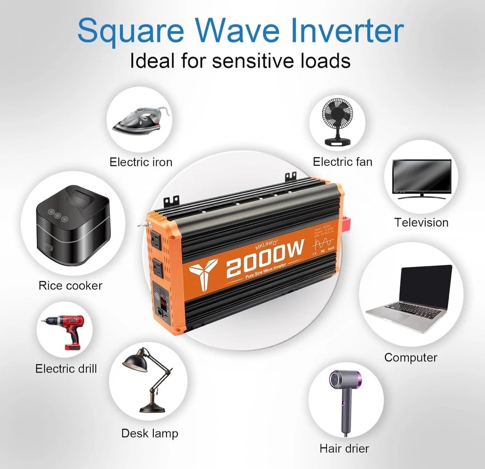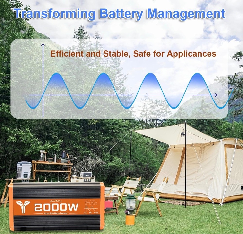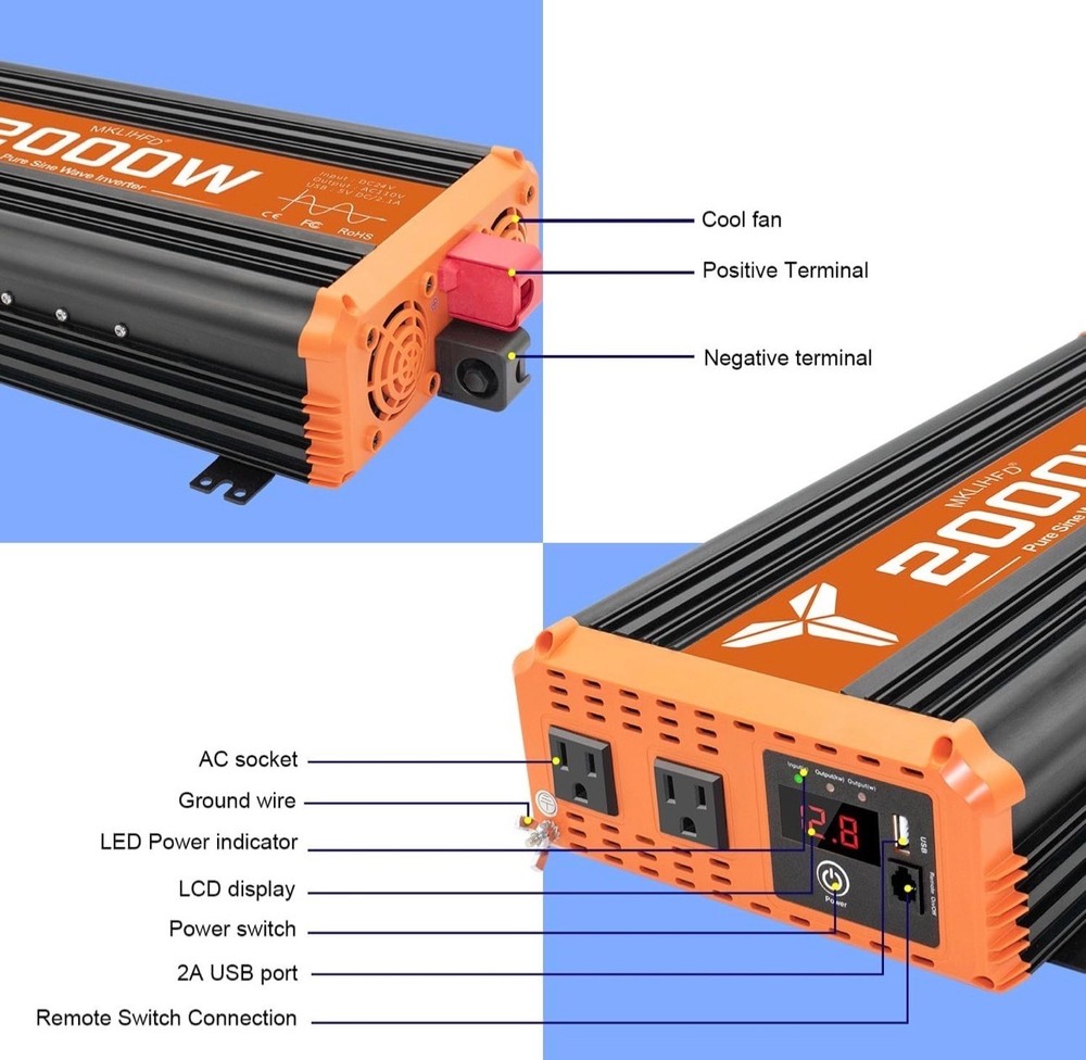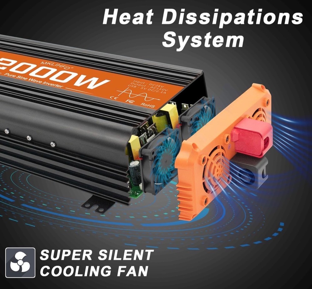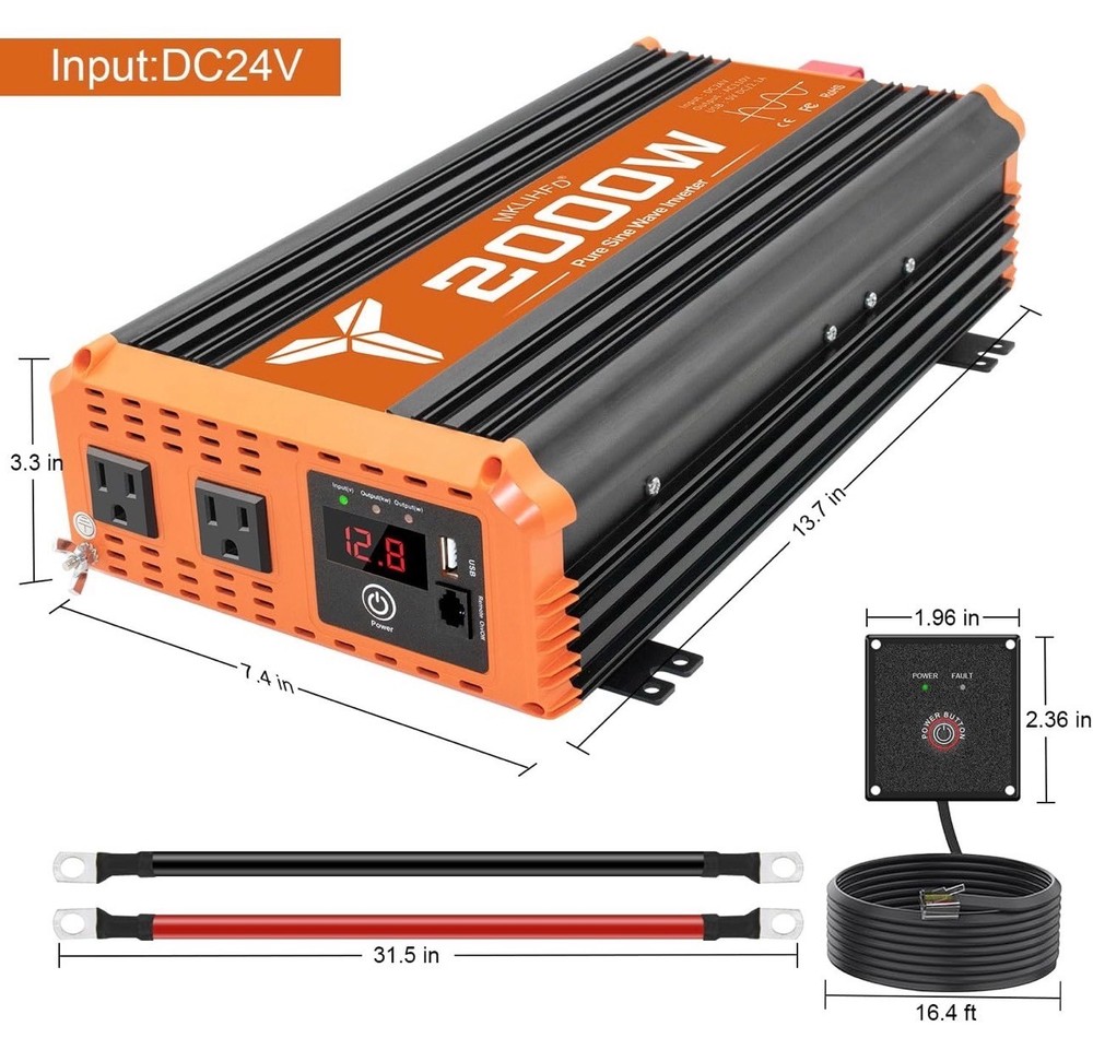 #3523 2000 watt Pure sine Wave car Inverter 24V DC to 120V AC, 4000W Surge Peak Power, Inverter for RV, Truck, Solar, Campers with 2 AC Outlet,Remote Control Compatible with Lithium Battery Brand MKLIHFD Recommended Uses For Product Vehicle Power Source Battery Powered Wattage 2000 watts Voltage 120 Volts Peak Output Power Watts 4000 {2000w inverter} Provides 2000 Watts continuous DC to AC power output,2000 watts continuous power, 4000 watts peak power. Pure sine wave inverter converts 24V DC to 110V/120V AC Power, Connect DC battery cables directly to your car vehicle's battery. Please confirm the rated power and starting power of your devices before purchasing. {Safety protection} This 2000 watt inverter has Multiple protections: overvoltage, undervoltage, overload, short circuit, overheating and soft start technology. Equipped with dual cooling fans, excellent heat dissipation performance. Ensure your safety during use and extend the service life of the inverter. {Multiple usage scenarios}Compatible with lithium and standard 24 V batteries; perfect for car,vehicles,off-grid solar, RVs, trucks, camping, emergency backup, tailgating, and more—power appliances like microwaves, TVs, freezers, ovens, phones, laptops, etc {Cooling Fan} The inverter for car uses an intelligent fan system to dissipate heat during the entire operation. When the internal temperature of the machine reaches a certain level, the fan rotates to effectively reduce the temperature. {Remote Control } It's easier and more comfortable to check the 24V power inverter's operating status from anywhere, anytime, making it safer for you to use. Equipped with a remote control, it ensures that you have the information you need to keep everything running smoothly, whether you're camping, traveling, or powering up your equipment at home.