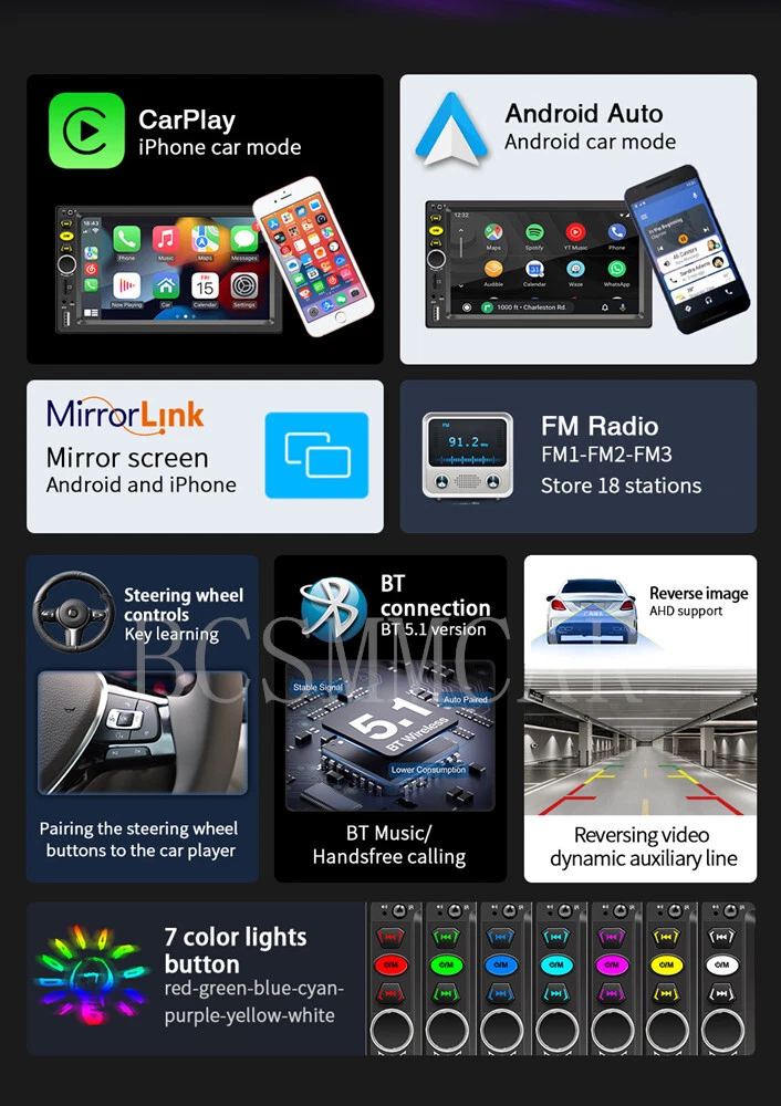 Product View Detail 7" 2DIN For Apple Carplay Car Stereo Radio Bluetooth Touch screen SD USB AUX-IN FM Video MP5 Player With 4LED Rear Camera Kit Note:Not is universal , Please check with your car panel's size !!! Supports CarPlay function on Apple phones and Android Auto function on Android phones, allowing you to navigate, make calls, send and receive messages, and listen to your favorite songs. All of this is integrated into the central control display screen inside the car. Bluetooth 5.1 version compared to the previous generation: 1. More stable signal; 2. Most mobile phones can automatically pair; 3. Lower power consumption and more environmentally friendly. Product Introduction: Type: Car MP5 Radio frequency: FM 87.5-108.0MHz AM522-1620KHz (AM display blocked on website) Output power: 60Wx4 Working voltage: 12~14.4V Working temperature: -10~60 ℃ Bluetooth version: 5.1 (default name: Car BT) Display resolution: 800x480 Screen size: 7 inches Installation size: 178x103MM Total number of boxes: 20 units Single unit weight: 0.682KG Net weight of the whole box: 13.64KG Audio format: MP3/AAC/APE/OGG/M4A/RA/WAV Video format: H263/H264/H265/DIVX HD/AVI/FLV/MKV/MPEG/MP4/WMV9/VC/ASF/TS/QT Image format: JPEG/PNG/BMP/GIF/TIFF Language parameters: English/Chinese/French/German/Italian/Japanese/Portuguese/Russian/Spanish Accessories: 1. Host 2. Manual 3. Power cord 4. Remote control 5.4LED Rear Camera Shipping Policy Payment Method Returns Policy Shipping Policy Payment Method Returns Policy Copyright © 2017 DataCaciques Home Payment Shipping About us Contact us BCSMMCAR Store Categories Store Categories Other Product View Detail 7" 2DIN For Apple Carplay Car Stereo Radio Bluetooth Touch screen SD USB AUX-IN FM Video MP5 Player With 4LED Rear Camera Kit Note:Not is universal , Please check with your car panel's size !!! Supports CarPlay function on Apple phones and Android Auto function on Android phones, allowing you to navigate, make calls, send and receive messages, and listen to your favorite songs. All of this is integrated into the central control display screen inside the car. Bluetooth 5.1 version compared to the previous generation: 1. More stable signal; 2. Most mobile phones can automatically pair; 3. Lower power consumption and more environmentally friendly. Product Introduction: Type: Car MP5 Radio frequency: FM 87.5-108.0MHz AM522-1620KHz (AM display blocked on website) Output power: 60Wx4 Working voltage: 12~14.4V Working temperature: -10~60 ℃ Bluetooth version: 5.1 (default name: Car BT) Display resolution: 800x480 Screen size: 7 inches Installation size: 178x103MM Total number of boxes: 20 units Single unit weight: 0.682KG Net weight of the whole box: 13.64KG Audio format: MP3/AAC/APE/OGG/M4A/RA/WAV Video format: H263/H264/H265/DIVX HD/AVI/FLV/MKV/MPEG/MP4/WMV9/VC/ASF/TS/QT Image format: JPEG/PNG/BMP/GIF/TIFF Language parameters: English/Chinese/French/German/Italian/Japanese/Portuguese/Russian/Spanish Accessories: 1. Host 2. Manual 3. Power cord 4. Remote control 5.4LED Rear Camera Shipping Policy Payment Method Returns Policy Contact US Shipping Policy All items will be checked before packing. All items are new and of high quality. Item will be shipped within 1 business days upon receipt of payment, excluding weekends and public holidays. If to USA,we will ship your order by USPS,it will take about 8-12 working days to you,and you can track it on line. If to other country,we will ship your order by China Post or Singapore Registered Air Mail,it will take about 14-21 working days to you,you aslo can track it on line. Delivery time is about 14-28 business days and it may take up to 8 weeks . Payment Method We accept payment by PayPal only ! Payment should be completed within 5 days after buyer places the order,or else an unpaid case will be opened in order to cancel the transaction. If you can not pay in time, please contact us. e-check from PayPal will only be processed once the payment clears. All of the items will be shipped to buyer's EBAY address,please confirm your address on Ebay before you buy.Your order will be usually shipped out the same or next business days once the payment is made and cleared. Returns Policy 30-day Warranty with Exchange for defective, malfunctioned, incorrect or parts-missing items. Please notify us and return the item with all parts and accessories packed and marked "FOR EXCHANGE" within 14 days of receipt. If defective, malfunctioned or parts-missing items are no longer available, a refund may be issued. All returning postage costs will be the responsibility of the buyers under all circumstances. Contact US If you encounter any problems about anything, please feel free to contact us and we will do our best to assist you solve the issue. If you are not satisfied in anyway, please feel free to let us know and give us a second chance to correct it before you decide to leave any neutral or negative feedback. Please contact us through eBay link if you have any questions. We will reply you within 24- 48 hours. Please check you spam mail if no response for 48 hours. Home Payment Shipping About us Contact us
