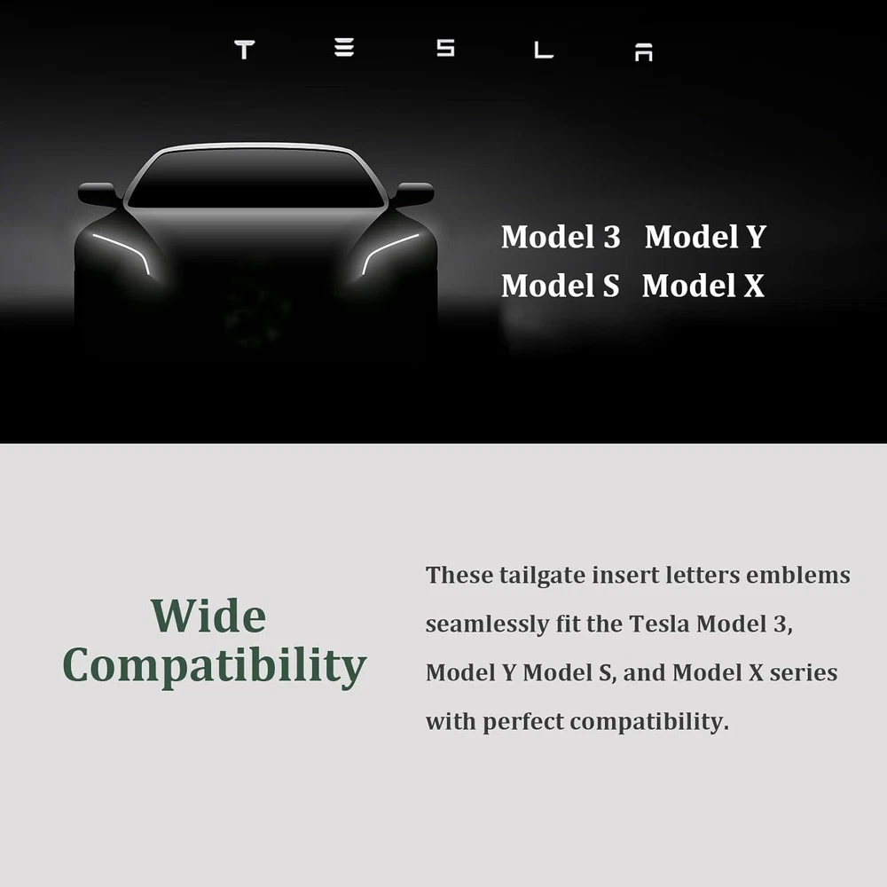 About this item -- Szie:20 x 0.8(in) -- A raised solid badge letter with a nice bevel to fit curved, complex recessed surface create a cool 3D. Heavy duty and Shiny decal really make the Front Door POP in a subtle way. -- Easy to install, clean and dry the tailgate, lightly apply then fine tune any adjustments and firmly press the letter down to seat it. Doesn’t request any technical skills, can be finished within minutes. -- Essential Accessories an d Perfect for Tesla. Tips: Clean the Surface before install the Letter Emblems --The Decals Customized for Tesla Model Y Model 3 Model X Model S -- Never Fade & Waterproof: Made of High quality zinc alloy. Simple but outstanding car 3D modelling; Exquisite design, transmit the endless fun in your life. -- Essential Tesla accessories: it will catch the passer-by's eye to your Tesla; Great accessories for Tesla fans.