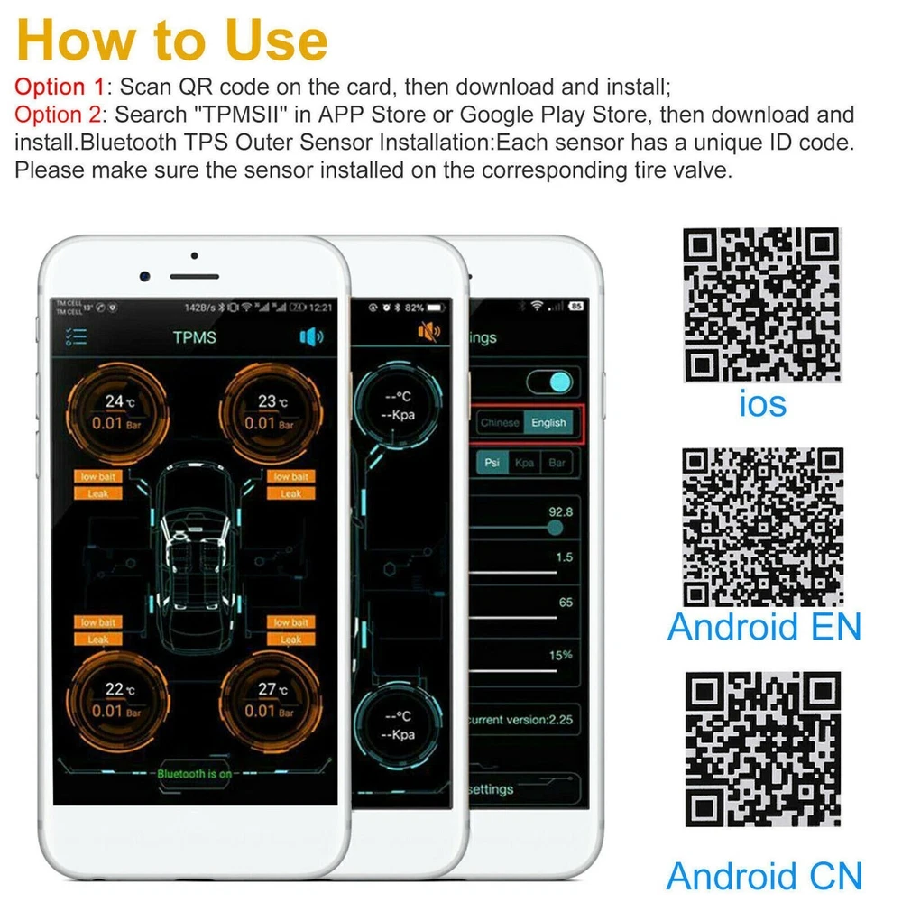 You may also like Solar Car TPMS LCD Display Tire Pressure Monitoring System w/ 4 Internal Sensors 39.27 USD 56.1 USD 4.0 USD 30% off Wireless USB TPMS LCD Car Tire Pressure Monitoring System + 4 External Sensors 40.8 USD 4.0 USD Wireless Solar TPMS LCD Car Tire Pressure Monitoring System + 4 External Sensors 28.71 USD 4.0 USD Wireless Solar TPMS LCD USB Car Tire Pressure Monitoring System 4External Sensor 36.17 USD 4.0 USD TPMS Factory 42607-06020 Tire Pressure Sensor PMVC010 Fits Toyota Lexus Scion US 20.39 USD 29.13 USD 4.0 USD 30% off Car TPMS Bluetooth 4.0 Tire Pressure Monitoring System 4 External Sensors US 47.5 USD 67.85 USD 4.0 USD 30% off Product Description Product Features: Dynamically Monitor: Dynamically monitors all tire pressure and temperature, improves fuel efficiency, and prolongs tire life and ensures driver safety. Money and Time Saving: The Bluetooth external TPMS sensors which are with long-lasting battery life for almost 3~5 Years can help save your fuels up to 11 cents per gallon with properly inflated tires. And you can maintain your car tire by yourself. Easy Installation: Anyone can set up in 3 easy steps in just 10 minutes. 1. Remove tire valve caps, put in anti-theft screws;2. Install the outer sensor on the tire valve in order; 3. Hold the sensor, tighten the anti-theft screw. (Each sensor has a unique ID code. Please make sure the sensor installed on corresponding tire valve). Convenient Operating System: The Tire Pressure Monitoring System is designed for cellphones, just connect your smartphone with APP for iOS and Android through the application of built-in Bluetooth 4.0 or above. Precision Direction System: 4 Sensors with waterproof and anti-corrosion, anti-theft technology, making it fully qualified for rainy days. High sensitivity, good accuracy for measuring pressure and temperature. How to Use: Option 1: Scan QR code on the card, then download and install; Option 2: Search "TPMSII" in APP Store or Google Play Store, then download and install. Bluetooth TPS Outer Sensor Installation: Each sensor has a unique ID code. Please make sure the sensor installed on the corresponding tire valve. Note: 1. Please follow the mark and install the sensor on the corresponding tire. Please save the installation tools (screws and wench) in the car, for installing or un-stalling sensors. After sensor installation, please check if there / 's tire leakage. 2. Support a cellphone with Bluetooth 4.0 or above. Do NOT support Cellphone with Bluetooth lower than 4.0. Product displays by cellphone. During driving, please be careful when viewing tire pressure and temperature on a cellphone. If tire pressure accelerates down or up continuously, please stop the car and check if there's any problem with the tire. 3. This product can read tire pressure and temperature, but it cannot avoid sudden accidents caused by the tire. It's important to use a tire with high quality. Slightly tire leakage makes tire pressure decreases over time is normal. It has nothing to do with this product installation. 4. Do not connect to your phone before you installed the sensors(the sensor will only be activated with high pressure), otherwise, it will connect failed or show errors. Product Specification: Type Bluetooth Wireless Tire Pressure Monitoring System Bluetooth Version Bluetooth 5.0 Working Voltage 3V Quiescent Current Ём14-1.8ІЬA Bluetooth Operating Frequency 24GHz Response Time Ём5s Display Mode APP Waterproof Rating |P67 Working Humidity 95%MAX Tire Pressure Detection Range 10-1300kPa Tire Pressure Detection Accuracy ЁР10kPa Temperature Detection Accuracy ЁР3Ёц Working Temperature -30Ёц~+70Ёц Storage Temperature -30Ёц~+70Ёц Battery Capacity 140mAh Battery Life 3-5 years Package Includes: 4 x Bluetooth5.0 TPMS Sensors 1 x Card with App QR Code 1 x Wrench 1 x User Manual Payment Shipping Returns 1 . We accept Paypal only. 2 . We only ship to your Paypal's address, please ensure your shipping address on your paypal account is correct. If you have any change for address, please inform us in ebay note. 3 . Payment must be fulfilled within 7 days after purchase. All non-paying orders will receive an unpaid reminder from eBay. Once we have received cleared full payment, your items will be dispatched in 1-3 days. It normally takes : 7-14 business days for US, UK, Canada, Australia, Asian countries. 14-21 business days for Spain, German, Middle East countries. 18-25 business days for Russia, Brazil, Italy, France, European countries. 24-32 business days for South American countries. We send items by air mail to the buyer without track number. There maybe some delay due to flight, holiday, weather, local post, local natural disaster impact. if your shipment delays, we hope you can be patient, and at the same time contact us, we will try our best to help you. Import duties, taxes and charges are not included in the item price or shipping charges. These charges are the buyer's responsibility. Please check with your country's customs office to determine what these additional costs will be prior to bidding / buying. If any item is defective upon receipt or do not work, please contact us for the return address, return is accepted within 30 days after the buyer receiving the item. Returned item has to be in its original condition. Buyer is responsible for return shipping costs . After receiving the return we will make a replacement depends on our available stock, if not available, a refund will be issued. Payment 1 . We accept Paypal only. 2 . We only ship to your Paypal's address, please ensure your shipping address on your paypal account is correct. If you have any change for address, please inform us in ebay note. 3 . Payment must be fulfilled within 7 days after purchase. All non-paying orders will receive an unpaid reminder from eBay. Shipping Once we have received cleared full payment, your items will be dispatched in 1-3 days. It normally takes : 7-14 business days for US, UK, 