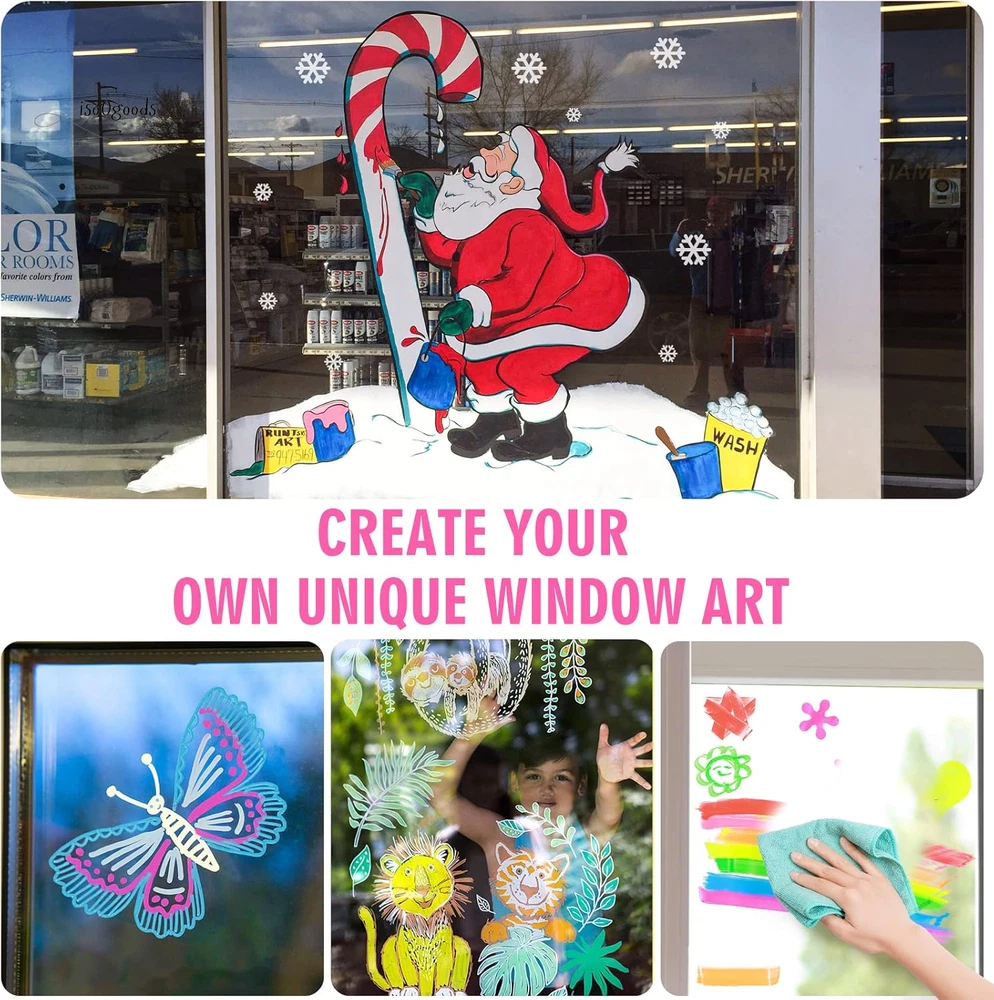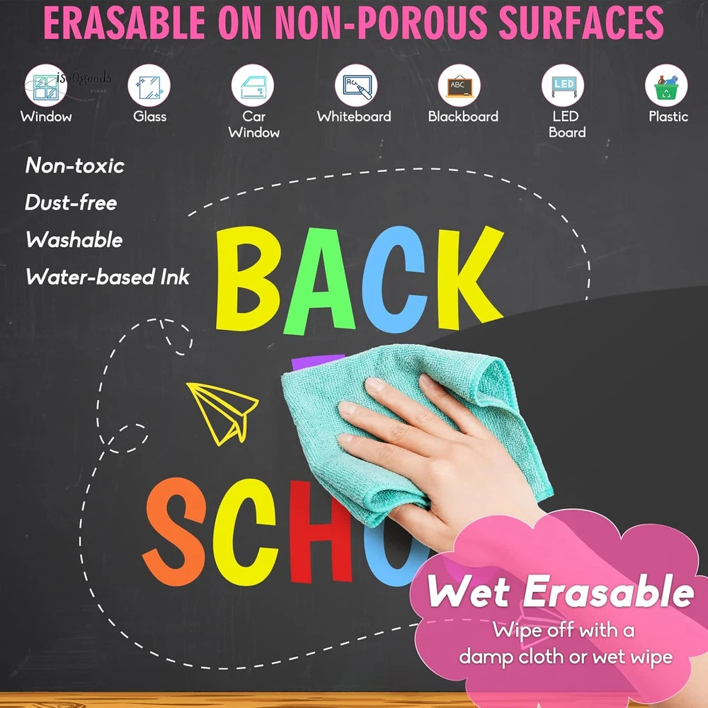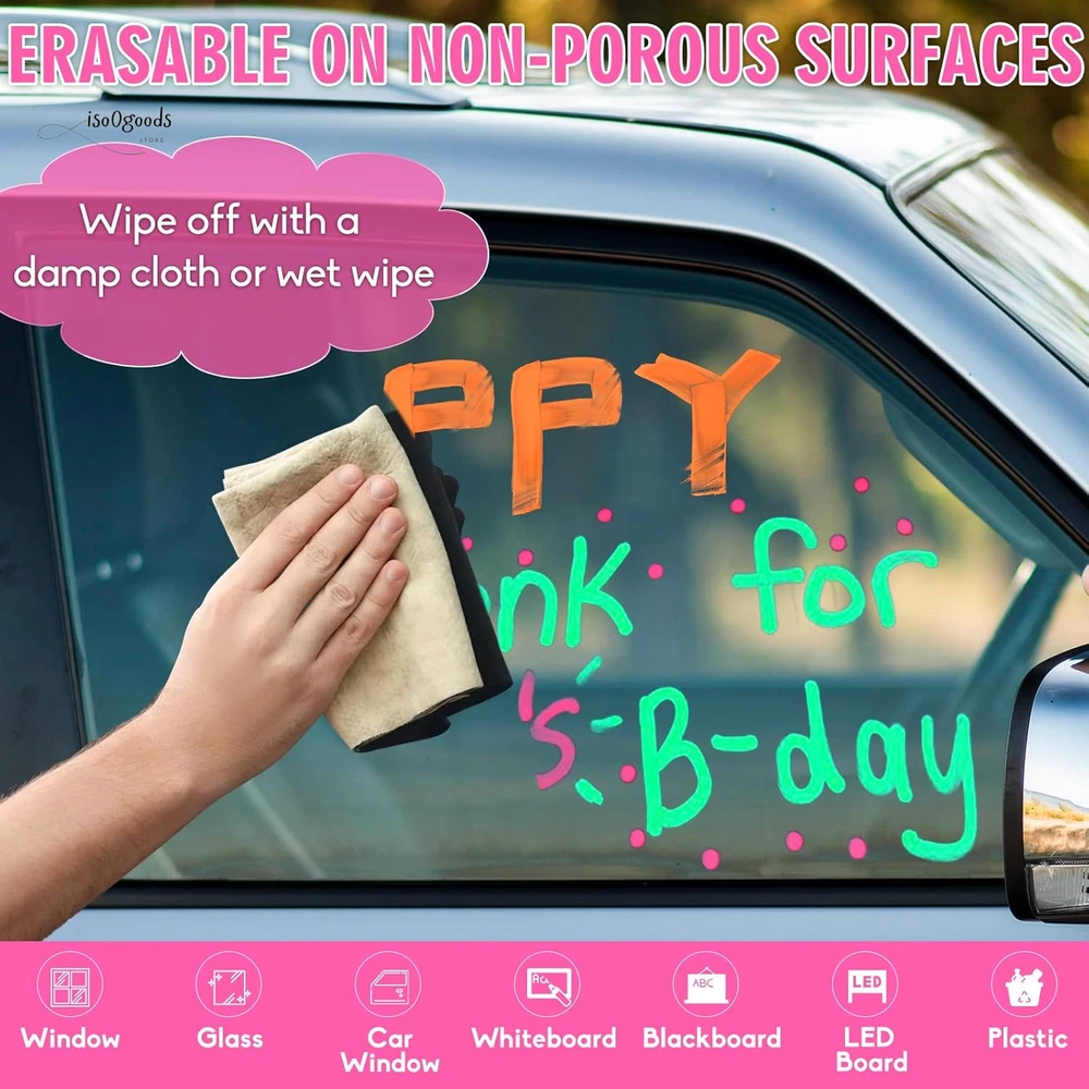 Brighten Up Your Creativity with Premium Window Markers! 🌟 High-Quality Window Markers: These chalk car window markers glide effortlessly on most non-porous surfaces, leaving smooth, even lines without the streaks of regular dry-erase markers. Erasable, water-based, non-toxic, odorless, and dust-free with quick-drying, bold coverage. 🎨 Bold & Vibrant Colors: With a set of 8 vibrant, fully opaque colors, these markers are perfect for bistro menu boards, café menus, lunch menus, and LED boards, grabbing the attention of customers and passersby. The 10mm nib offers 3 versatile tips—wide, bold, and fine—to meet all your creative needs. 💧 Easy Wet Erase: Effortlessly remove mistakes or designs from non-porous surfaces with a damp cloth—no dusty mess! Always test on a small area of porous chalkboards, as they may absorb ink and leave residue. 🚗 Perfect for Car & More: These markers are ideal for decorating car windows, windshields, glass doors, mirrors, and more. Great for graduation, birthdays, anniversaries, weddings, DIY projects, and notes on mirrors or calendars. Indoor and outdoor use for all occasions. Clean-up is simple—just use a wet cloth or rag with a little soap! 👍 Satisfaction Guaranteed: Designed for durable and vibrant results, let the chalk paint dry for longer-lasting designs. Use protective plastic film to preserve your artwork. Whether for gifts or creative decoration, this set of craft supplies is a must-have. Why Choose These Chalk Window Markers? Dust-Free & Mess-Free: Enjoy clean and precise designs without the hassle. Versatile Uses: Suitable for car decorations, menu boards, gym boards, chalkboards, and more. Easy to Use & Clean: Perfect for beginners and experts alike. Bring your ideas to life with these vibrant, washable window markers. Order now and make every surface your canvas!