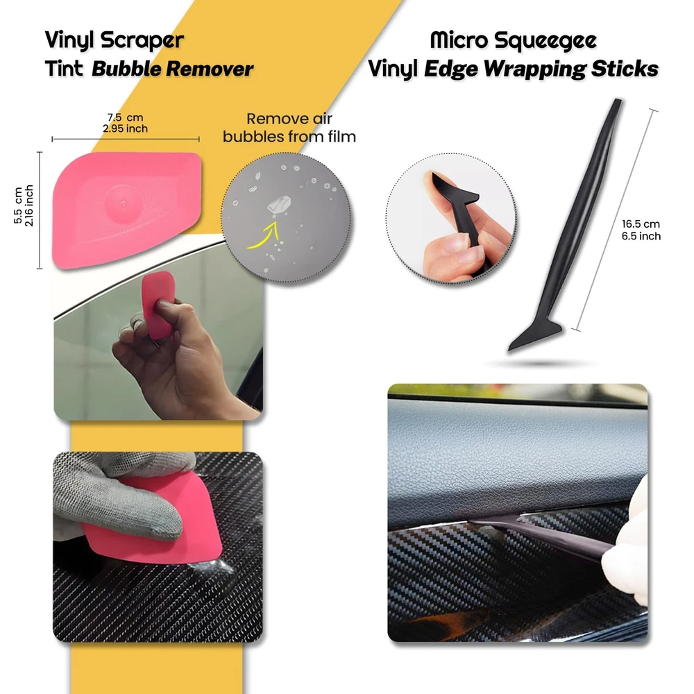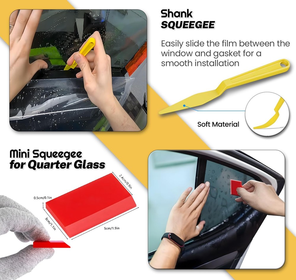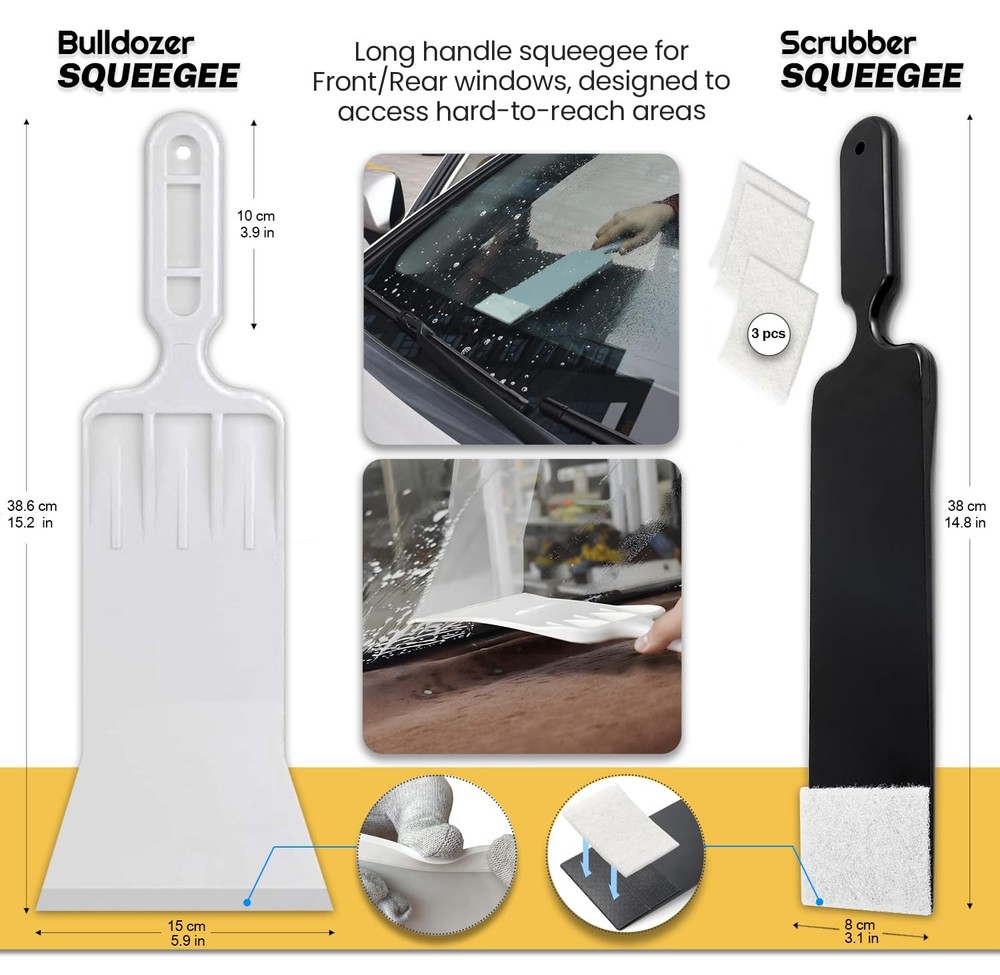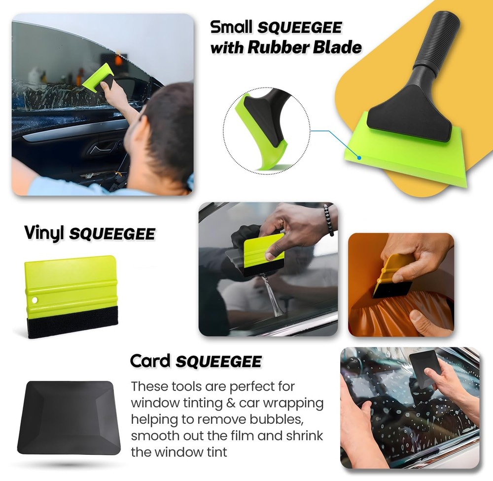 Are you ready to give your car that sleek, professional look with the best window tinting tools on the market? Look no further! Our Window Tint Tool Kit is your ultimate companion for achieving perfect tints on your car windows, rear window, and even home windows with ease. Whether you're a DIY enthusiast or a professional installer, this kit has everything you need to get started. Our comprehensive window tint squeegee kit includes a variety of tools designed to make your tinting projects hassle-free. The window tint squeegee is perfect for smoothing out bubbles and ensuring a flawless finish. Need to reach those tricky spots on the rear window? No problem! The tint long reach squeegee and tint bulldozer squeegee are here to help. With their extended handles and ergonomic design, you'll easily tackle any hard-to-reach areas. Got stubborn old tints that need to be removed? Our tint removal kit has you covered. The squeegee rear window tool and bulldozer tint squeegee make removing old film a breeze. Plus, the window tint scrub pad ensures every surface is clean and ready for a fresh application. Our tint tool kit isn't just for windows! It’s also an excellent car vinyl wrap tool kit, making it the perfect choice for car wrapping enthusiasts. The car window tint tools included are versatile and can handle both tinting and wrapping tasks with ease. The window film installation kit comes with all the essential tinting supplies you need, including a professional window tint tool kit, car window tint installation kit, and even a home window tint kit. This means you can use our window tint tools professional-grade quality not just for your car but for home projects too. The kit para polarizar vidrios de carros (car window tint kit) is perfect for everyone including our Spanish-speaking customers, ensuring everyone can enjoy the benefits of our top-notch tools. With this car tint windows kit, you'll get everything from a bulldozer tint tool to a window tint squeegee bulldozer, prepared to handle any tinting challenge. Whether you're working on a windshield tint or rear glass tint, our window tinting squeegee tools are built to deliver results. The long tint squeegee and auto bulldozer squeegee are specially designed for back window tinting. The bulldozer back window tinting tool ensures you can reach every corner, leaving no bubbles or creases behind. Don't let inferior tools ruin your tinting project. Our window tint tools kit is designed to provide professional results every time. From the car window tint kit to the window tint installation kit, we’ve covered all your needs. Ready to take your tinting game to the next level? Grab our window tint application kit today and join the ranks of satisfied customers who trust our window film tools for their tinting and wrapping needs. Transform your vehicle and windows with ease using our top-of-the-line tinting tools. Happy tinting! Professional Window Tint Car Kit: Our all-in-one window tint tools car wrapping kit includes all the essential tinting supplies you need for a flawless tint job. Perfect for beginners and pros, this car window tint kit ensures a smooth and bubble-free finish. Get the best out of your car tint kit now! Versatile Wrap Stick & Corner Squeegee Kit: Perfect for window tinting, wrap kit, Decals, and vinyl application in hard-to-reach areas, this window tint kit for cars features different terminal squeegees for small, round, and narrow spaces. Ideal as a window tint installation kit, perfect for car graphics decal, vinyl sticker application, and film wrapping, this car tinting kit has your back in all your tinting projects. Ergonomic Long Handle Bulldozer Squeegee: This multifunctional tinting squeegee easily reaches those tricky areas, sliding into gaskets and deep bottoms of front and rear windows. This tint kit for car delivers effective, professional assistance for smooth and precise window tinting kit applications and all your automobile needs. Long Handle Scrubber Paddle Squeegee: This long handle window tint squeegee comes with an attached scouring pad and extra felts, making prep cleaning for tinting a breeze. This scrubber tint tool is perfect for cleaning a variety of surfaces and works well with liquid detergents to gently yet effectively clean dirt or residue from delicate materials like vinyl, glass, and plastic. Felt Edge Squeegee for Vinyl: Designed for precision, this durable felt edge squeegee for window tint is ideal for applying car vinyl wraps. It efficiently removes bubbles, reducing the risk of scratches and protecting your vehicle’s paint and glass. This squeegee for tinting ensures a smooth, scratch-free finish while preventing damage to the wrap. Multipurpose Window Tint Squeegee: Made from high-quality silicone, this squeegee is one of the most practical window tint accessories designed for flawless window tint application. It glides effortlessly to eliminate bubbles and ensure a smooth finish. Additionally, it's excellent for cleaning glass surfaces, mirrors, and other flat areas, making it an essential tool for both tinting and general cleaning tasks. Premium Cutter Knife: Perfect for car vinyl wrapping, window tinting, and window stickers, this cutter knife features a high-quality stainless steel metal body and a secure auto-lock slider with a swivel lock. With 10 extra blades included, its durable sliding track ensures a secure grip, offering you a safe and precise cutting experience. Functional Shank Gasket Squeegee: This micro squeegee, with its slender design, simplifies window tinting, especially for the window gap and other inconvenience places, in tight spots like under car windows or door panels. This vinyl squeegee is ideal for window tinting, car graphics, vinyl stickers, and window film installation. Made from durable, flexible plastic. Plastic Scraper Window Tint Tool with Extra Razor Blades: Perfect for removing stickers, decals, and labels. Easily handles vinyl, glue, adhesives,