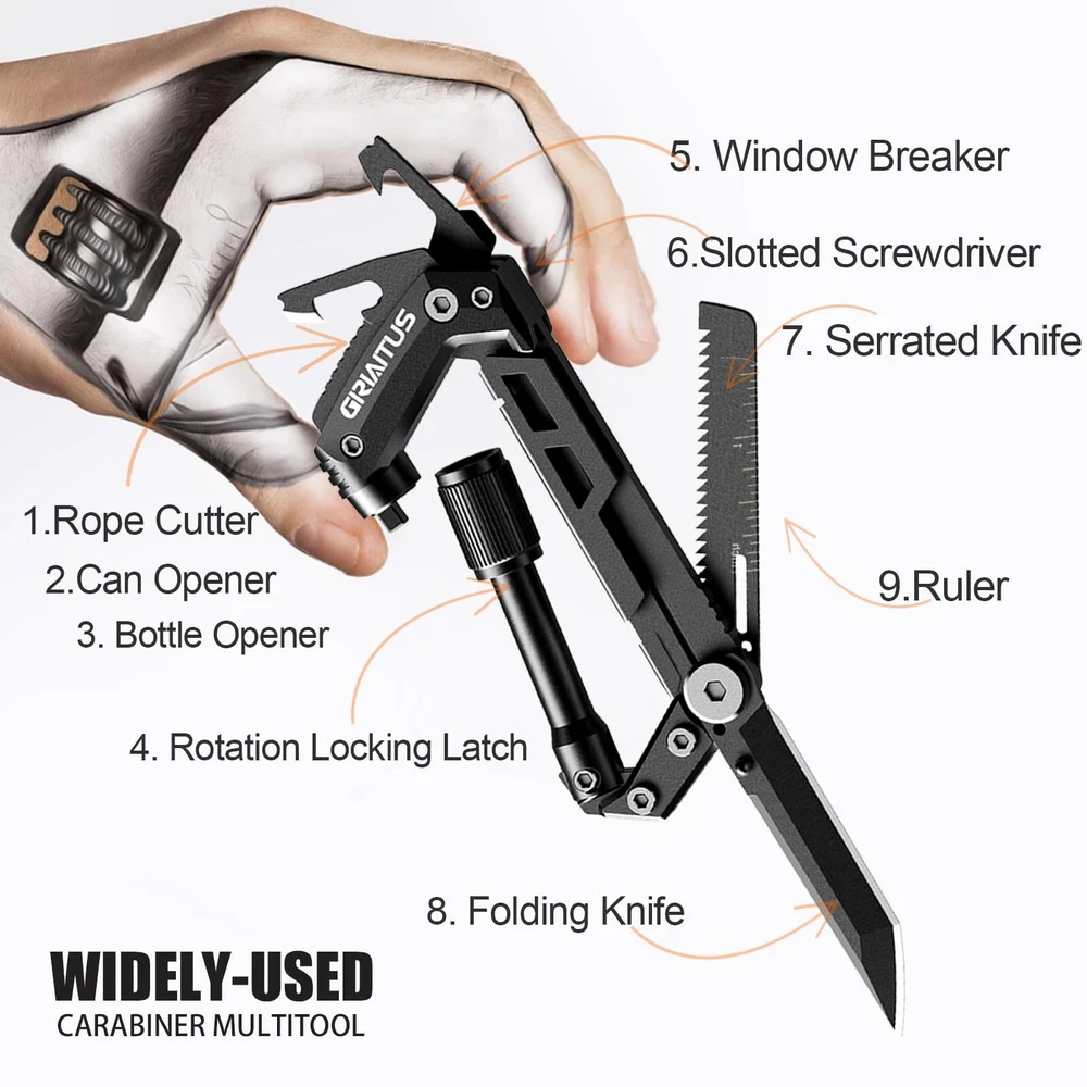 Multiple Functions: The heavy duty carabiner multitool caters to various outdoor and everyday carry, combining a folding pocket knife, serrated knife, rope cutter, slotted screwdriver, bottle opener, can opener, ruler, in one pouch package. Strong Locking Carabiner Tool: Our climbing carabiner knife combines strength, The hand twist-lock latch system ensures top-notch safety standards to keep climbers safe during their adventures. essential part of your toolbox, survival camping gear. Camping Accessories: The edc carabiner at hand with this multifunctional large carabiner clip tool. Whether hanging tent, hammock, hooks, hiking, backpacking, hunting fishing, outdoors bicycle, can be easy to attached to key chain, belt loops use Portable and Convenient: Steel edc pocket knives multi-tool carabiner, design with compact sized, liner locking design for folded army pocket knife which can be operated open or close with one hand, making it a versatile for adventures and daily life. Gifts for Men: This tactical carabiner knife with sleek edc multi-tool is an ideal stocking stuffers gifts for men, friends, family, and loved, birthday, father's day gift, thanksgiving, christmas business gifts and office gifts for men and women. etc.
