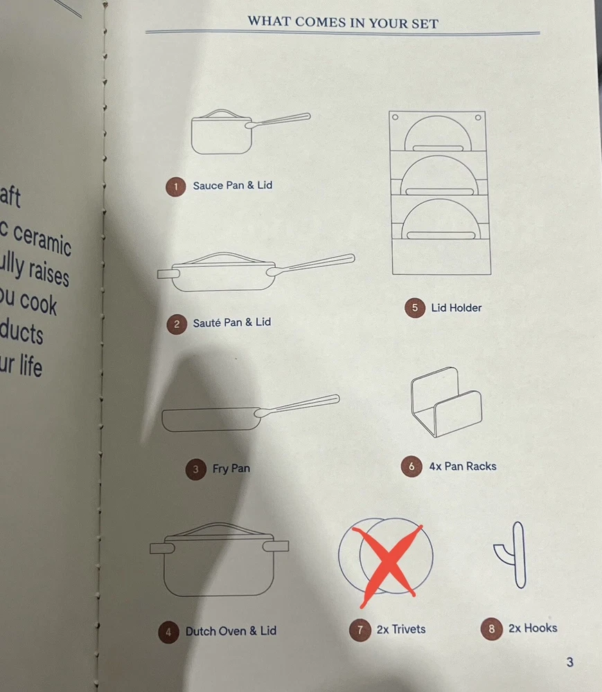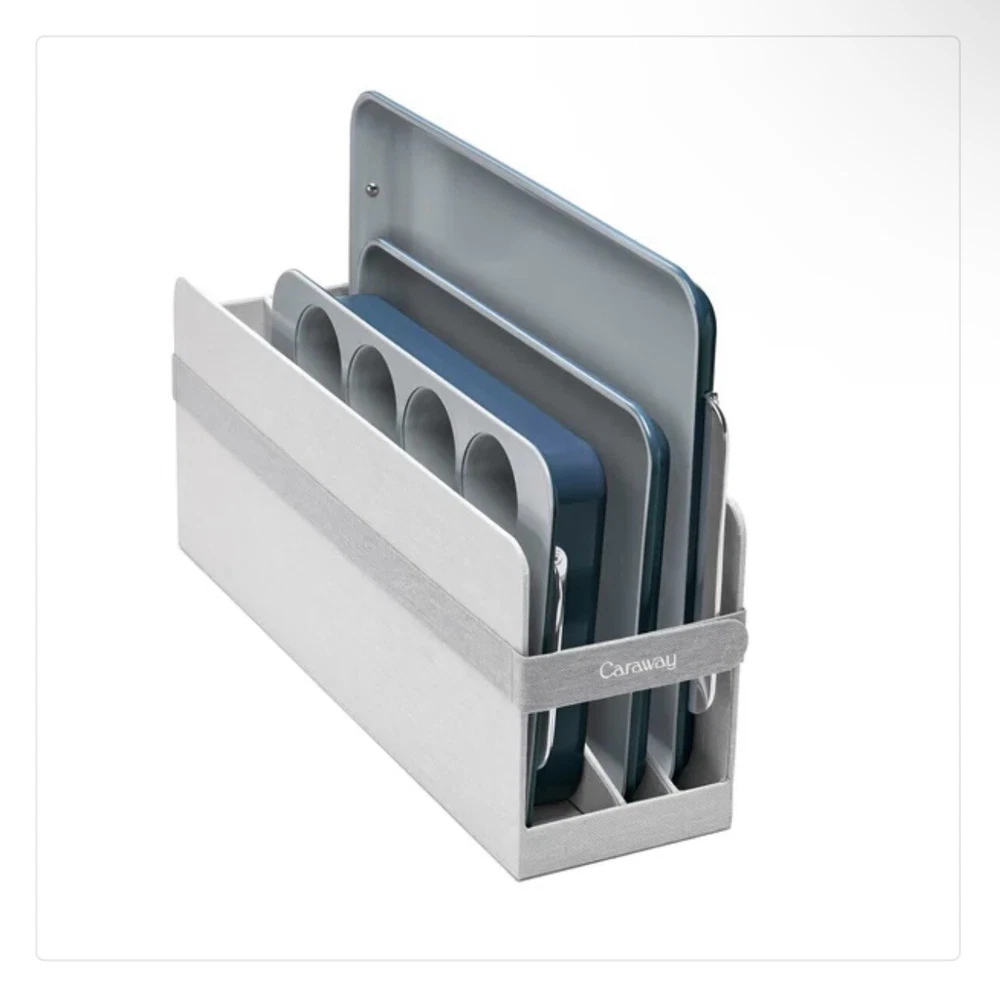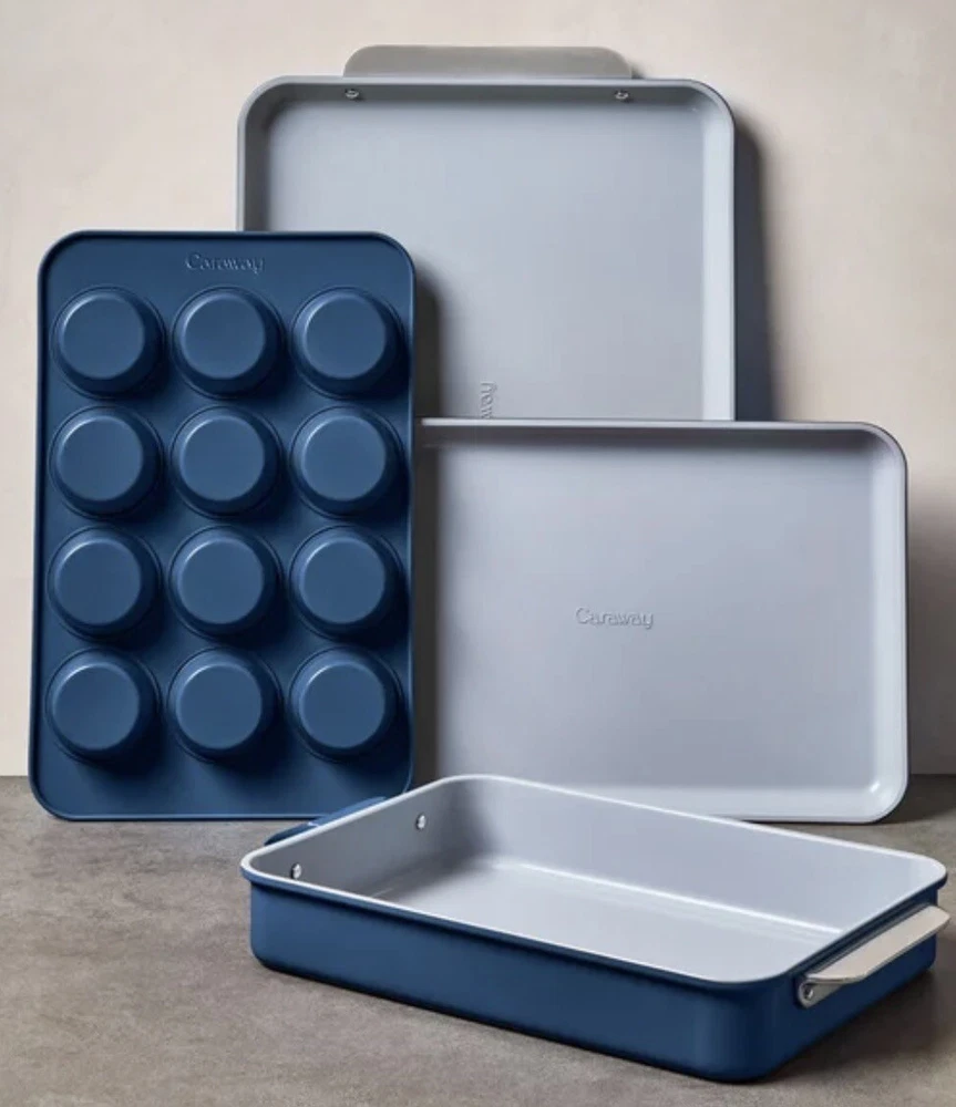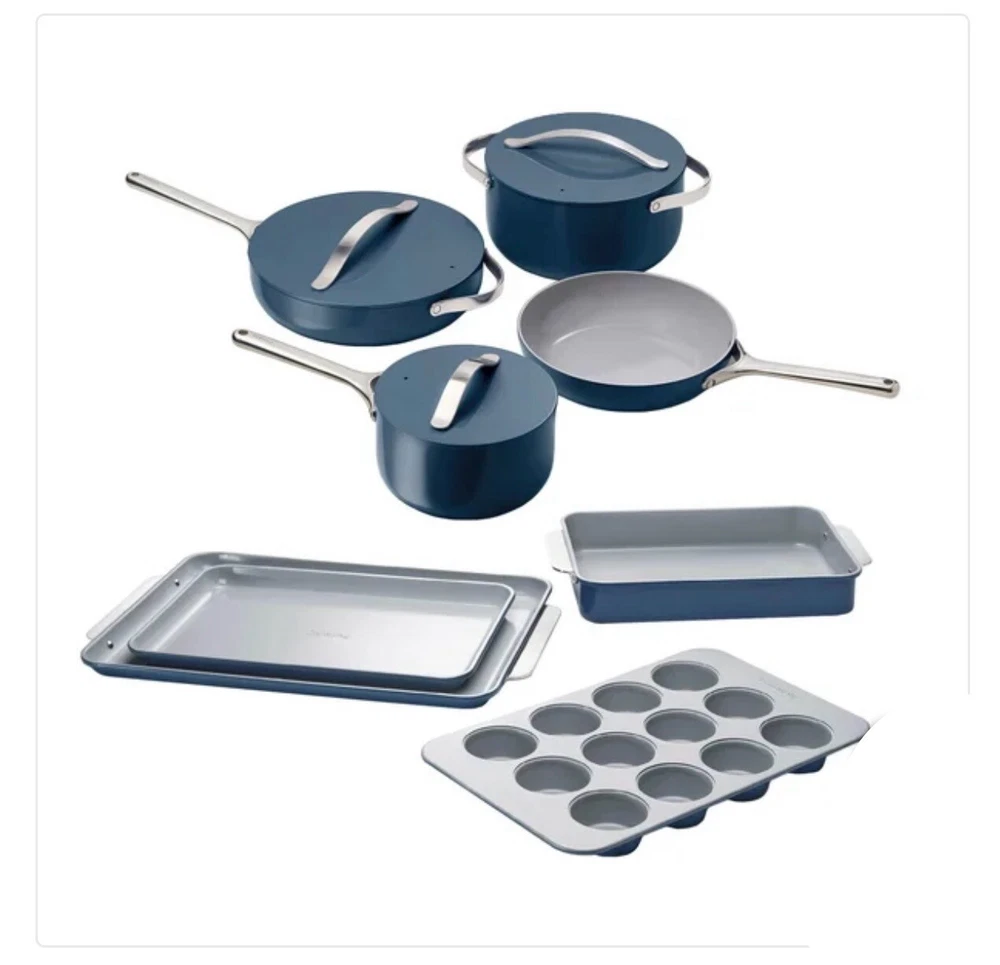 Caraway 11-piece Ceramic Non-Stick Cookware &Bakeware Set NOTE: THIS ITEM IS IN TWO SEPARATE BOXES, WILL BE SHIPPED SEPARATELY TO PREVENT DAMAGE- TRACKING INFORMATION WILL BE PROVIDED FOR BOTH BOXES NEW OPEN BOX, ONLY MISSING TRIVETS Includes: (1) 10.5” Skillet (1) 3qt Saucepan with Lid (1) 4.5qt Sauté Pan with Lid (1) 6.5qt Dutch Oven with Lid (1) Modular Cookware Rack (1) Canvas Lid Holder (1) 18” X 13” Baking Sheet (1) 10” X 15” Baking Sheet (1) 12 Cup Muffin Pan (1) 9” X 13” Rectangular Pan (1) Bakeware Storage Rack All items are inspected , if an item does not arrive to your satisfaction please do not hesitate to reach out to us. We are available 24/7. We do use recycled boxes 📦 to ship items. Thank you for your business! Don’t forget to look at our other listings O-A3