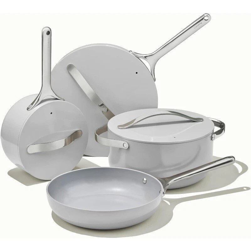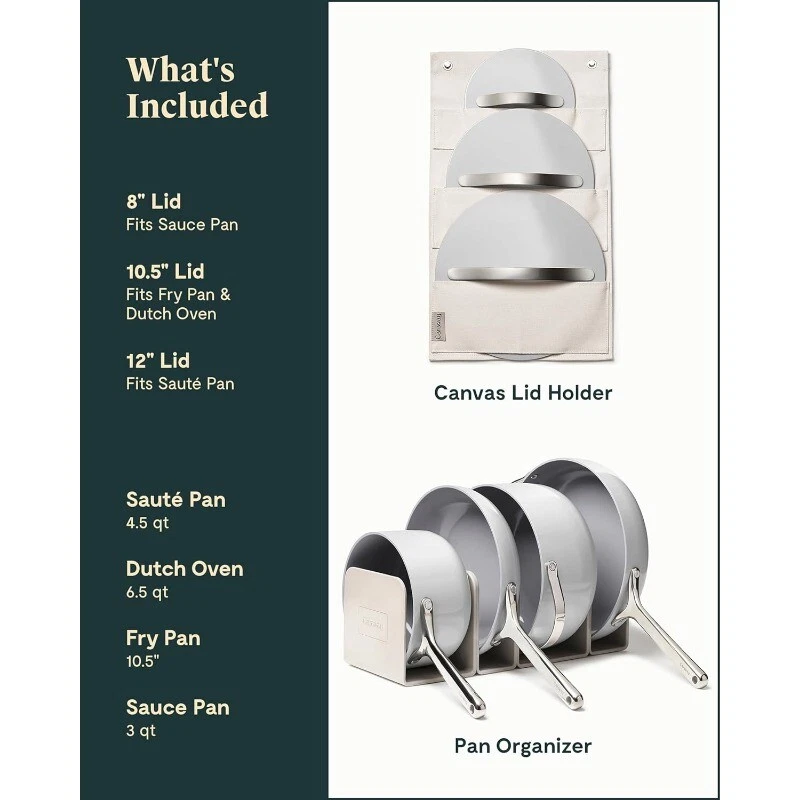 About this item CARAWAY NOW LIVE ON : It's official! We have launched our beautifully designed and consciously crafted kitchen cookware sets on for everyone to enjoy. It's time to step up your pots and pans game and spruce up your kitchen decor! NATURALLY NON-STICK: Our super slick non-stick pots and pans require less oil or butter for cooking and minimal scrubbing for a spotless clean, giving you a healthier and easy at home culinary experience. NON-TOXIC COATING: All Caraway pot and pan sets are free of PTFE, PFOA, PFAS, lead, cadmium and other toxic materials that can leach into your food, making them safe for you, your family, and the environment. SIMPLE CARE: Our cookware ais made for any kitchen and cooktop. Use them on low to medium heat and add a dash of oil or butter for an effortless glide. Our cookware is also oven-safe up to 550ºF. WHAT'S IN THE BOX: Included in this 12-piece cookware set is a 10.5" frying pan, 3 qt. sauce pan with lid, 6.5 qt. dutch oven with lid, 4.5 qt. sauté pan with lid, 4 modular magnetic pan racks and a canvas lid holder with hooks.