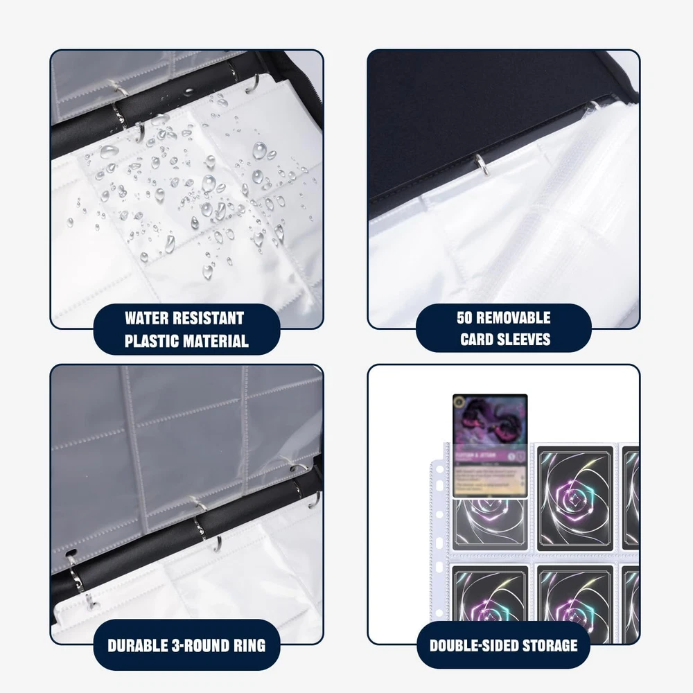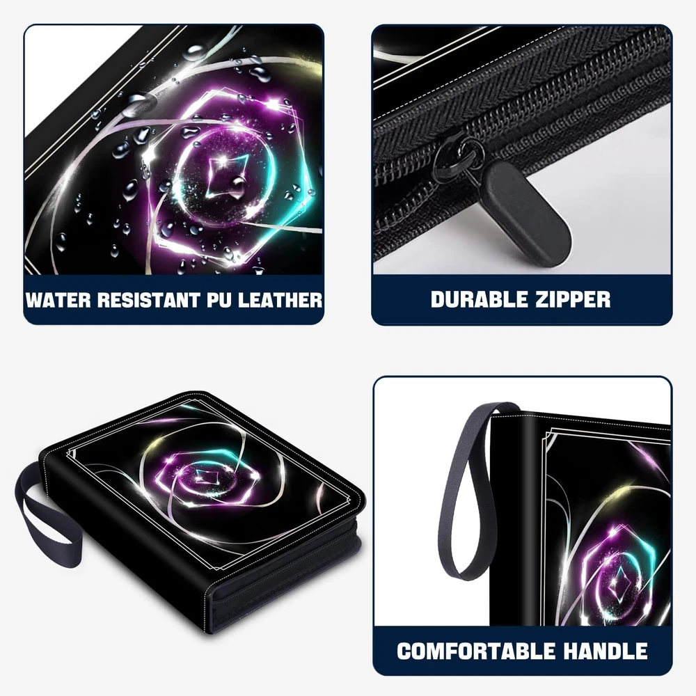 【An Ideal Gift with Fashion and Practicality】Specially designed for Lorcana card collectors, this trading card binder seamlessly integrates fashion with practicality, Whether it's a birthday gift or a holiday surprise for kids, it undoubtedly captures the hearts of card enthusiasts. 【High-Quality Materials for Comprehensive Protection】Made from premium PU material, this Lorcana card binder offers exceptional durability and partial water and oil resistance for your collection's safety, Transparent pockets enable easy browsing and cleaning without removing cards, while the sturdy zipper ensures cards and pages are securely fixed in place, providing comprehensive protection.