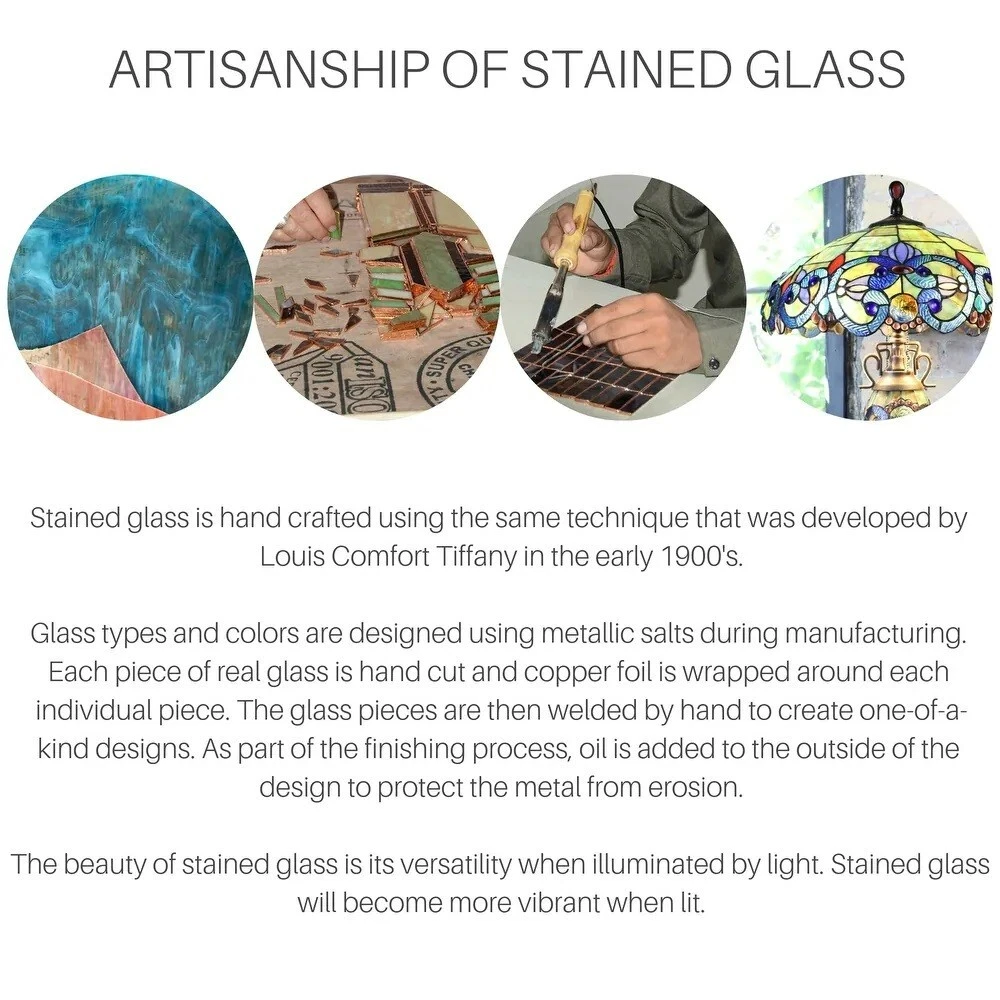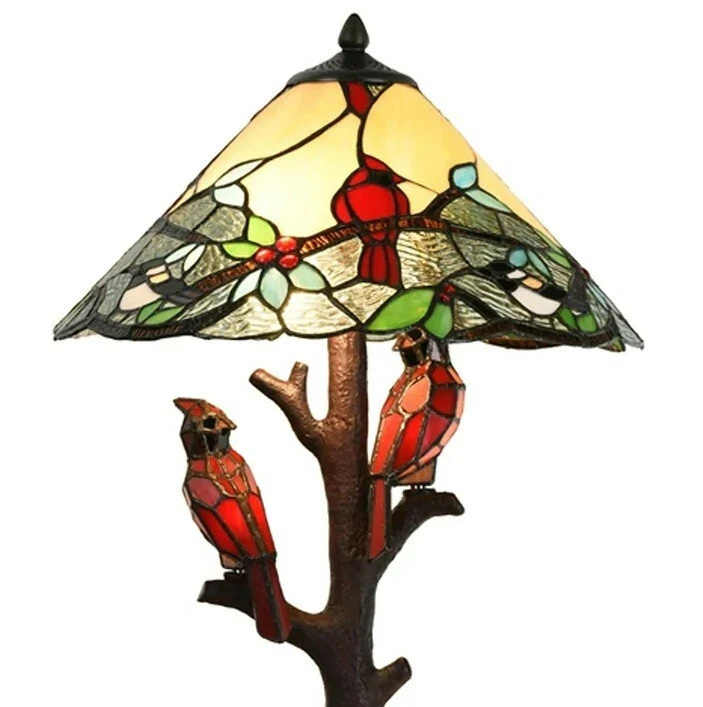 Details: An antique bronze finish makes this gorgeous stained glass, multicolored, Tiffany-styled construction a truly unique piece, and one you're sure to treasure for years on end. With two cute little birds adorning its natural-looking stem base, its hand-cut and glass crystal adornments offer the perfect pop of sparkly sheen. Features: Crafted of metal and multicolored art glass Requires two 60-watt light bulbs (not included) and two 1.8-watt light bulbs (included) 400 pieces of hand-cut stained art glass for Tiffany-style look 28 glass crystal cabochon accents Soldered together via copper foil Push-button switch 60-inch power cord Weighs 9.4 lbs. Dimensions: 16 inches in diameter x 23.75 inches tall Specifications: Assembled Dimensions 16 in. W X 16 in. L X 16 in. D X 23.75 in. H Style Tiffany, Traditional Finish Bronze Shade Material Glass Switch Type Push Button Switch Base Material Resin Base Shape Novelty Color Multi Color Temperature Selectable Exact Bulb Wattage 60 Finish Enhancements Antiqued Lamp Height 21 to 24 Inches Light Bulb Type Incandescent Light Direction Downlight Shade Shape Cone Table Lamp Type Standard Country of Origin: China Ships to the lower 48 states only. No local pickup. Returns accepted for 30 days.