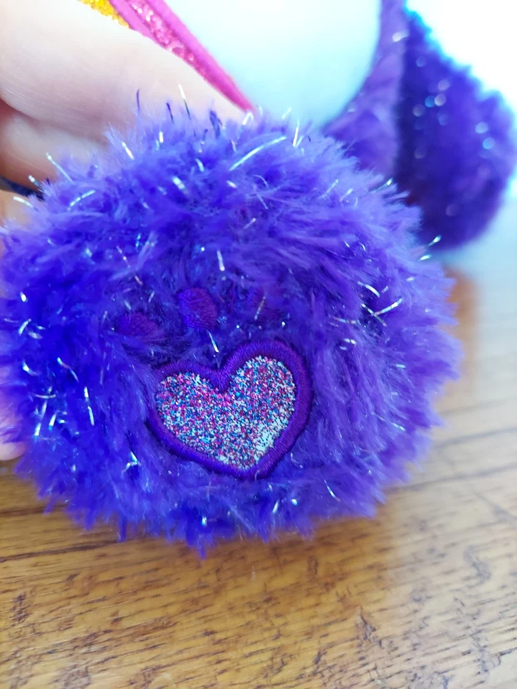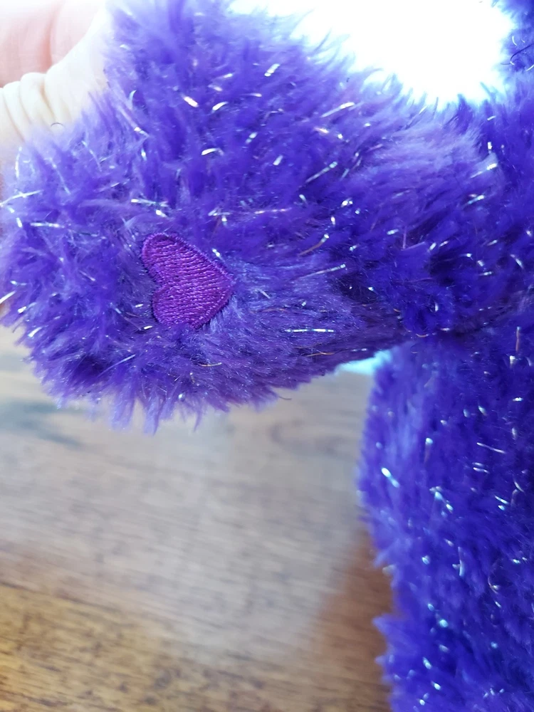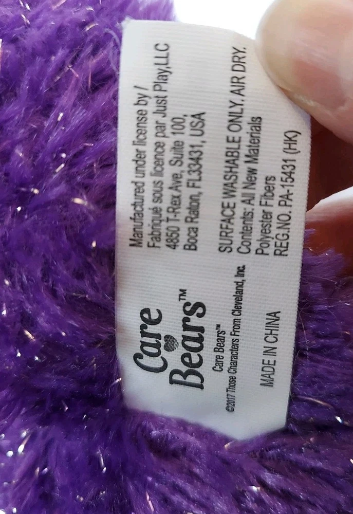 This is a 13-inch plush Care Bears Rainbow Heart bear from the 35th Anniversary collection. It features a purple sparkle design, manufactured in 2017 in China. With a contemporary age range, this adorable bear is part of the Care Bears brand and recommended for ages 2 and up.