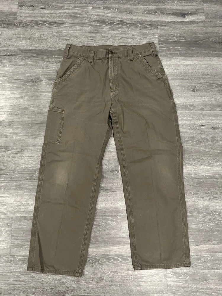 Elevate your workwear game with these Carhartt Carpenter pants. Made of a durable cotton blend, these pants feature a flat front and straight leg style with multiple pockets, including cargo, slash, and coin pockets. The pants are also belted and have a high rise for added comfort and support. These pants are perfect for any occasion, whether it's travel, casual, formal, or even for workwear. They come in a solid green color and are machine washable for easy care. The pants are also lightweight, breathable, and water-resistant, making them suitable for all seasons. With accents such as buttons, zippers, and the Carhartt logo, these pants are sure to be a fashion statement. FLAWLESS ALL SALES FINAL NO RETURNS