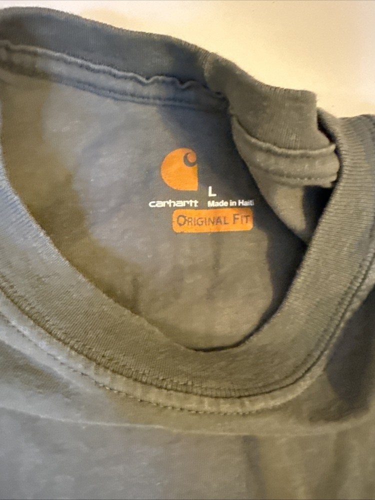 The Carhartt K87 Loose Fit Pocket T-Shirt in Charcoal Gray, size Large, is a classic and durable option for men's clothing. Made of soft cotton knit fabric with a crew neck and short sleeves, this T-shirt is perfect for outdoor activities in the summer, fall, and spring. The solid gray color and Carhartt branding add a stylish touch, while the inclusion of pockets adds functionality. Machine washable and featuring a regular fit, this T-shirt is a versatile and comfortable choice for everyday wear.