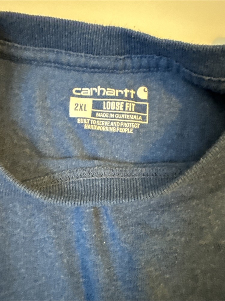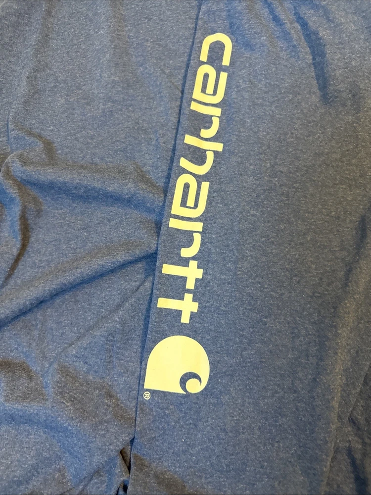 The Carhartt Long Sleeve Graphic T-Shirt in blue with the brand logo on the sleeve is a durable and stylish piece of workwear for men in size XL. Made from cotton, this t-shirt features a solid pattern, crew neck, and is machine washable. Perfect for winter, fall, and spring seasons, it also has pockets for added convenience. With a regular fit and long sleeves, this t-shirt is a versatile and comfortable option for everyday wear.