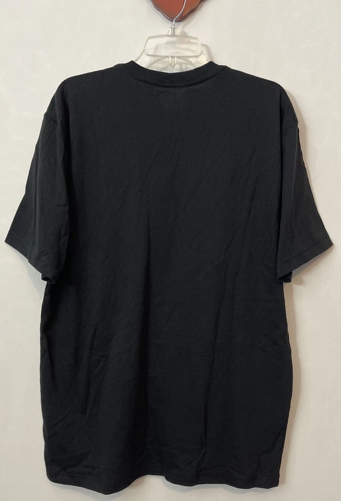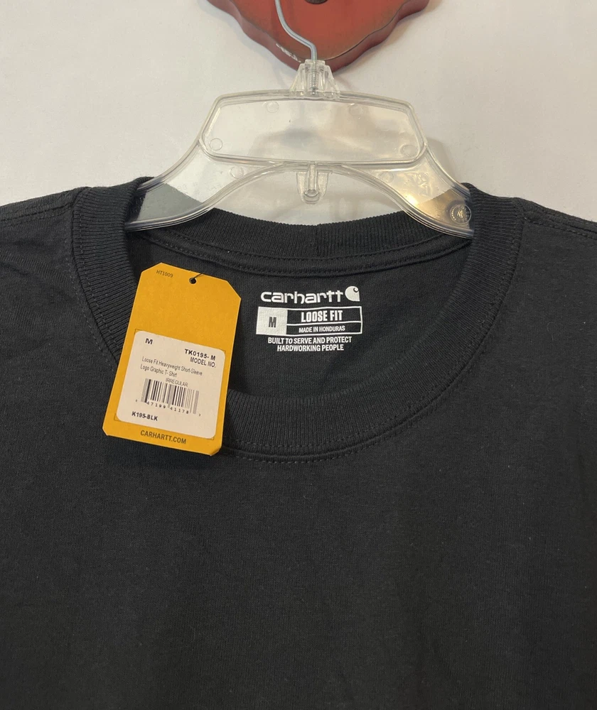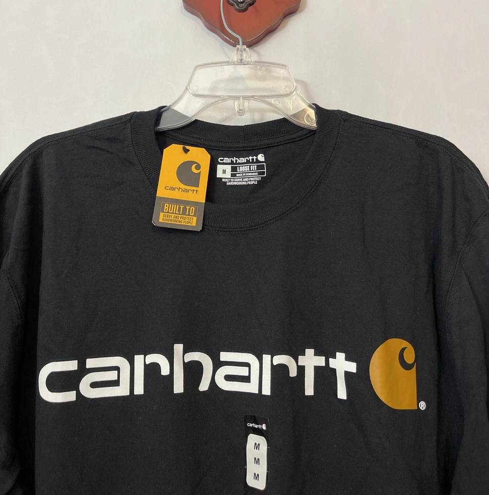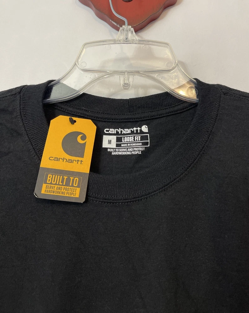 This Carhartt men's t-shirt in size medium is perfect for any outdoor or classic theme. Made of heavyweight cotton material, this shirt is built to last and provide comfort in all seasons. The relaxed fit and collarless design make it a versatile addition to any wardrobe. Featuring a solid black color with the Carhartt logo on the front, this t-shirt is both stylish and functional. The short sleeve and crew neck design make it a great choice for casual wear. Whether you're heading out for a hike or just running errands, this shirt is sure to become a favorite. Length: 31 inches. Chest: 22 inches across laying flat.