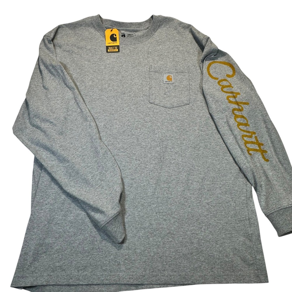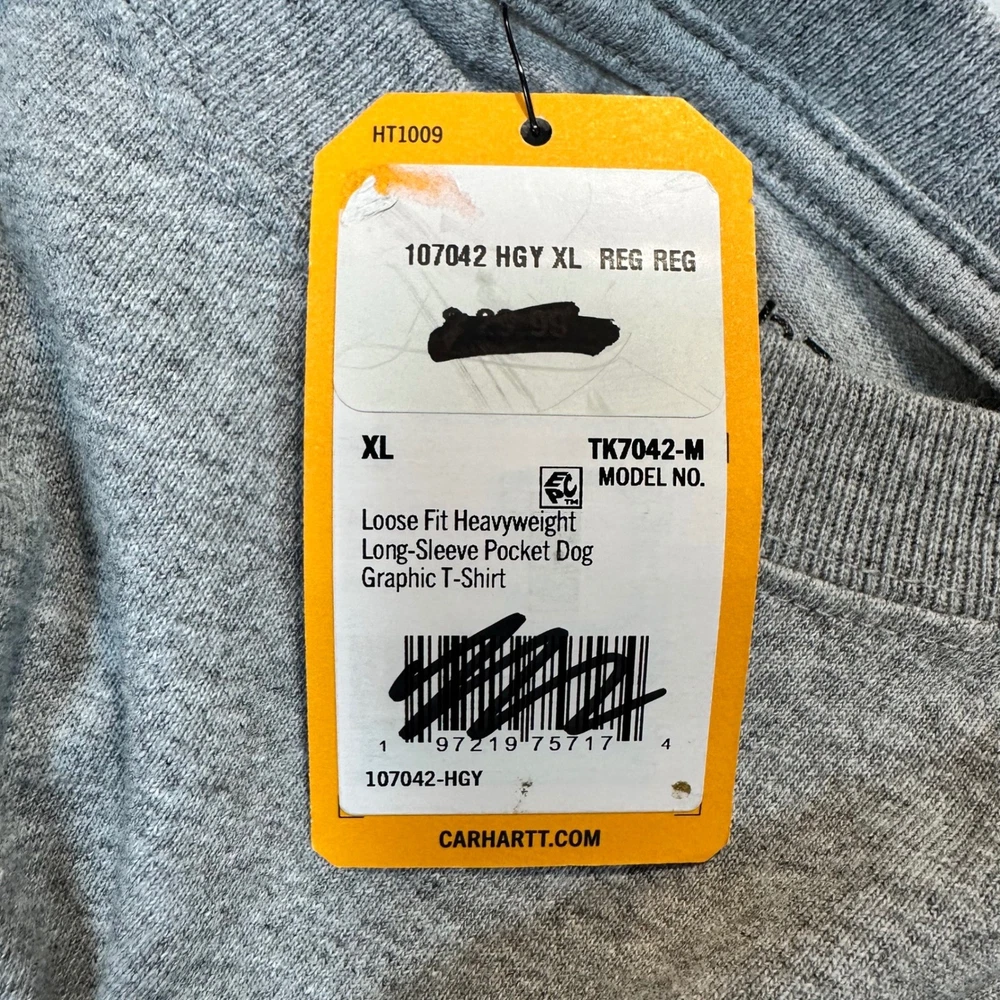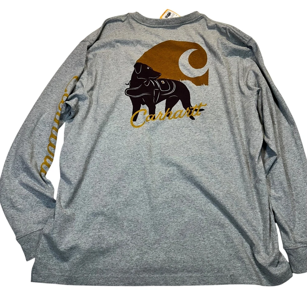 Carhartt Loose Fit Heavyweight Long-Sleeve Pocket Dog Graphic T-Shirt in Heather Gray. This durable cotton-blend tee features a functional chest pocket with the classic sewn-on label and a large graphic on the back depicting a dog in a Carhartt vest against the iconic logo. The left sleeve is finished with a bold script logo for a signature look. Designed with a loose fit for comfort and a tagless neck label to prevent irritation. Measurements: • Pit to Pit: 26" • Length: 31" • Sleeve Length: 27"