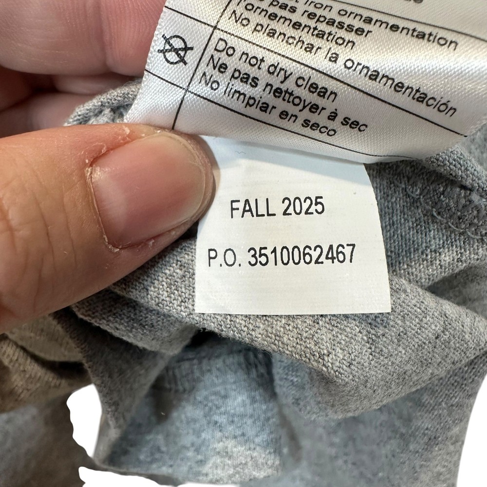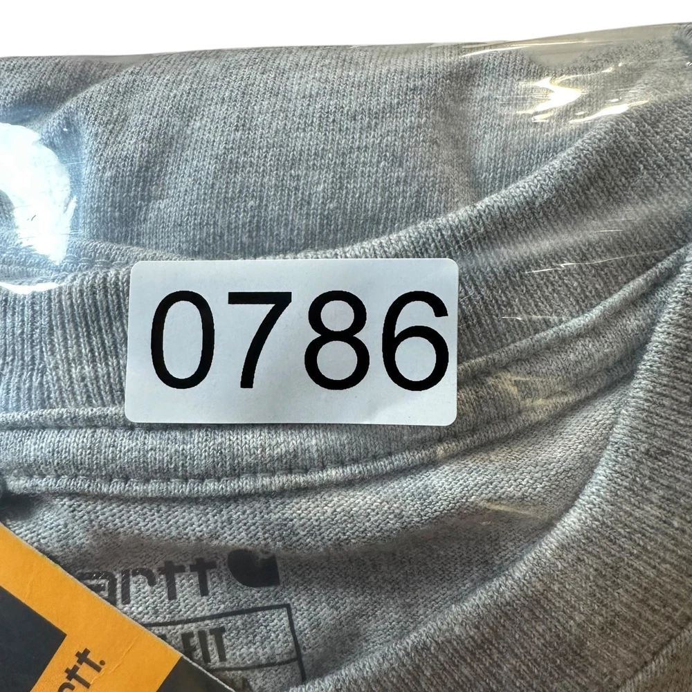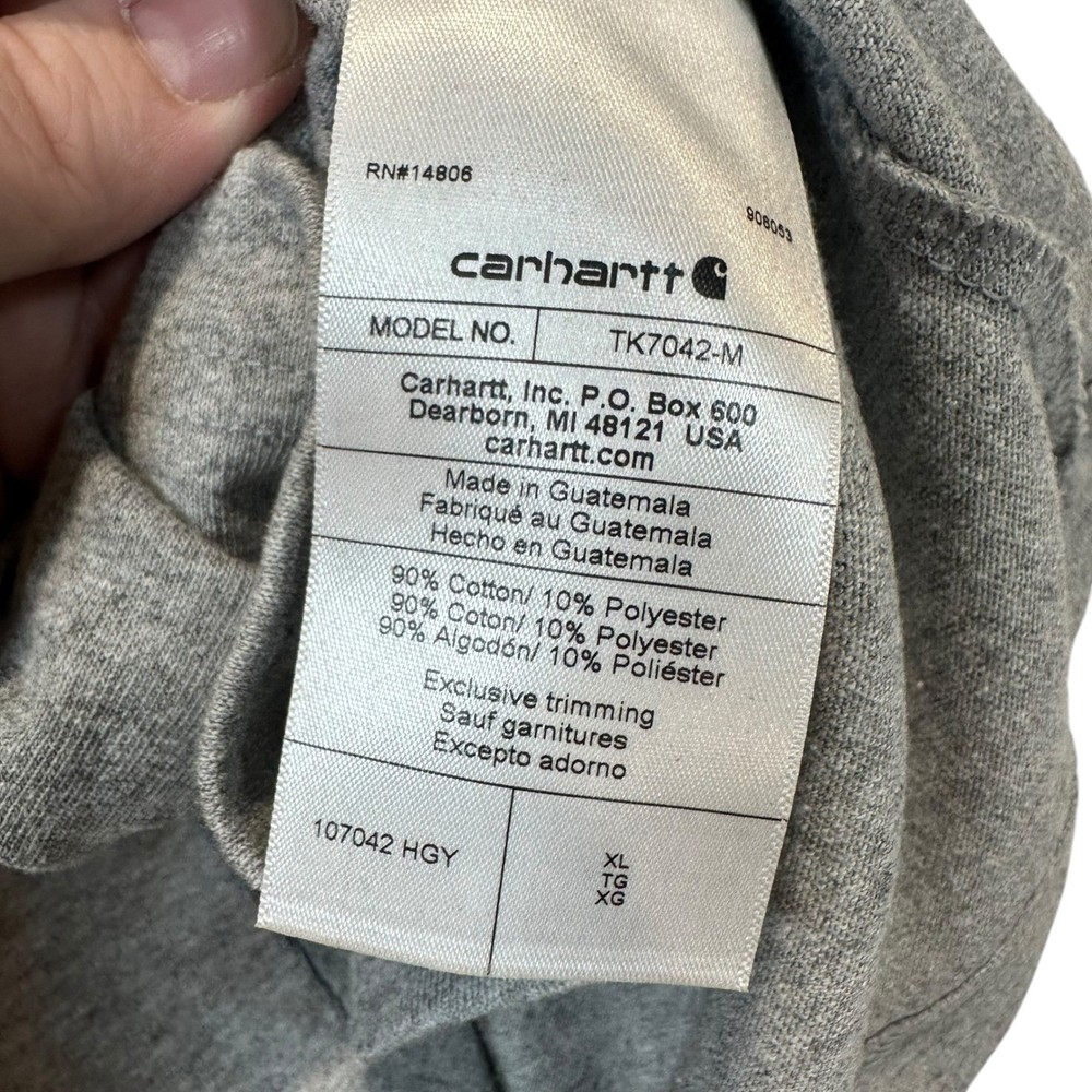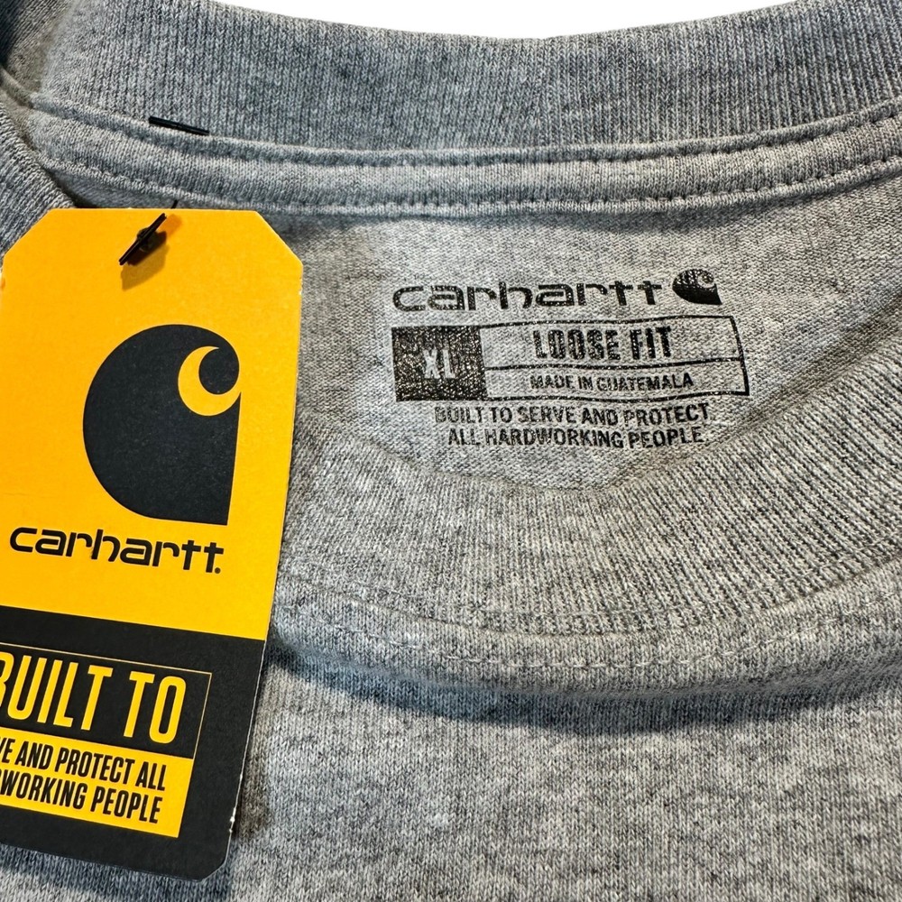 Carhartt Loose Fit Heavyweight Long-Sleeve Pocket Dog Graphic T-Shirt in Heather Gray. This durable cotton-blend tee features a functional chest pocket with the classic sewn-on label and a large graphic on the back depicting a dog in a Carhartt vest against the iconic logo. The left sleeve is finished with a bold script logo for a signature look. Designed with a loose fit for comfort and a tagless neck label to prevent irritation. Measurements: • Pit to Pit: 26" • Length: 31" • Sleeve Length: 27"