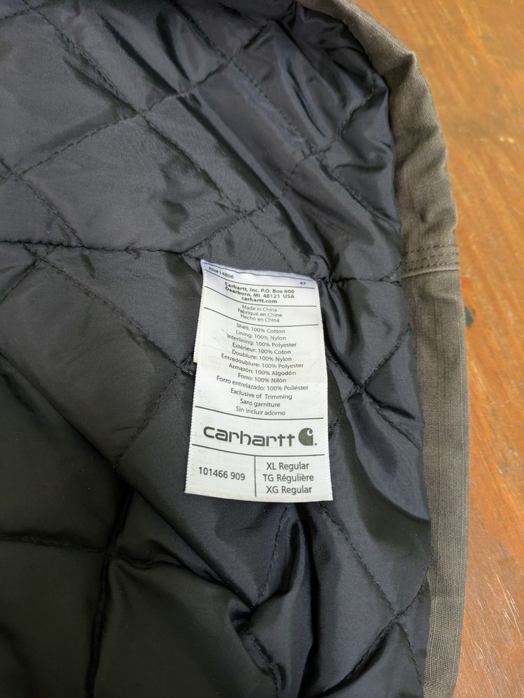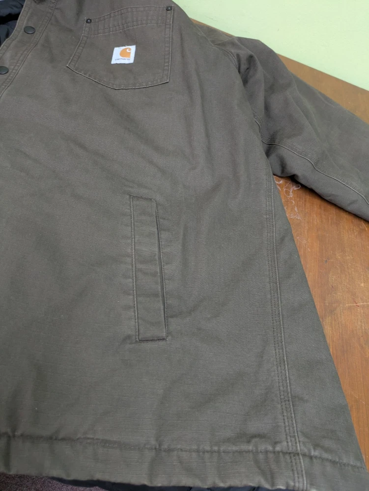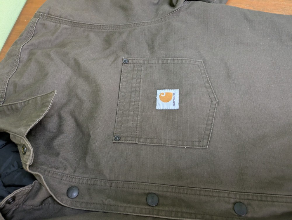 The Carhartt 101466 909 Chatfield Quilted Lined Men's Jacket in Brown is a stylish and functional bomber jacket designed for men. Made with a durable cotton outer shell and insulated with polyester, this jacket provides warmth and comfort during cold weather. The nylon lining adds an extra layer of coziness, while the ripstop fabric ensures durability. With a regular fit and size XL, this jacket is perfect for everyday wear. In very good pre-owned condition with some signs of wear. Please see pictures for the cosmetic condition and dimensions.