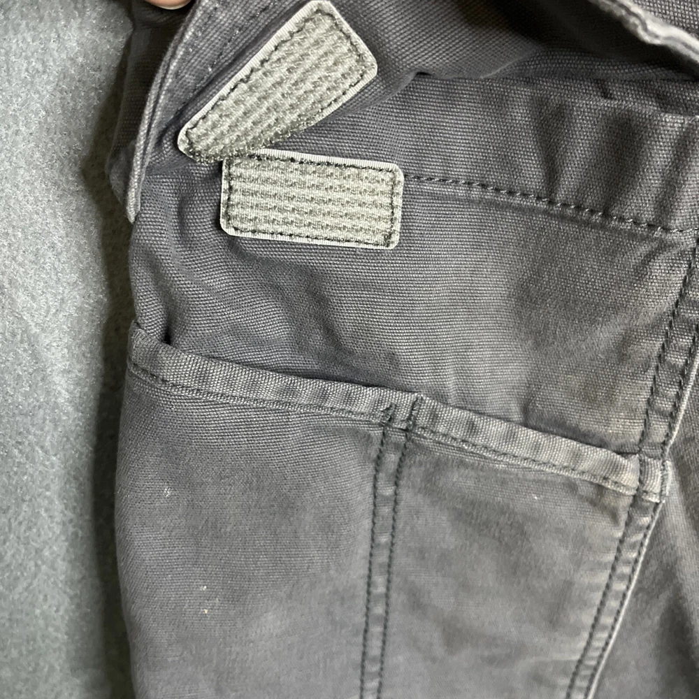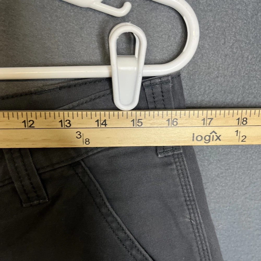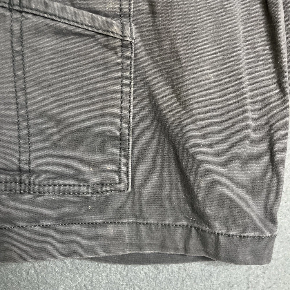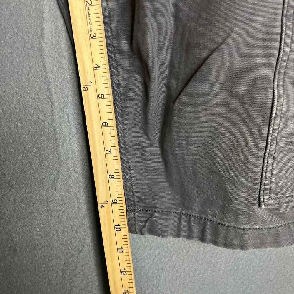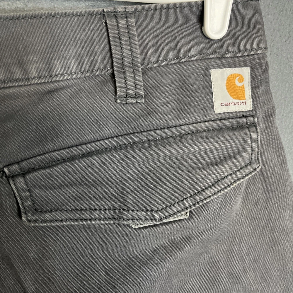 These Carhartt Rugged Cargo Shorts are designed for both casual and workwear occasions. They feature a relaxed fit, a mid-rise style with a 10-inch inseam, and a waist size of 33 inches. Made from a durable cotton blend fabric with a touch of spandex for added comfort, these gray shorts have a flat front design with a zip closure and button accents. The cargo pockets provide extra storage space, making them practical for outdoor activities. The Carhartt logo adds a touch of branding to these versatile and machine washable shorts.