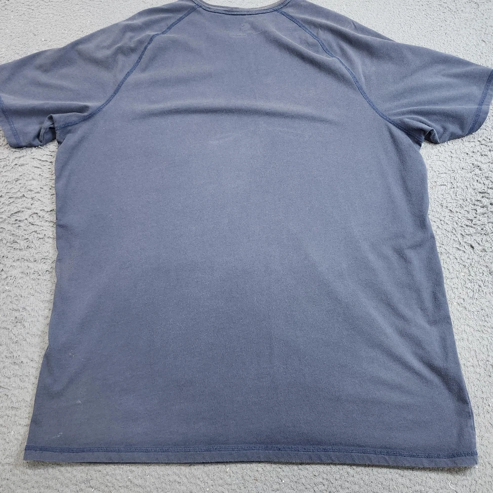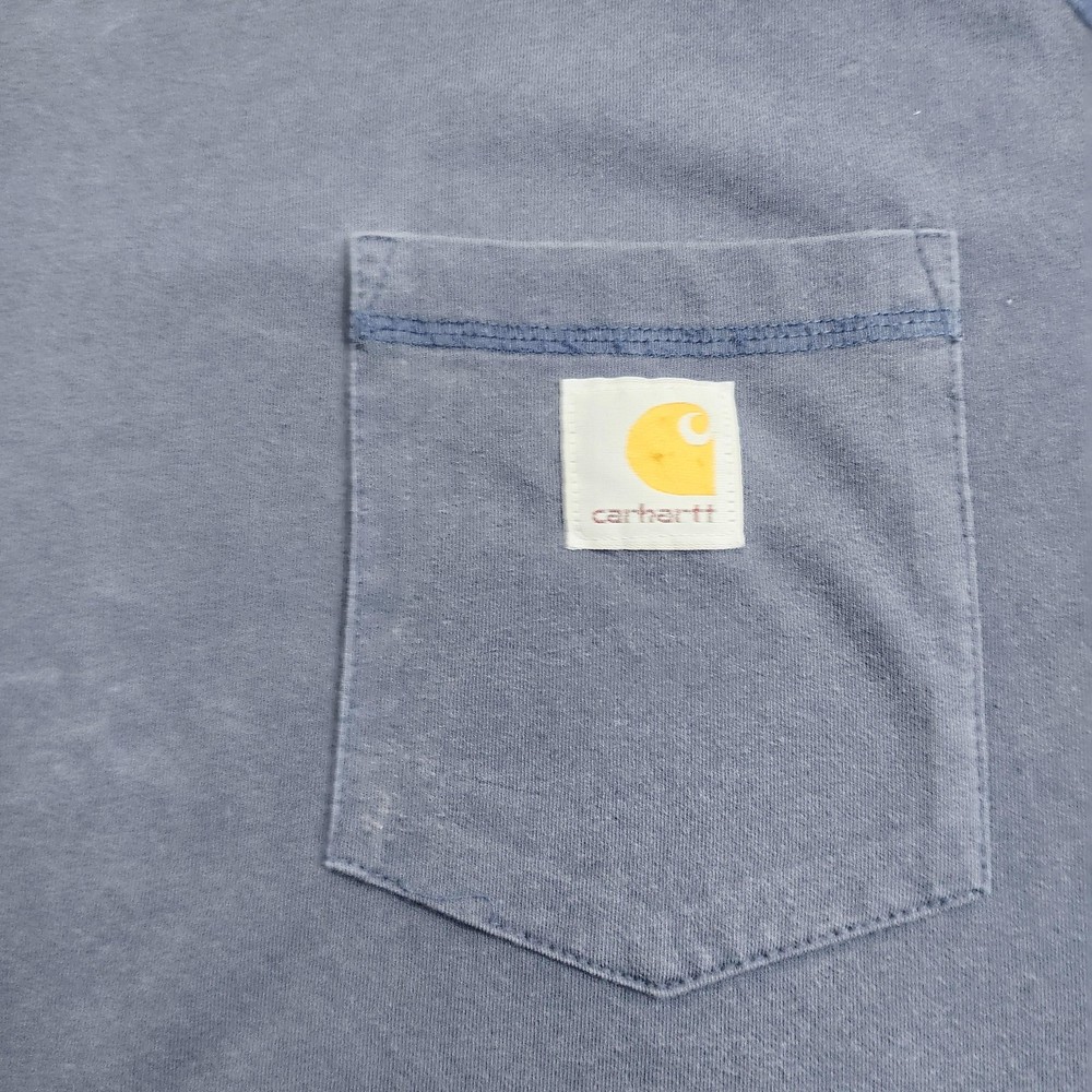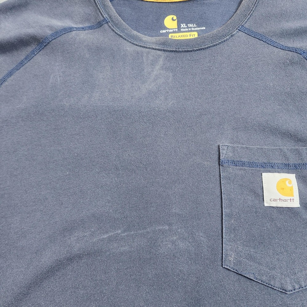 Brand: Carhartt. Style: Mens short sleeve crew neck pocket T-shirt with a relaxed fit workwear design. Color: Solid blue body with tonal stitching and contrasting yellow printed neck graphics. Size: Mens XLT (XL Tall), as indicated on the interior printed neck label. Material: Soft jersey knit fabric; full fiber content and care instructions are listed on the inner care label. Country of origin: Made in Guatemala, according to the interior neck print. Product details: Classic Carhartt work T-shirt designed for everyday jobsite or casual wear, offering a relaxed fit through the chest and torso with extra length for tall sizing. Branding and labels: Tagless printed Carhartt neck graphic featuring the C logo, size XL Tall, Made in Guatemala text, and RELAXED FIT bar, plus a small woven Carhartt logo patch on the left chest pocket. Front design: Ribbed crew neckline with contrast yellow inner neck tape, raglan short sleeves, single left chest patch pocket with logo label, and straight hem. Back design: Solid blue back panel made from the same jersey knit fabric with no additional graphics or text. Fit and silhouette: Relaxed fit mens silhouette intended to sit at the hip with comfortable ease through the shoulders and torso and added body length for tall proportions. Features: Short raglan sleeves, crew neck, tagless printed neck label, single chest pocket with Carhartt logo patch, solid blue jersey knit construction, and relaxed fit XL Tall sizing. Season and use: Ideal for summer and warm-weather wear on its own or layered under sweatshirts and jackets in cooler seasons, suitable for workwear, outdoor activities, or casual everyday outfits. Additional details: Shirt is photographed laid flat against a neutral textured background with a wooden measuring ruler visible in some images for general size reference, and it is stored inside a clear poly bag with a removable inventory sticker labeled 7557 for organizational purposes.