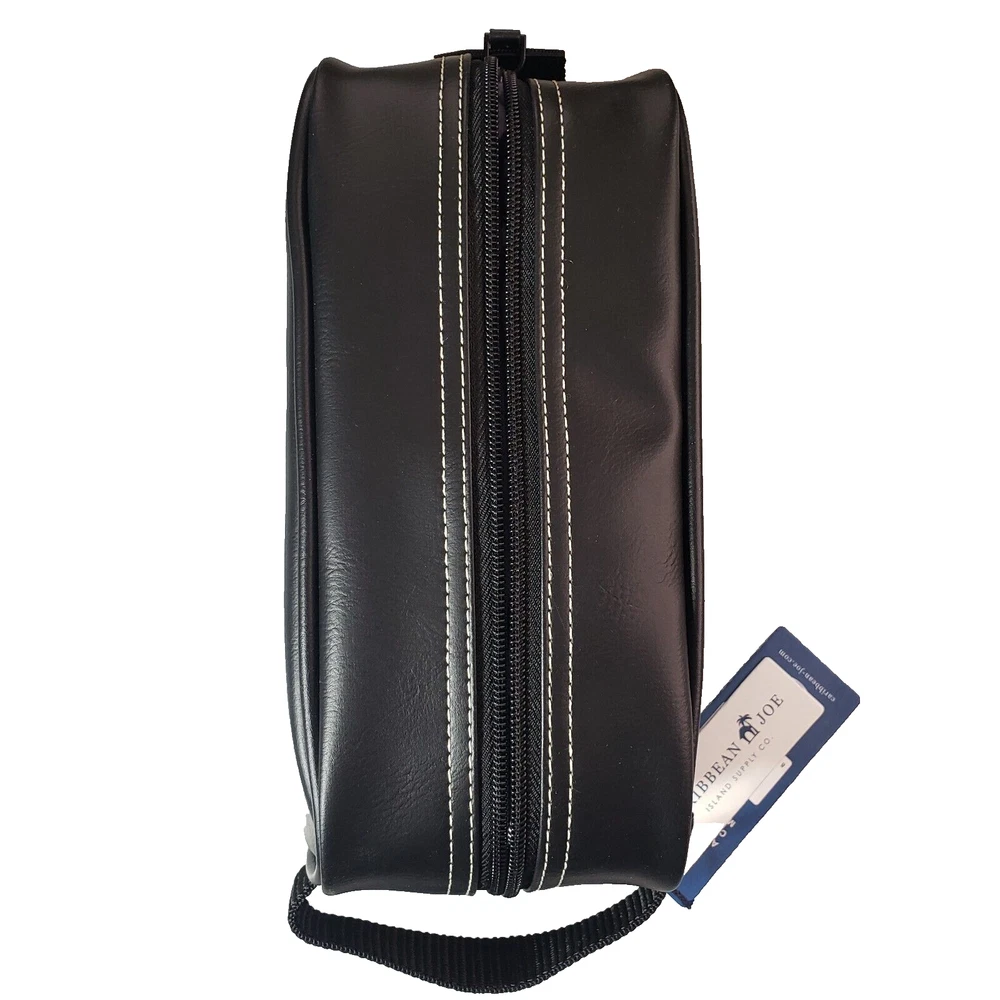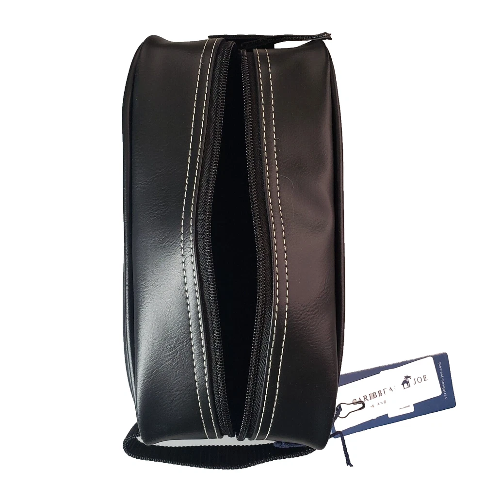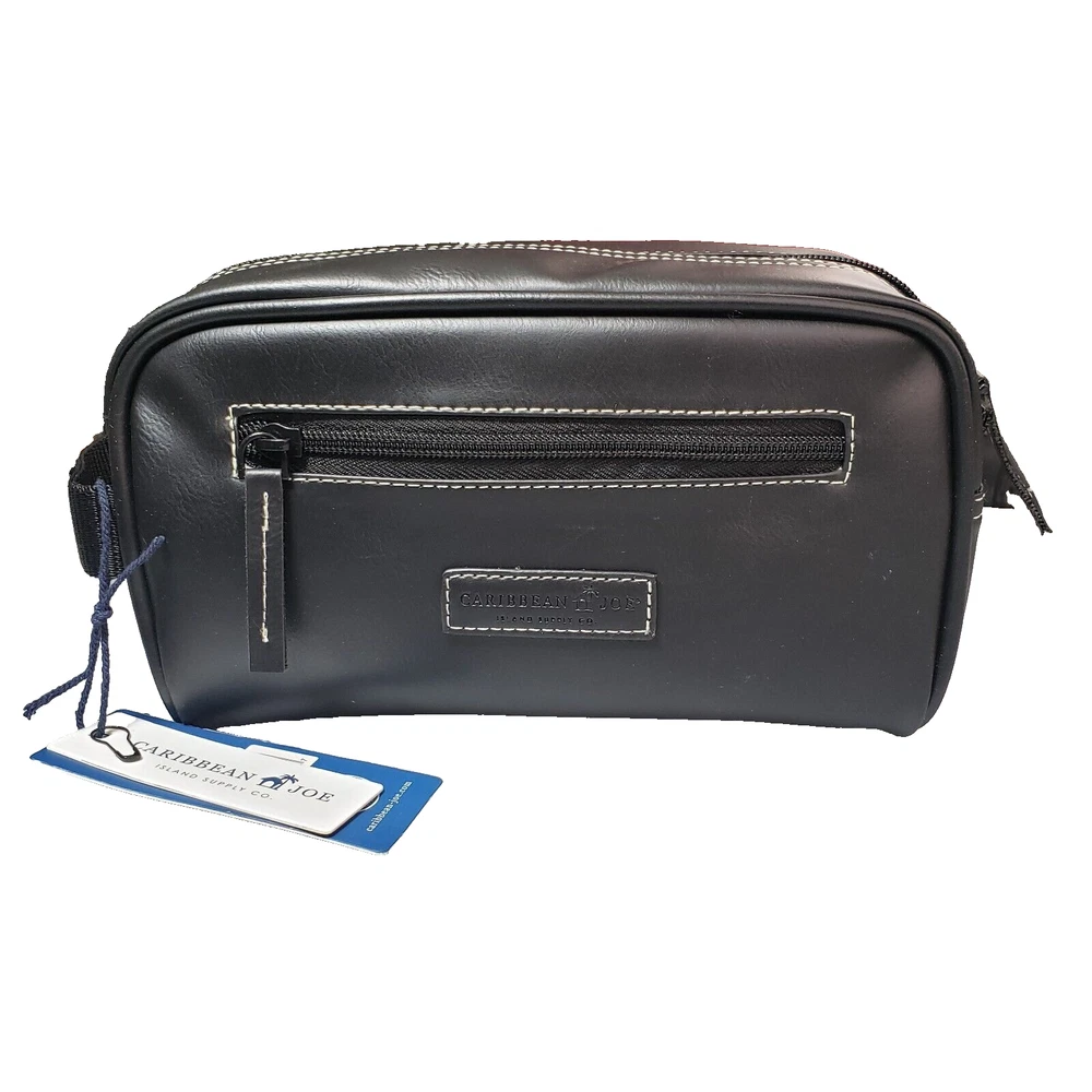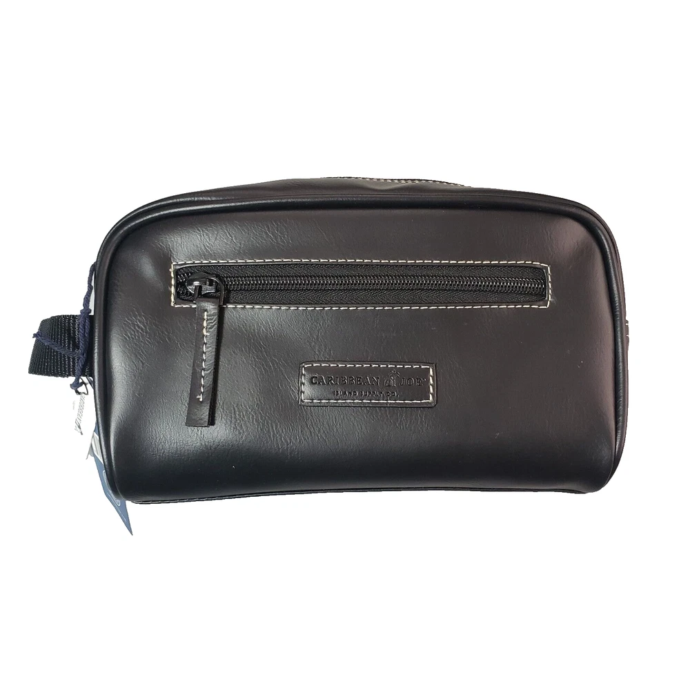 This Caribbean Joe unisex shaving kit is perfect for the traveling man or woman. Front and Main Zip closure and a top handle. The bag has an inside zipper compartment for convenient storage and is made of faux leather and man-made materials The polyester lining ensures a soft touch, and the faux leather material adds a touch of luxury. Measures approx. 8 3/4 inches long, 6 inches high and 4 1/4 wide. Beautiful Black Color Top Zipper main compartment Caribbean Joe logo on front of bag. Retail tag MSRP $35.00