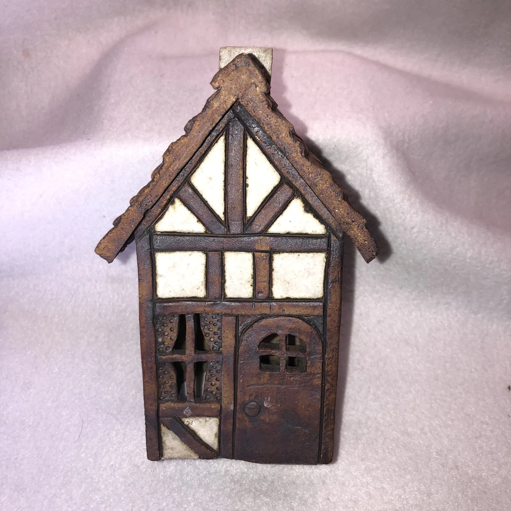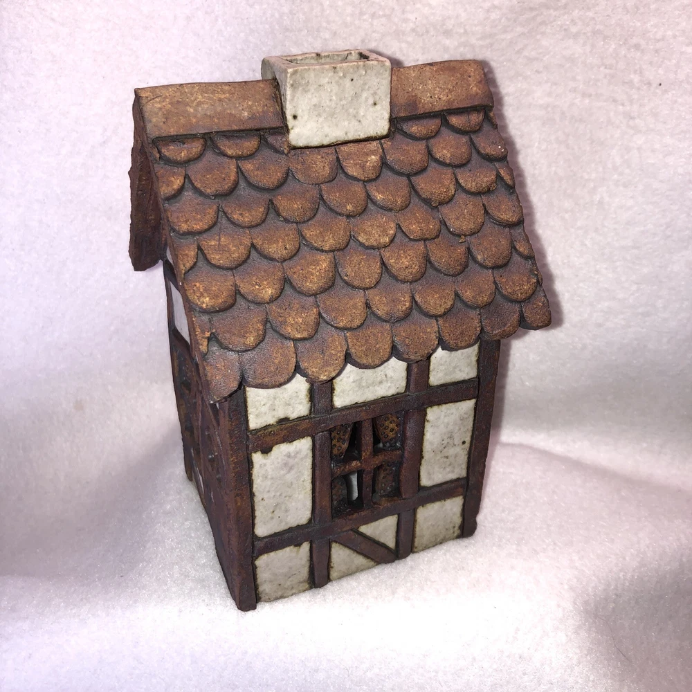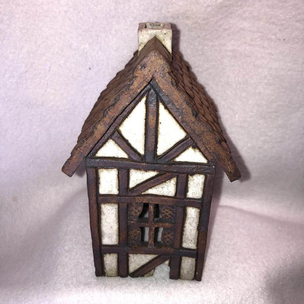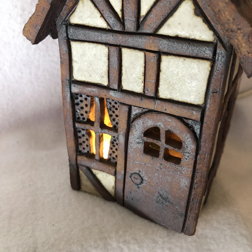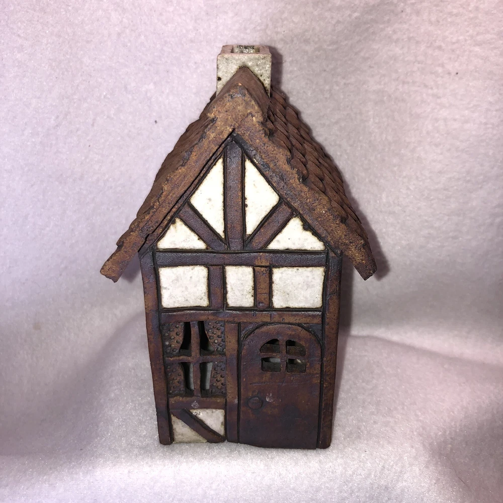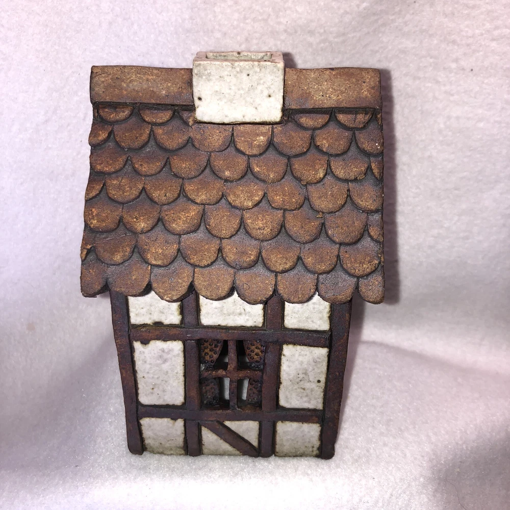 This is a sweet little stoneware pottery house from the artist Carla Shurtliff Jimison (originally from Mt Pleasant Michigan, now a professor at Brigham Young University-Idaho). The artist has confirmed this was a piece she created sometime between 1978 and 1981 as a night light. In an email, she details the process stating the houses (there were originally 4 different styles) were "made of a high fire stoneware and glazed with iron oxide and an off white glaze". Originally they did come with an electrical cord with a light bulb so they could light up. Cord/Light bulb are NOT included. You could use a cord/light bulb or possibly a battery operated tea lite. Could even use in a fairy garden. It has a rustic finish and is done in an English Tudor style. It stands approximately 6 1/4 inches tall, 3 3/4 inches long and is about 3 7/8 inches wide. It weighs about 1 pound 5 ounces. House is in good vintage pre-owned condition. I did not find any nicks, chips, cracks or repairs. Please review and enlarge all photos for additional details, views and measurements. Shipped via USPS Ground Advantage.