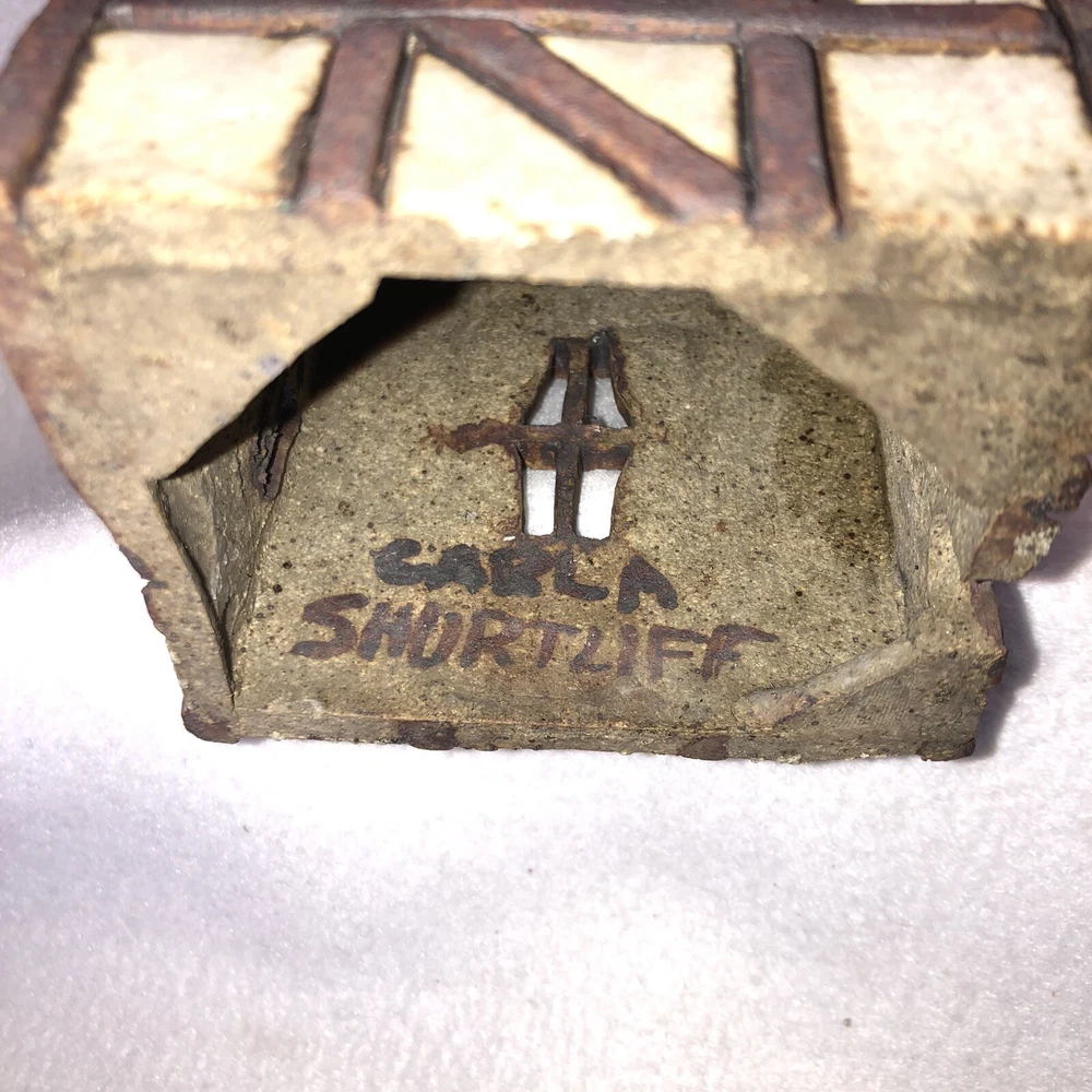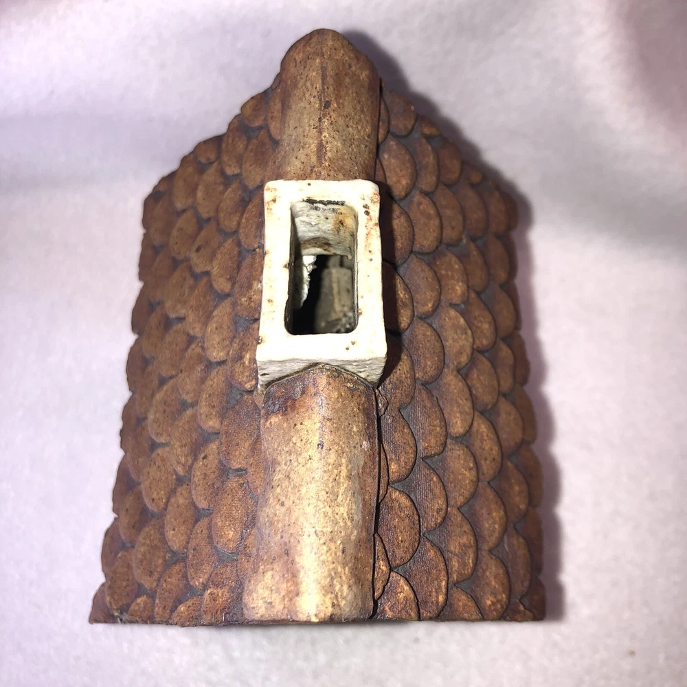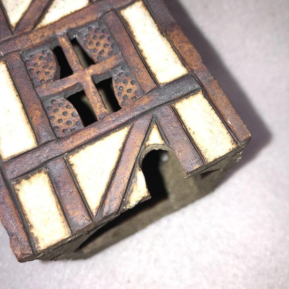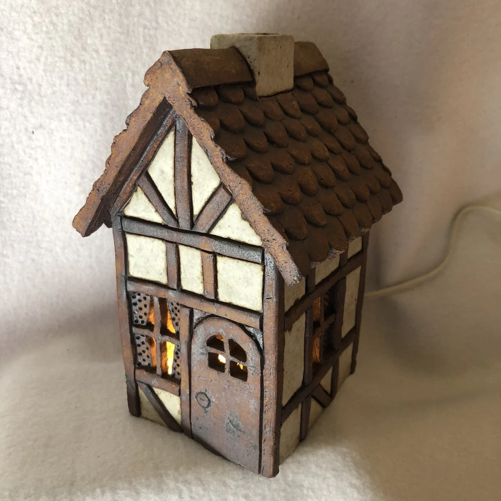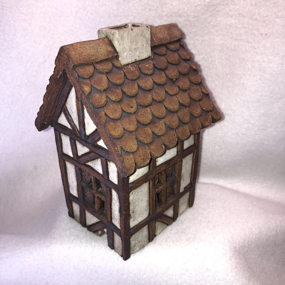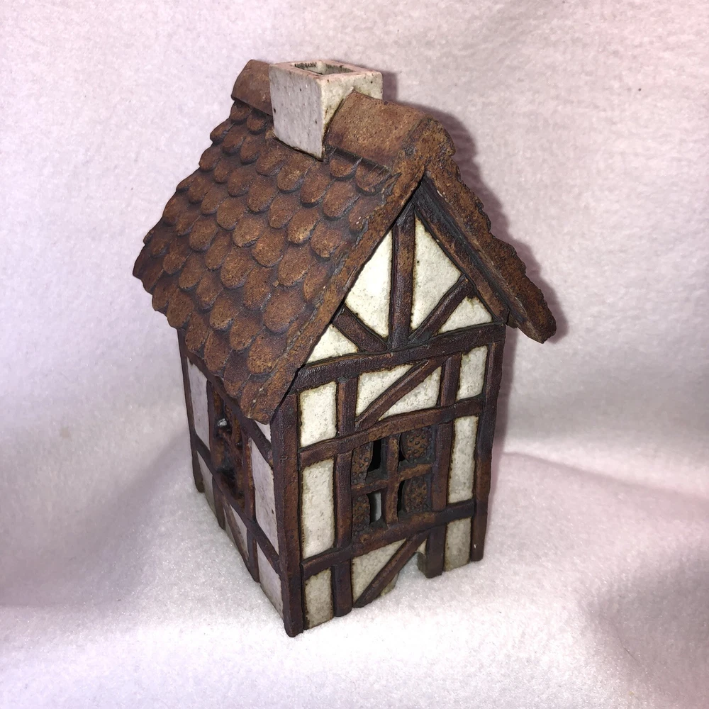 This is a sweet little stoneware pottery house from the artist Carla Shurtliff Jimison (originally from Mt Pleasant Michigan, now a professor at Brigham Young University-Idaho). The artist has confirmed this was a piece she created sometime between 1978 and 1981 as a night light. In an email, she details the process stating the houses (there were originally 4 different styles) were "made of a high fire stoneware and glazed with iron oxide and an off white glaze". Originally they did come with an electrical cord with a light bulb so they could light up. Cord/Light bulb are NOT included. You could use a cord/light bulb or possibly a battery operated tea lite. Could even use in a fairy garden. It has a rustic finish and is done in an English Tudor style. It stands approximately 6 1/4 inches tall, 3 3/4 inches long and is about 3 7/8 inches wide. It weighs about 1 pound 5 ounces. House is in good vintage pre-owned condition. I did not find any nicks, chips, cracks or repairs. Please review and enlarge all photos for additional details, views and measurements. Shipped via USPS Ground Advantage.